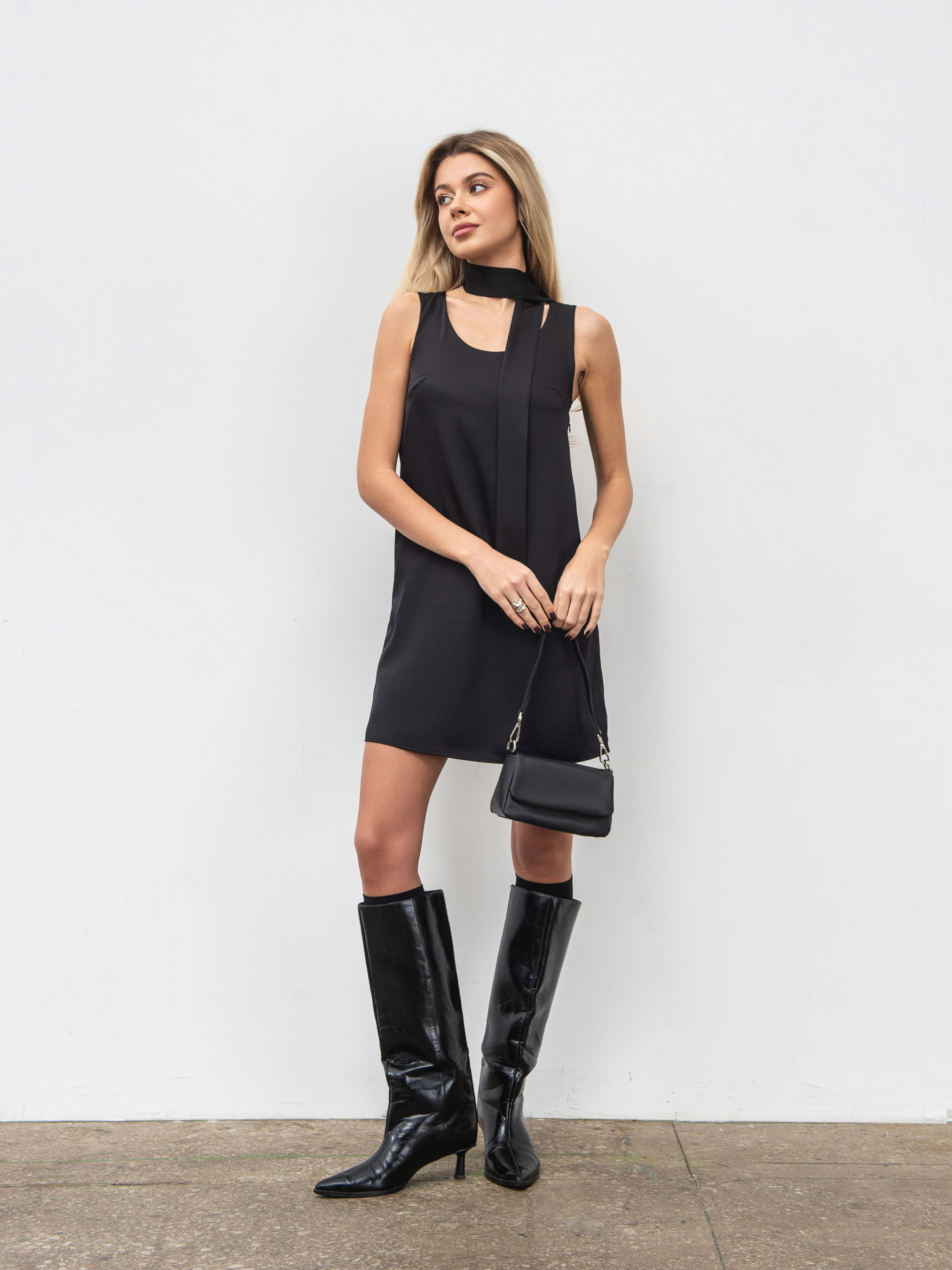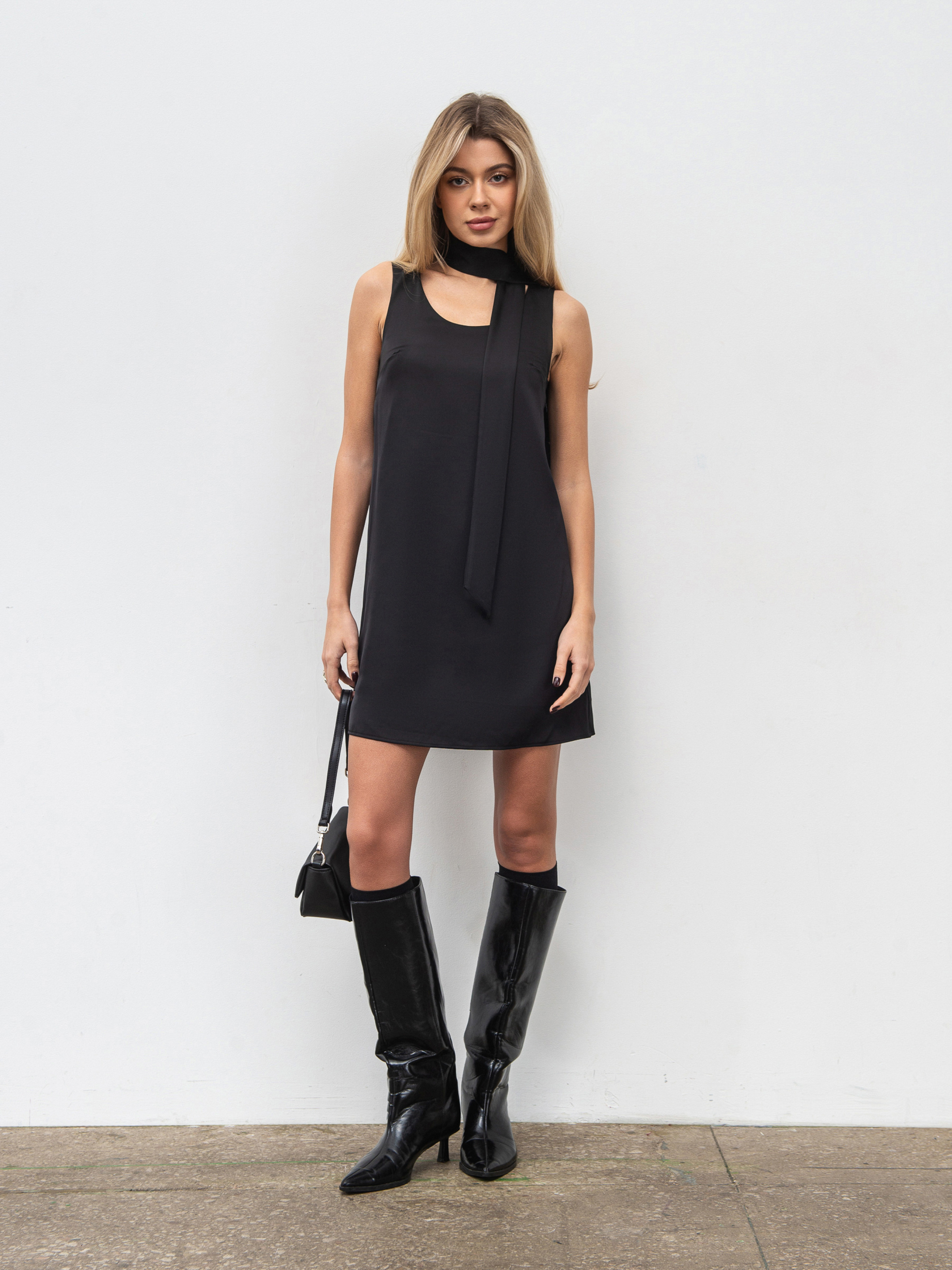 Легкое сатиновое платье трапециевидного фасона с шарфом-галстуком в комплекте элегантный вариант для праздничных и повседневных выходов. Выполнено из качественного сатина (80% полиэстер, 20% вискоза) с подкладкой из натурального батиста (100% хлопок) для максимального комфорта. Модель имеет потайную молнию сбоку, мягко ложится по фигуре и создает лаконичный силуэт с деликатным блеском ткани. Идеально подходит для сочетания как с каблуками, так и с базовыми аксессуарами. Доступные цвета: черный, бордо.