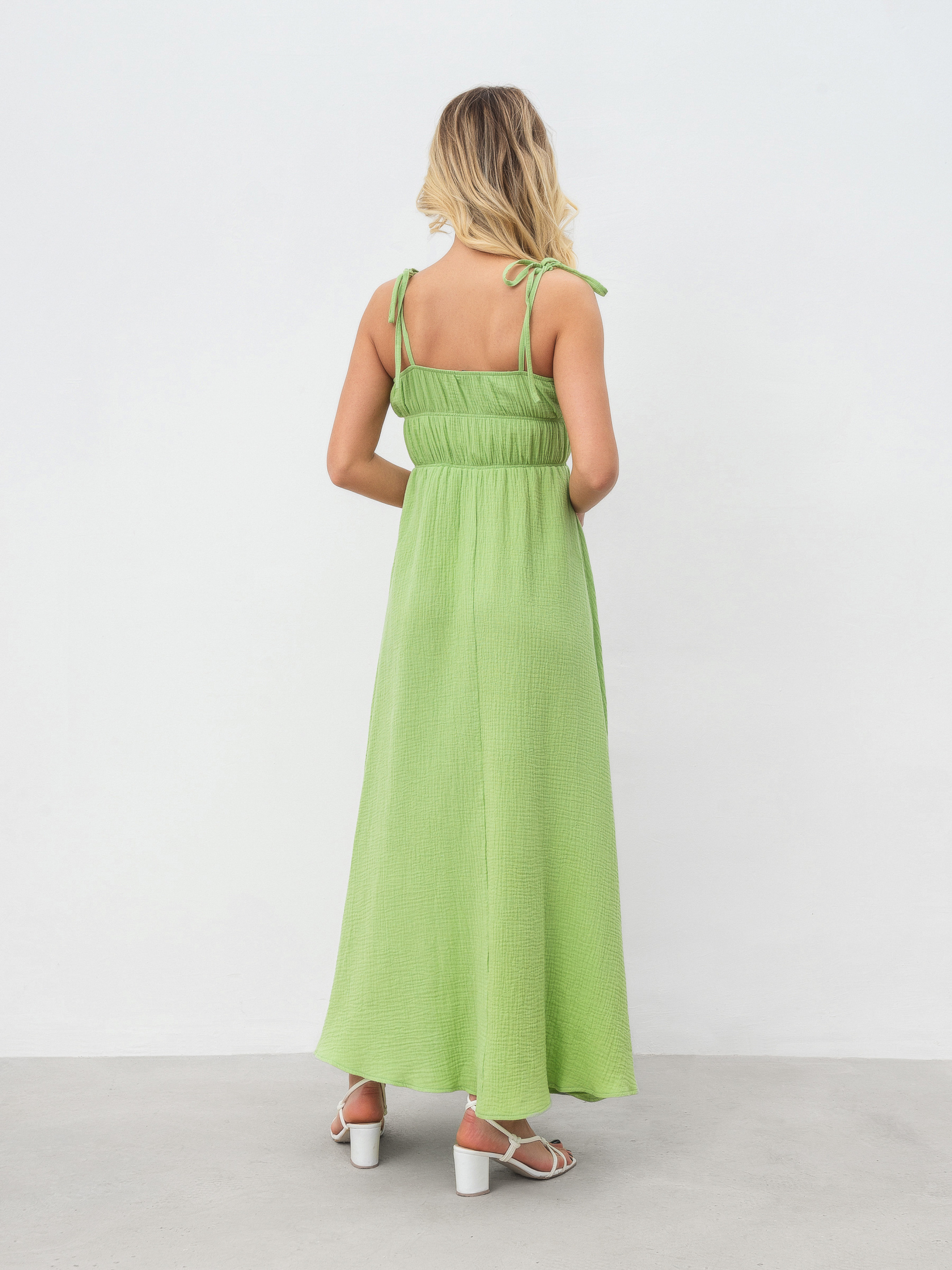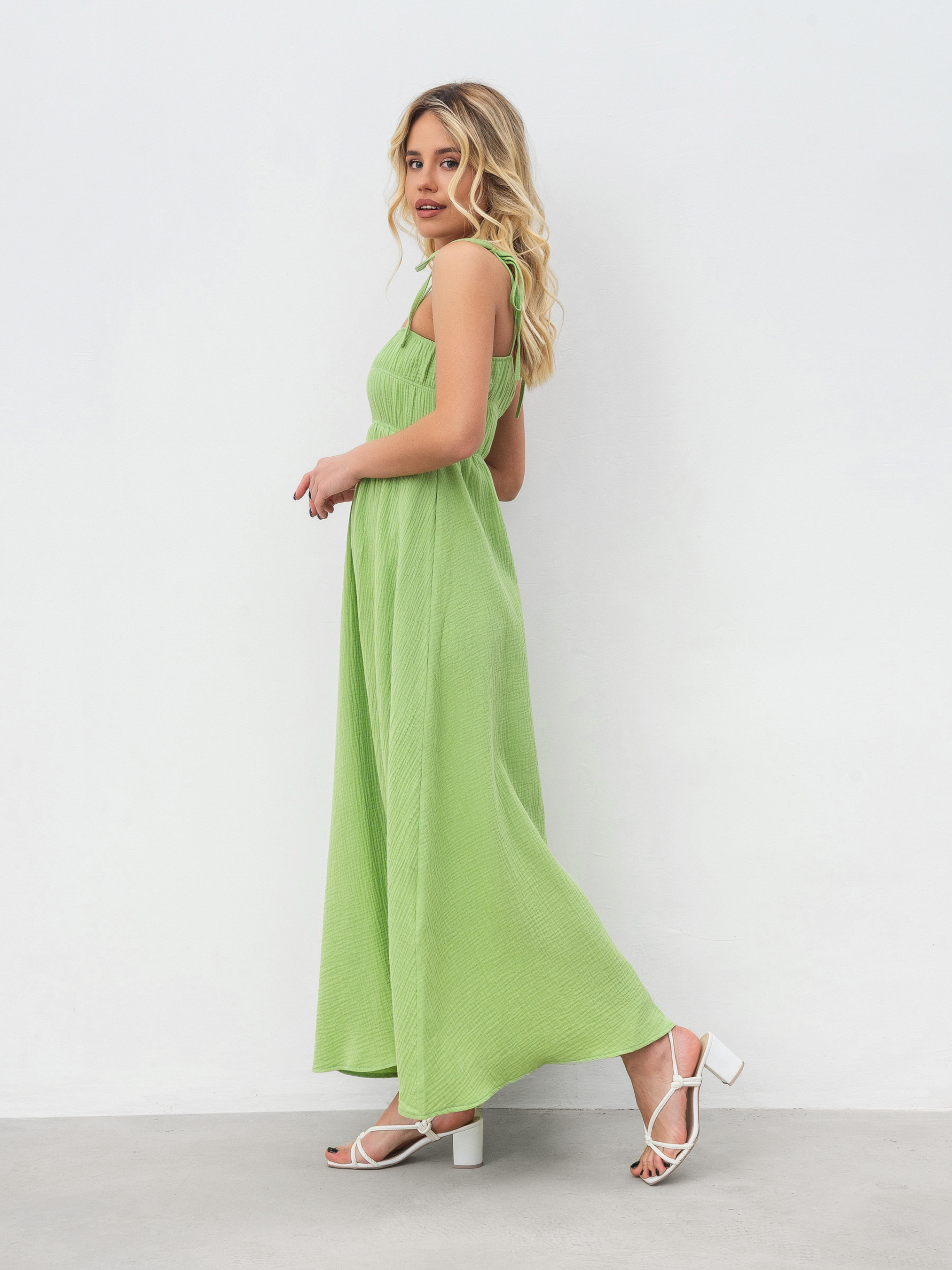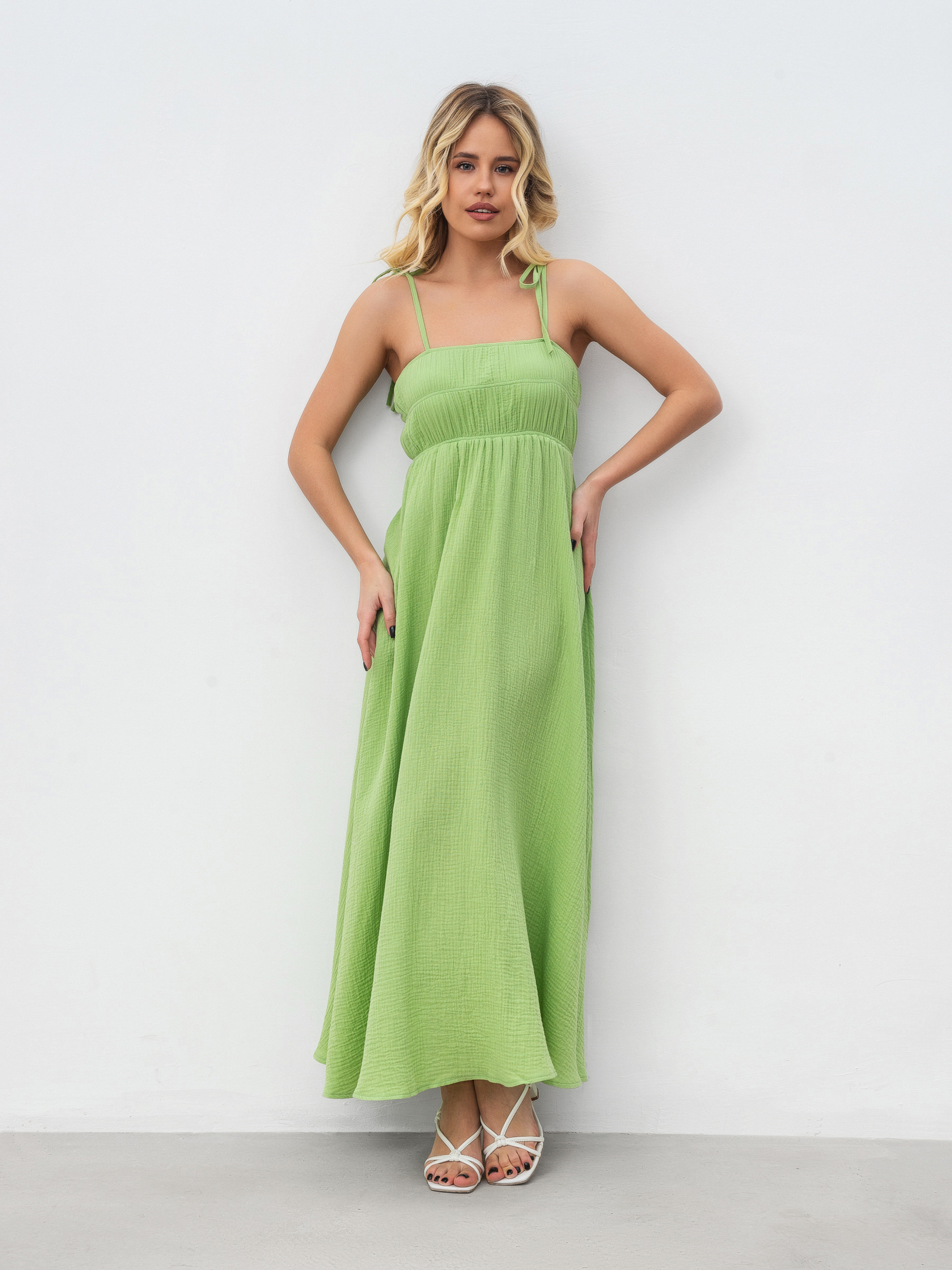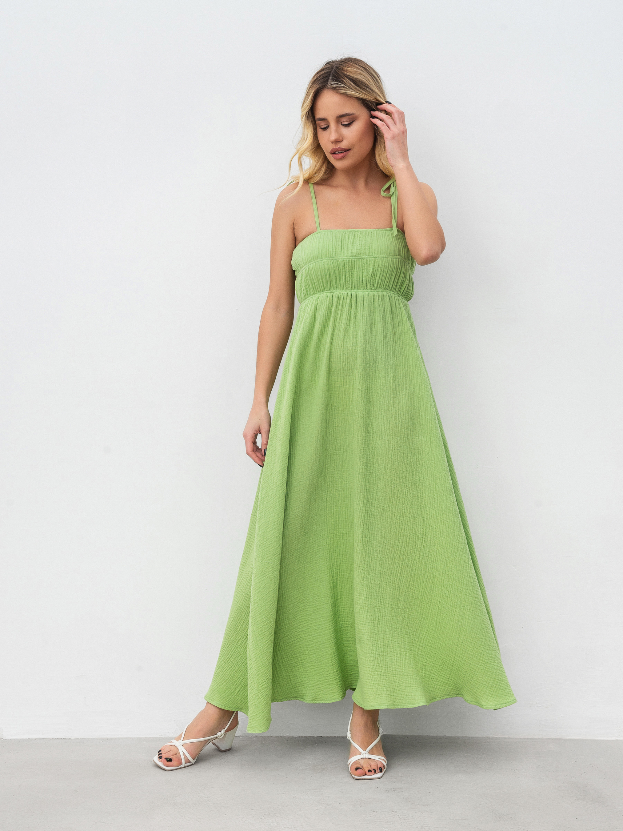 Платье макси из муслина. Натуральный 100% хлопок, который прекрасно носится в жару. На груди резинка, хорошо тянется и держит форму. Шлейки можно регулировать. XS-S Длина по спине: 116 см Полуобхват груди: 34 см Полуобхват бедер: 64 см Полуобхват талии : 32 см S-M Длина по спине: 116 см Полуобхват груди: 36 см Полуобхват бедер: 66 см Полуобхват талии : 33 см M-L Длина по спине: 117 см Полуобхват груди: 38 см Полуобхват бедер: 68 см Полуобхват талии: 35 см