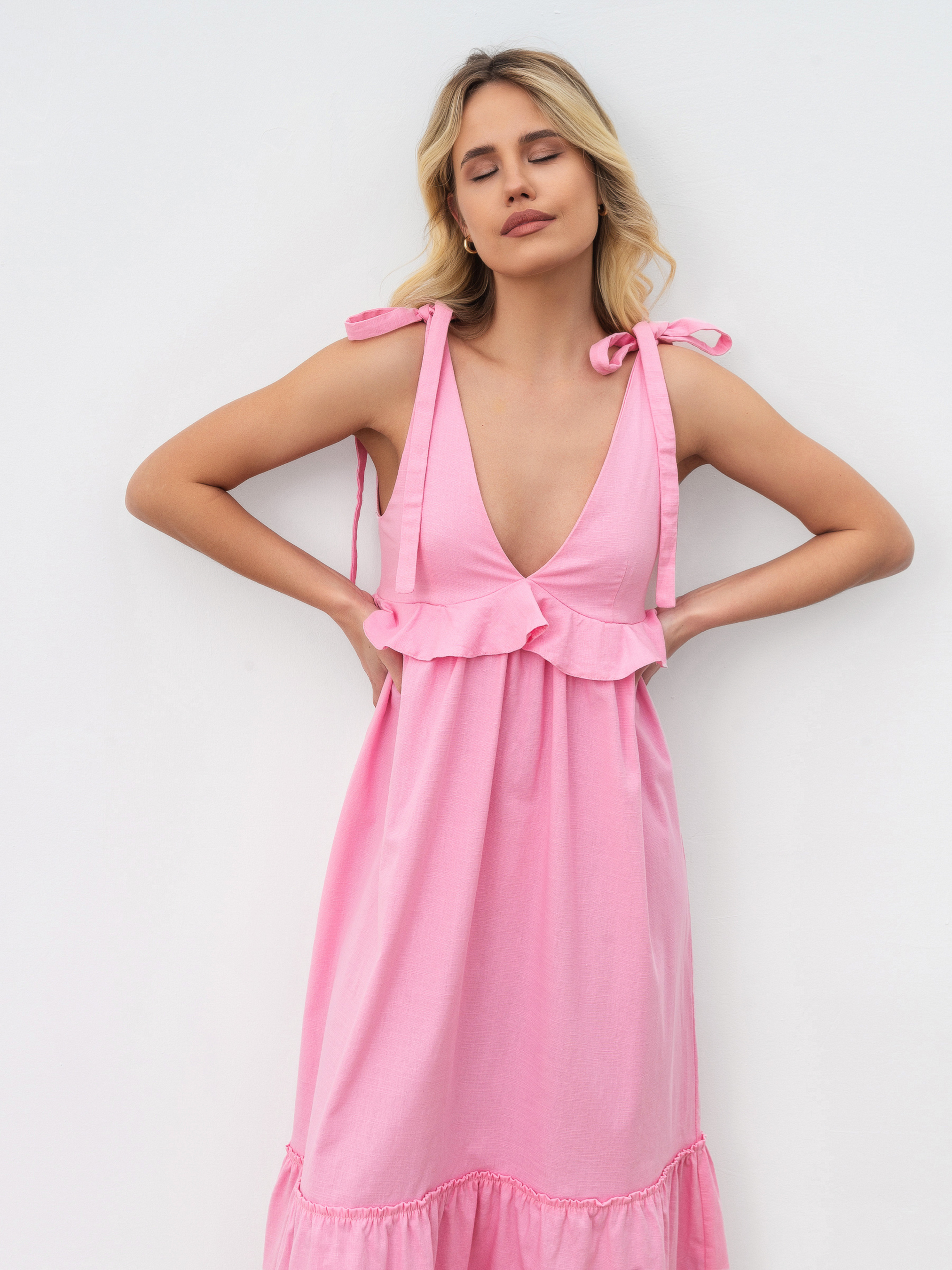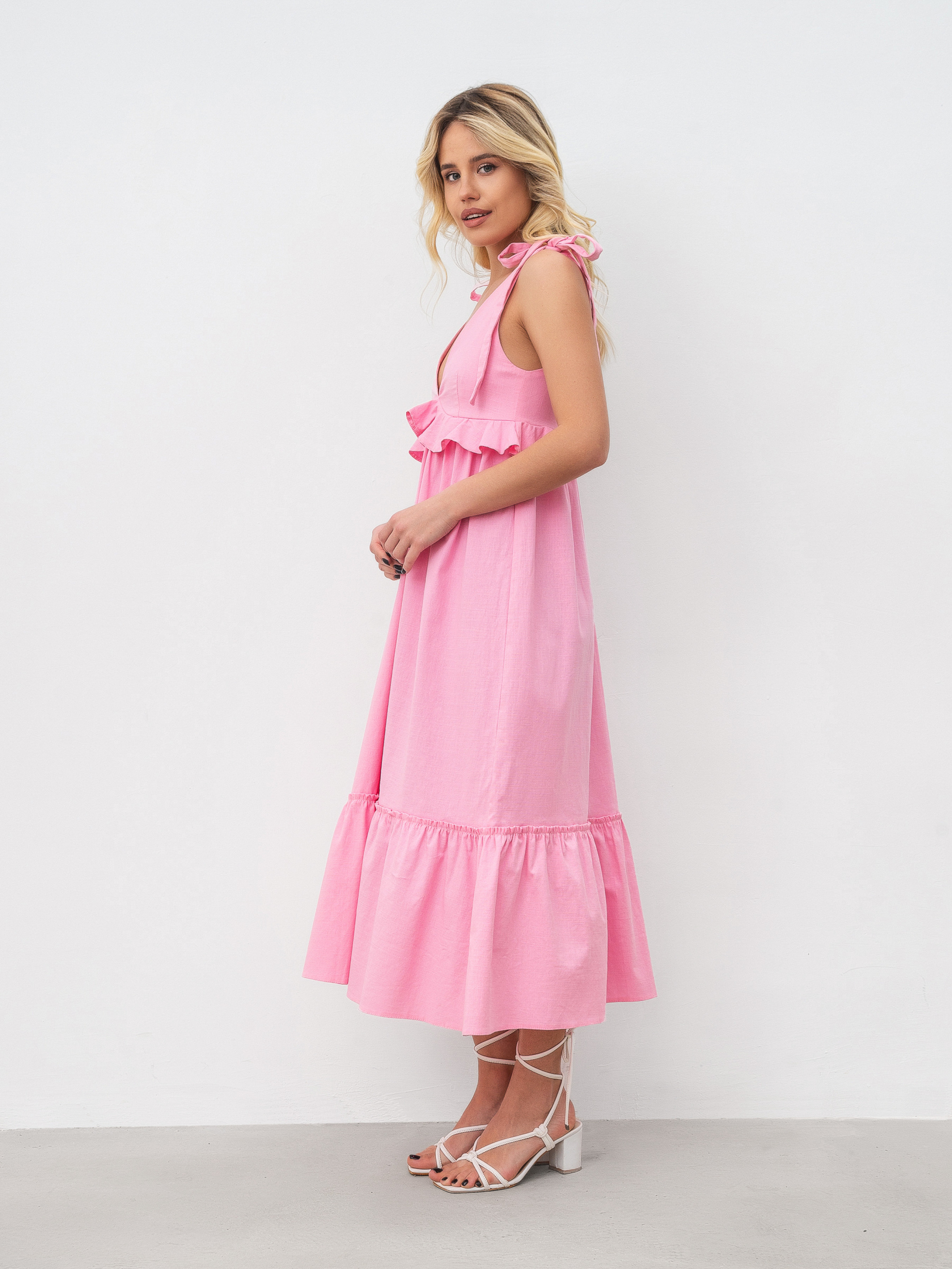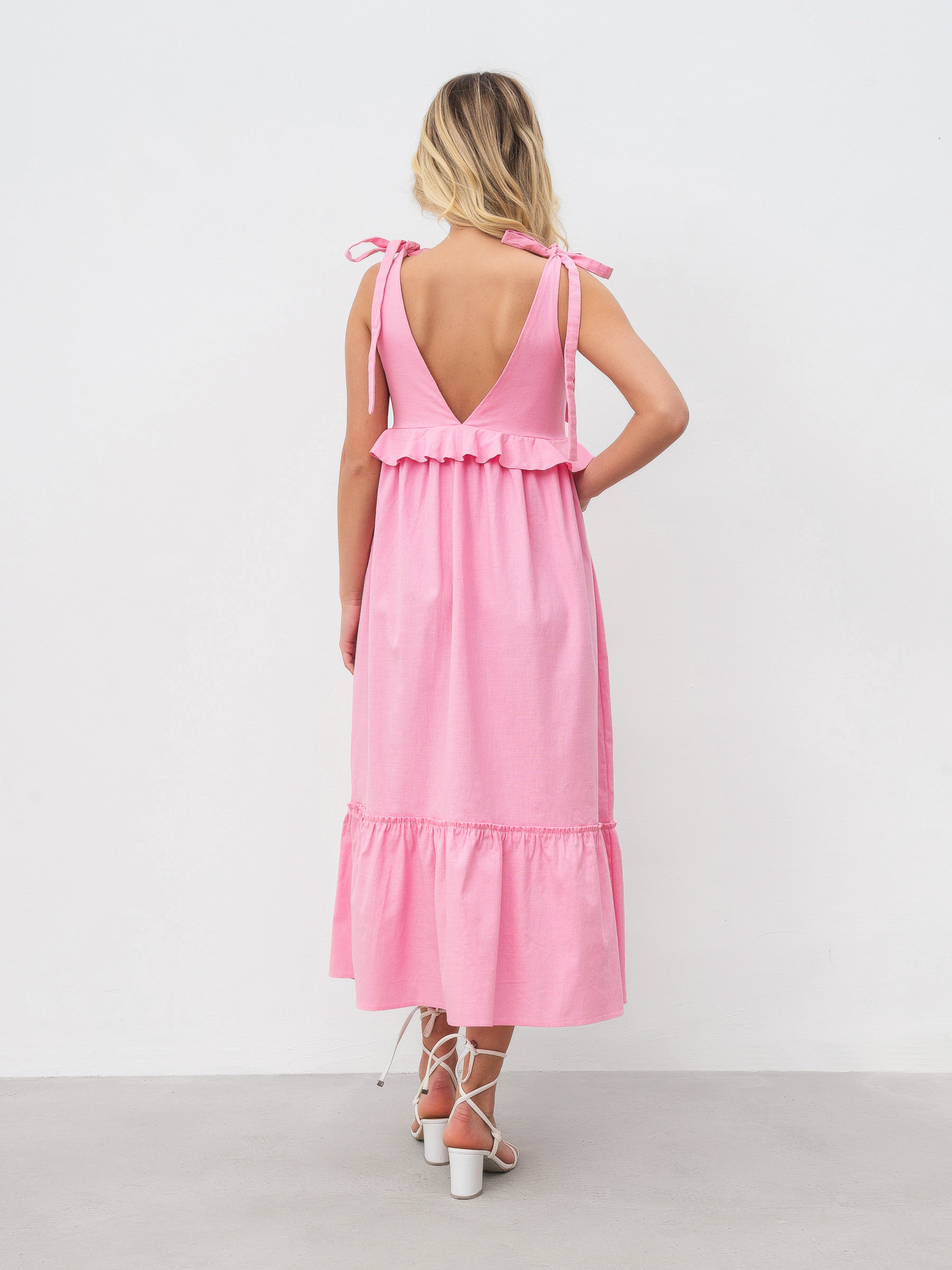 Открытое платье длиной миди, завышенная линия талии с воланом по ней, юбка А-силуэта с широкой рюшей по низу. Верх полочки выполнен из двойного материала чтобы эта зона не просвечивалась. V- образный вырез на полочке и спинке. На плечах завязки, которые можно регулировать под себя. Легкое летнее платье на жаркие летние дни для любого события. XS-S: Длина по спине : 115 см Полуобхват груди : 37 см Полуобхват бедер: 60 см Полуобхват талии: 36 см S-M : Длина по спине : 116 см. Полуобхват груди: 40 см. Полуобхват бедер: 64 см Полуобхват талии: 39 см