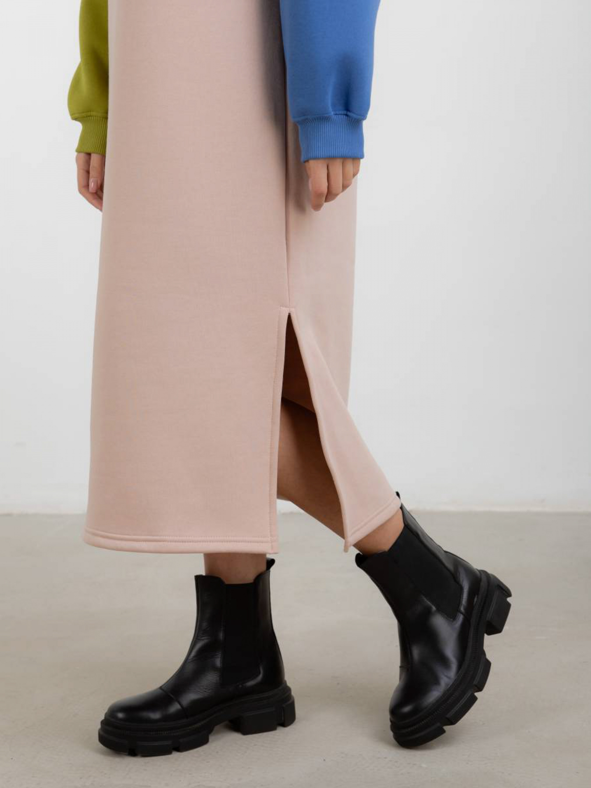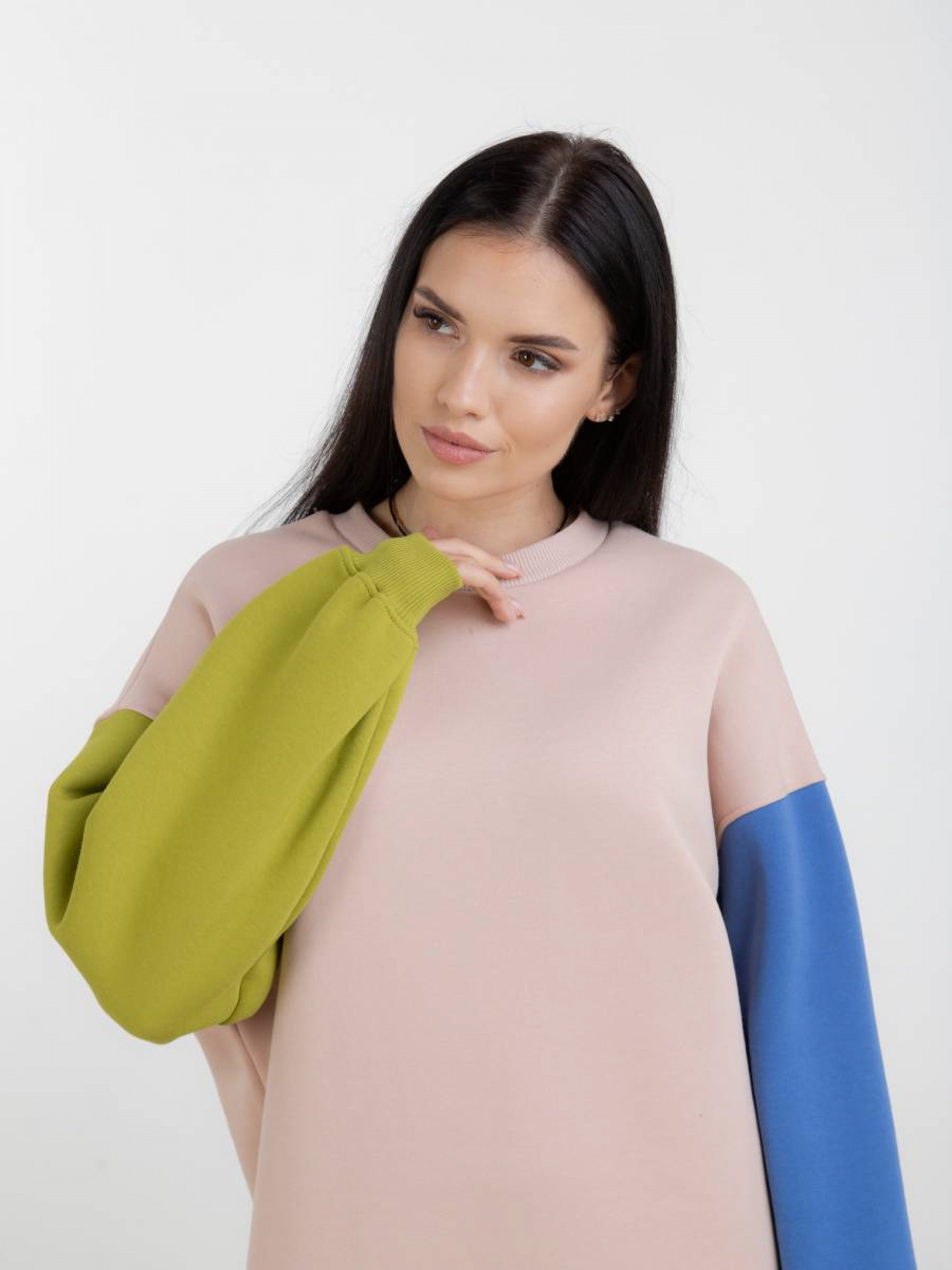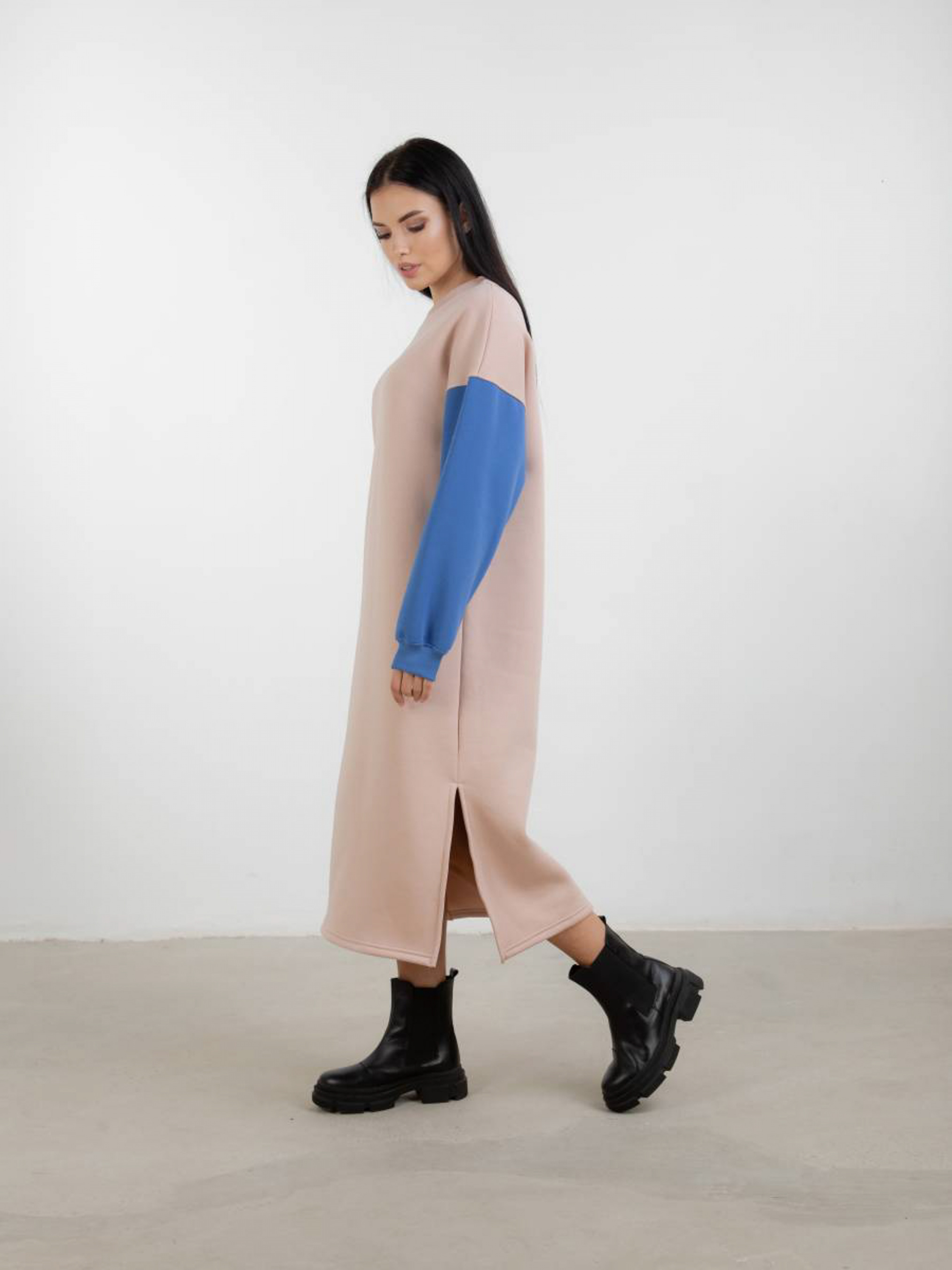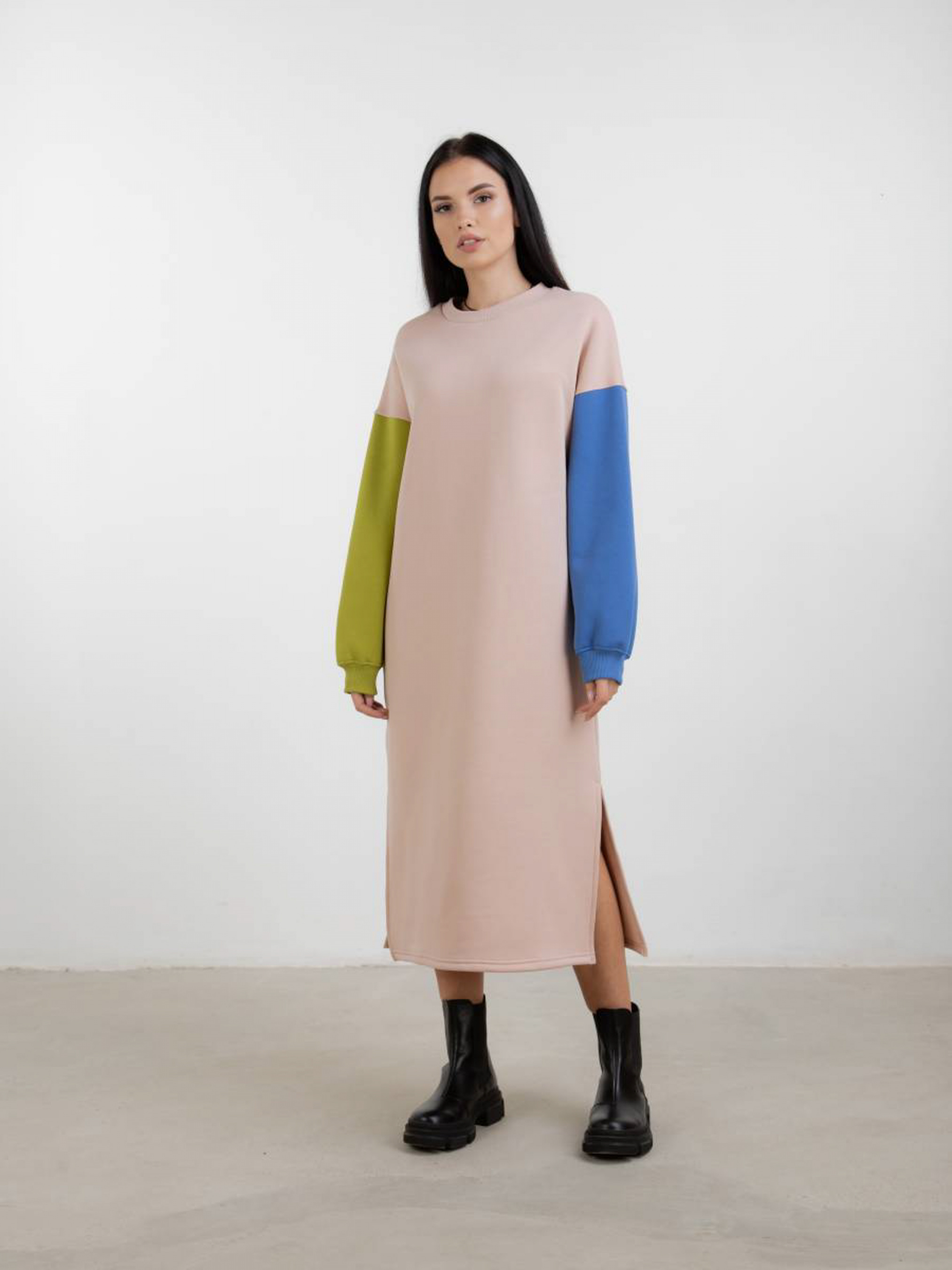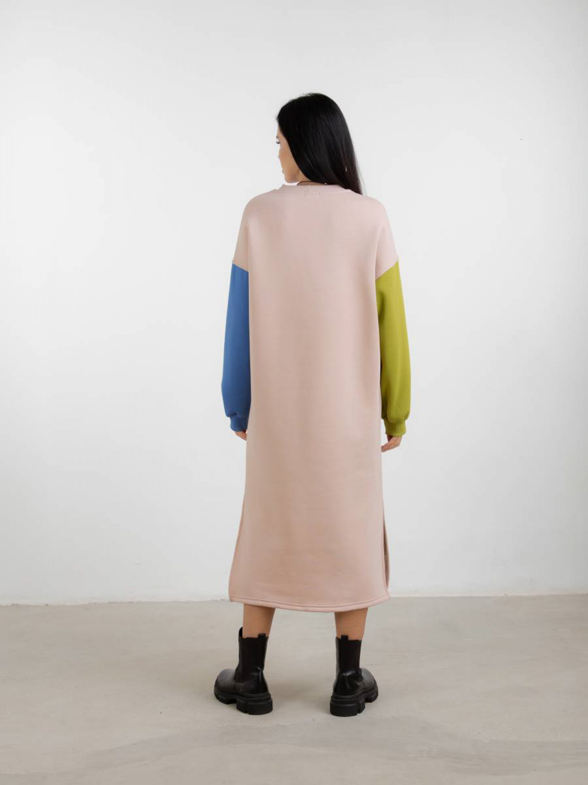 Тёплое повседневное плате-свитшот длинной миди. В нижний части разрезы по бокам. Необычность платью добавляют рукава выполеные из разных цветов. Качественный материал трехнитка-петля. Эластичная резинка на рукавах. S-M Длина по спине: 117 см Длина рукава: от спущенного шва 50 см Полуобхват груди: 57 см Полуобхват бедер: 53 см Плечи : 62 см M-L Длина по спине: 118 см Длина рукава : от спущенного шва 50 см Полуобхват груди: 59 см Полуобхват бедер: 56 см Плечи : 65 см