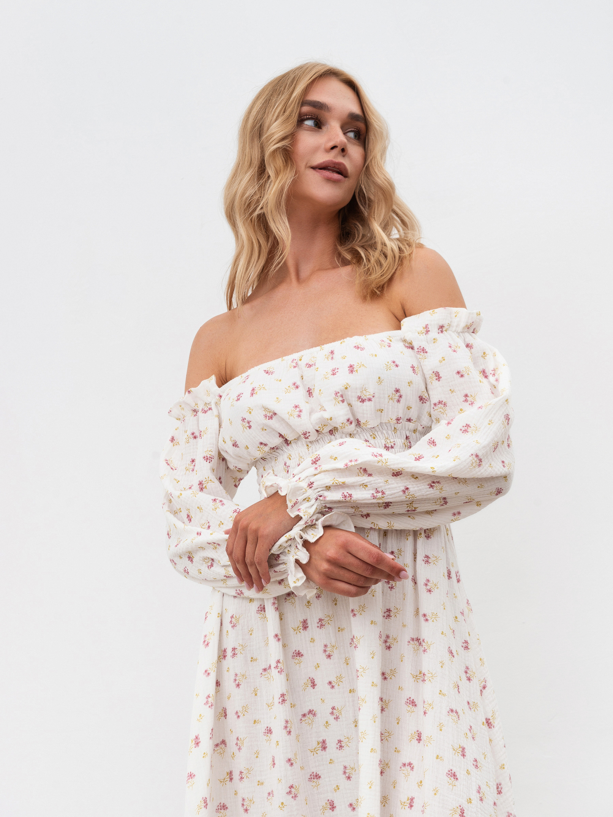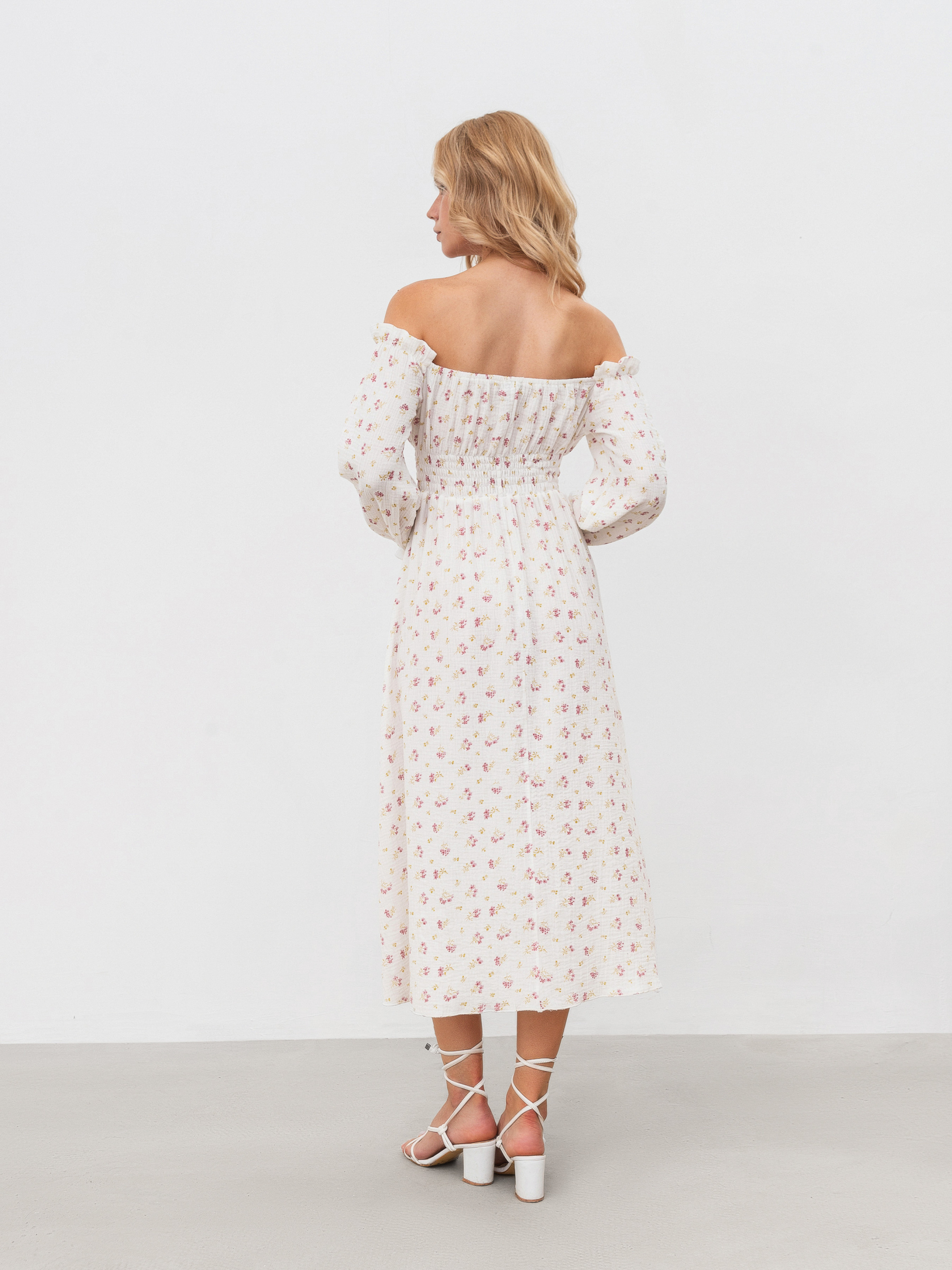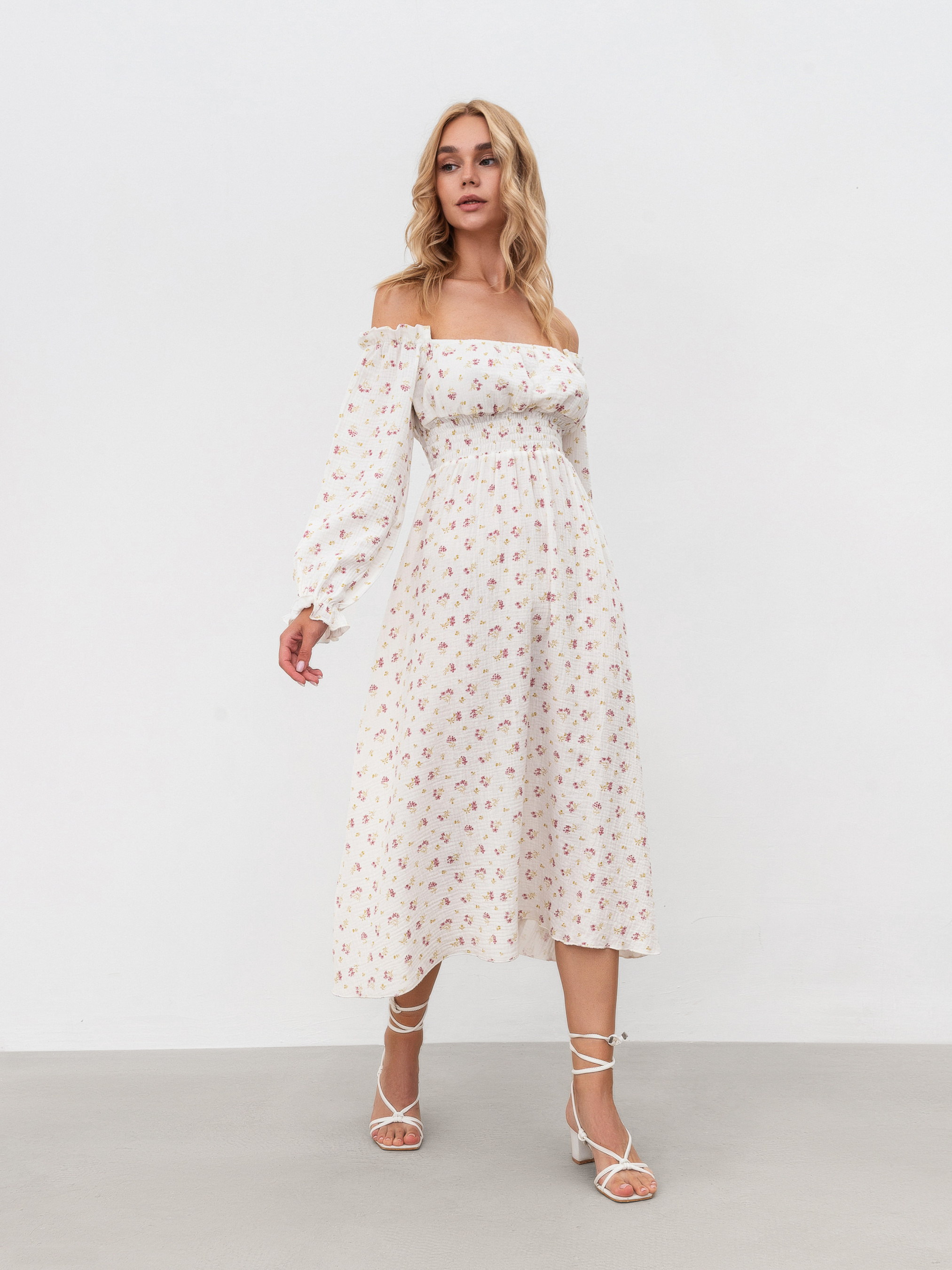 Платье из натурального муслина в принт. Хорошо садится на талию, на резинке. Спущенные свободные рукава, манжеты на резинке. Длина миди, длина миди. XS-S Длина по спине : 110 см Длина рукава : 52 см Полуобхват груди : 34 см Полуобхват бедер: 58 см Плечи : 40 см Полуобхват талии: 25 см S-M Длина по спине: 110 см Длина рукава : 52 см Полуобхват груди: 36 см Полуобхват бедер: 60 см Плечи : 41 см Полуобхват талии: 25 см M-L Длина по спине: 110 см Длина рукава : 53 см Полуобхват груди: 37 см Полуобхват бедер: 62 см Плечи : 42 см Полуобхват талии: 25 см