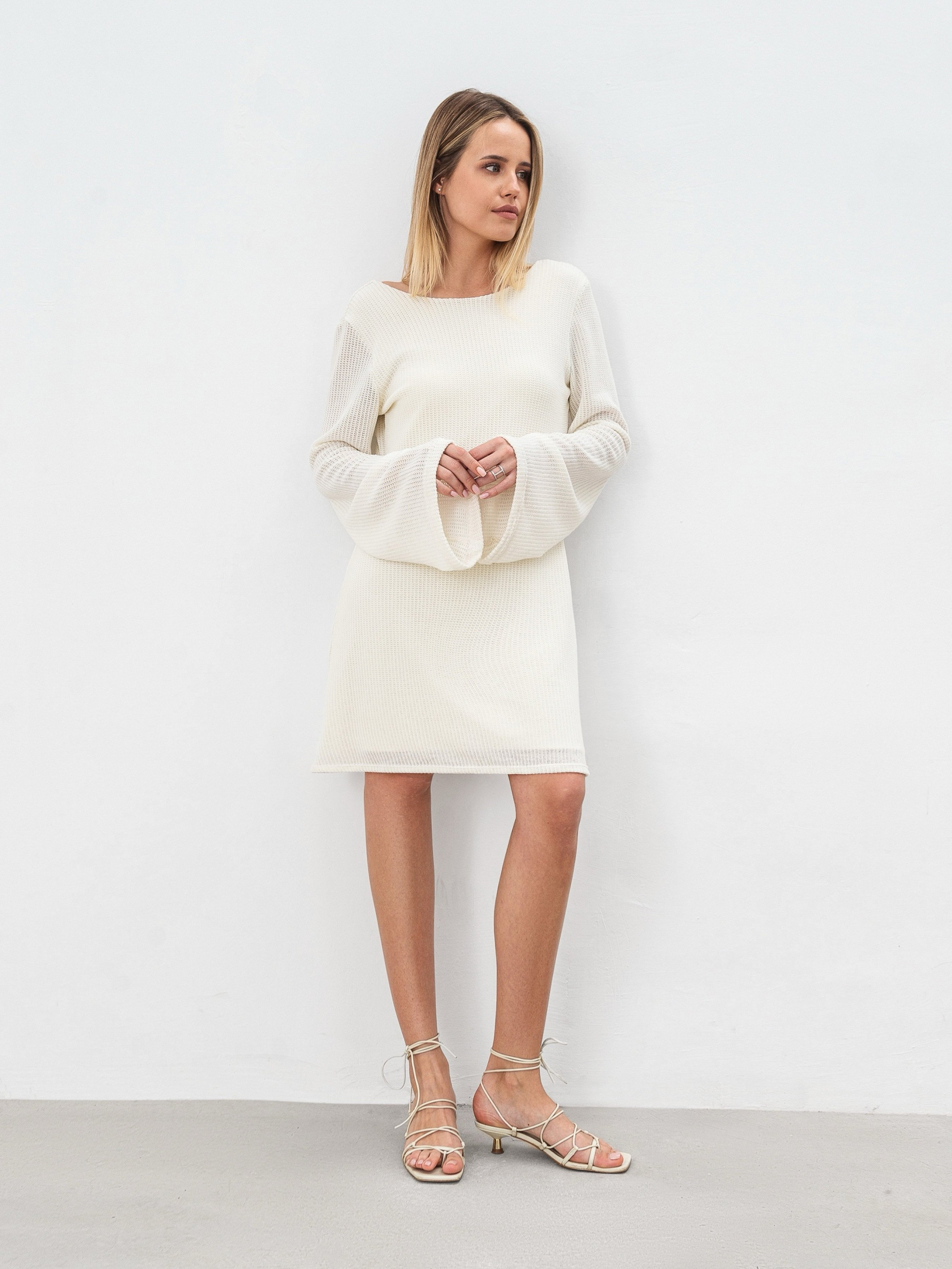 Платье со свободными рукавами длины мини. Приятный мягкий материал - полупрозрачная вязка с дополнительной пришитой трикотажной подкладкой. На спинке есть углубленный вырез. Платье свободно сидит на теле и комфортно ощущается на коже. Основная ткань состоит из 60% вискозы и 40% хлопка. Летний вариант на каждый день. Дополнять луки с этим платьем можно различными украшениями, обувью. Стилизовать можно с рубашками, пиджаками и тому подобное.