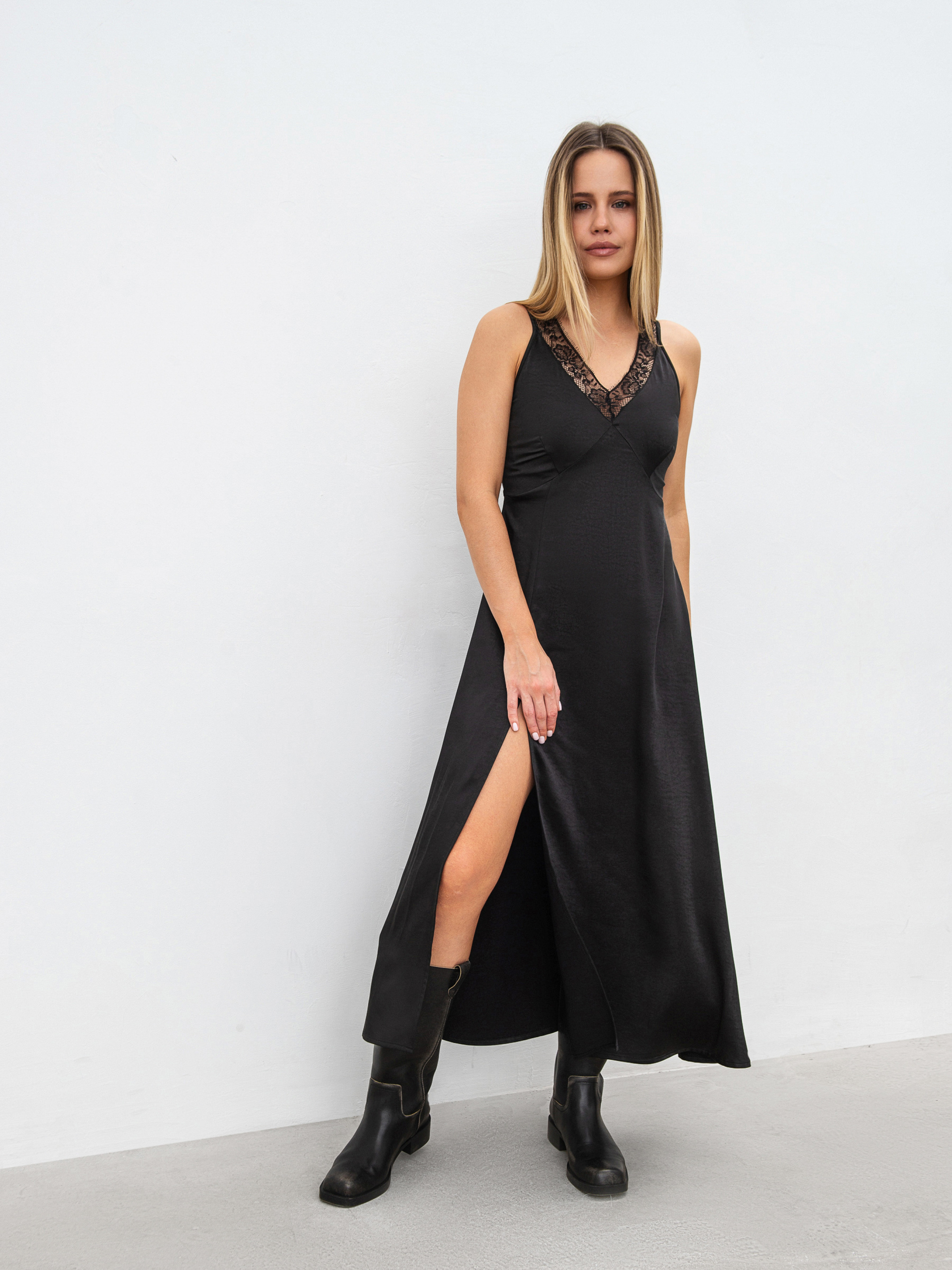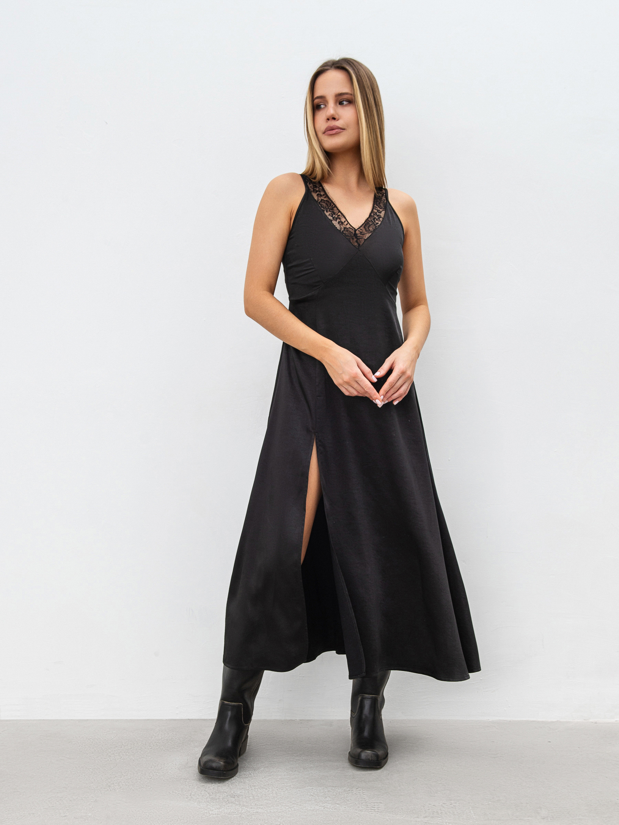 Платье миди в бельевом стиле - это сочетание утонченности и минимализма. Легкая, нежная ткань струится по телу, создавая плавный силуэт. Полуприлегающий крой дарит комфорт, а регулируемые тонкие бретели позволяют идеально адаптировать посадку. Особый акцент - V-образный вырез, украшенный кружевом, которое добавляет образу романтичности. Разрез по низу добавляет свободы движения и легкости в каждом шаге. Изготовленное из мягкого сатина (100% полиэстер), это платье станет универсальным вариантом для повседневных и праздничных образов. Его можно носить соло или комбинировать с жакетом или кардиганом для стильного многослойного аутфита.