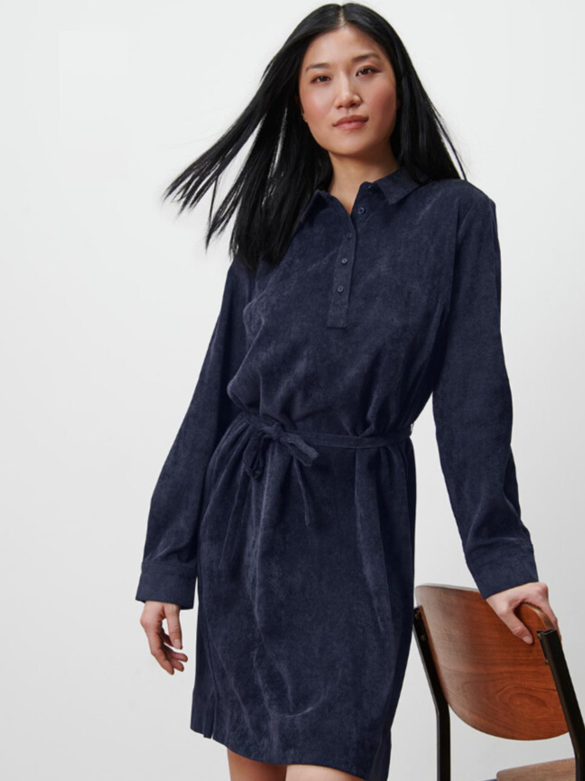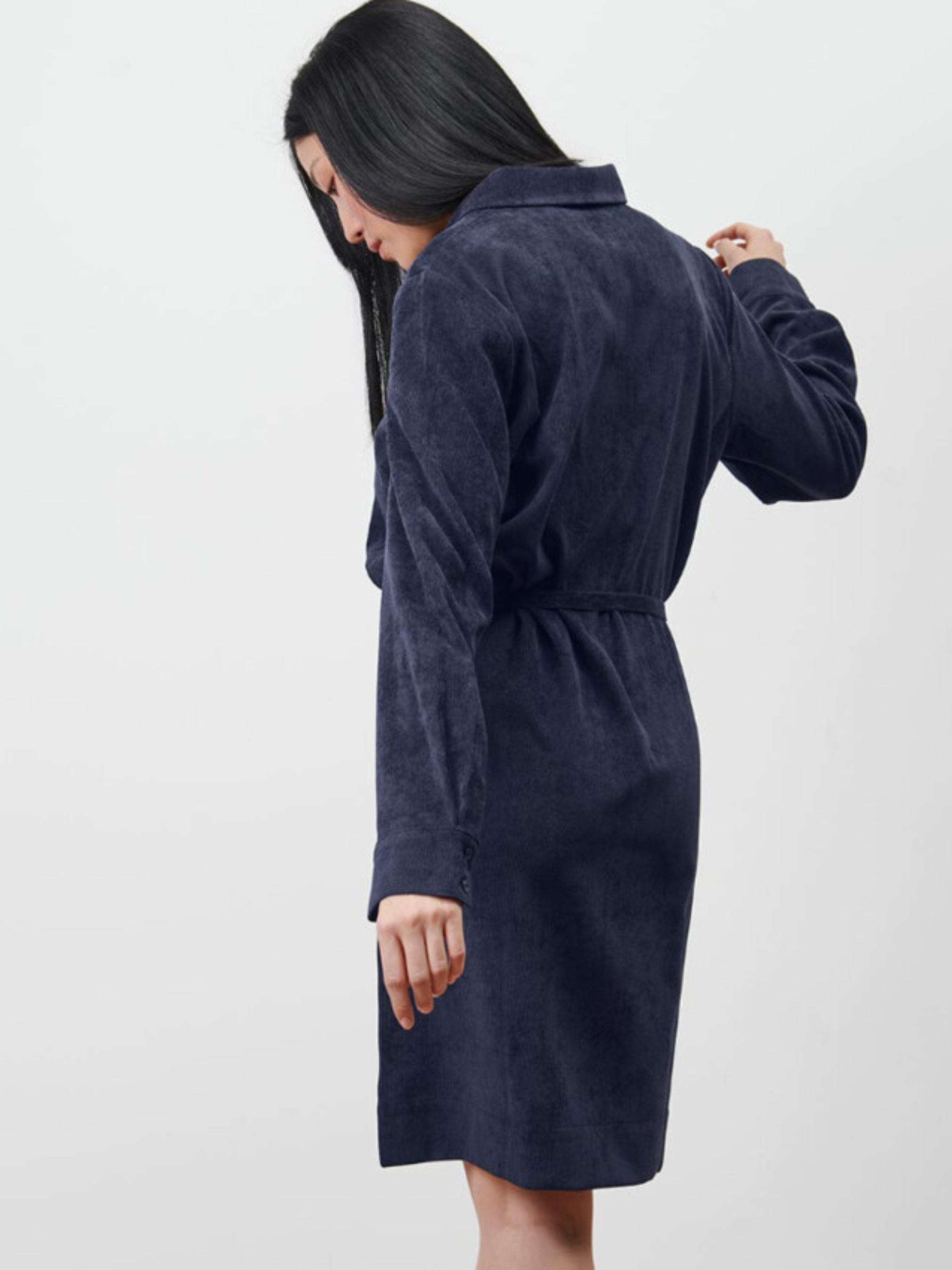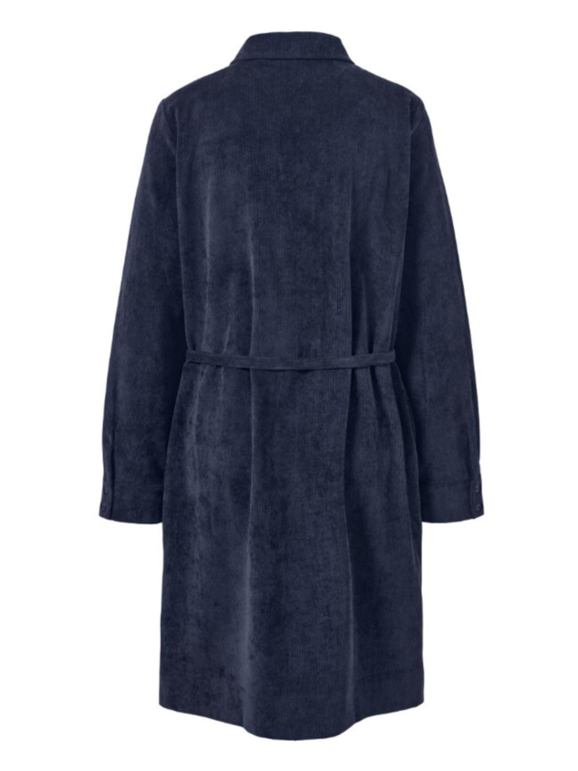Узкий пояс для завязывания на высоте талии. Рубашечный воротник и планка на пуговицах в области груди. Рукава оканчиваются манжетами и пуговицами Нижний край с небольшими боковыми разрезами Благодаря складкам на груди они оптимально адаптируются к фигуре. Пуговицы с перламутровым оттенком С эластаном: хорошо держит форму, идеально сидит и отлично носится. цвет - темно-синий материал – 90% полиэстер, 8% полиамид, 2% эластан Размер наш 50-52(44 евро) ПОГ: 55 см, Полуобхват бедер: 57 см, Длина рукава: 63 см, Длина: 103 см, Одежда бренда TCM Tchibo практически вся без бумажных этикеток, за редким исключением, и со срезанными частично или полностью внутренними бирками и ярлыками с составом ткани и другими данными