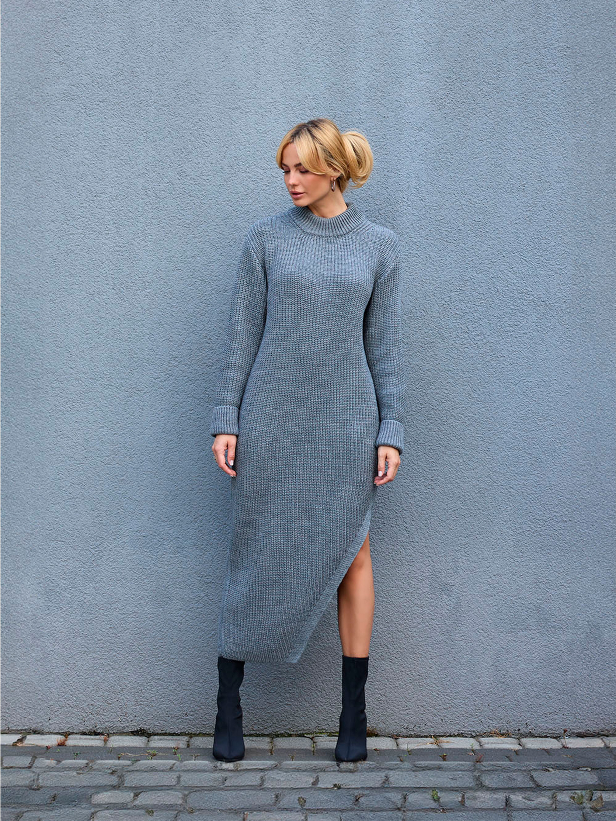 Асиметрична трикотажна сукня з напіввовни — комфорт і стиль у кожній петлі Підкресліть свою індивідуальність з вишуканою сукнею асиметричного крою, виготовленою з м’якої напіввовняної пряжі з віскозою. Об’ємна в’язка вільно огортає фігуру, даруючи відчуття комфорту та елегантної невимушеності. Завдяки пластичному візерунку сукня чудово тягнеться, не обмежуючи рухів. Асиметричний крій і глибокий розріз з одного боку додають динаміки образу, роблячи модель стильною й актуальною у будь-якому сезоні. Переваги моделі: Актуальний асиметричний фасон Трендова об’ємна в’язка Комфортна напіввовняна пряжа з віскозою Добре тягнеться, адаптуючись до фігури Стильний бічний розріз Характеристики: Довжина сукні: близько 120 см (+- 2 см) Ширина під проймою (спокійний стан): 50–55 см Ширина під проймою (розтягнутий стан): 60–65 см Ширина в талії та стегнах (спокійний стан): 49–53 см Ширина в талії та стегнах (розтягнутий стан): 59–63 см Довжина рукава: 52–53 см Ширина плеча: 13–16 см Довжина розрізу: 38 см Ця сукня — ідеальна база для створення як повсякденного, так і святкового образу. Просто додайте улюблені аксесуари — і готово!