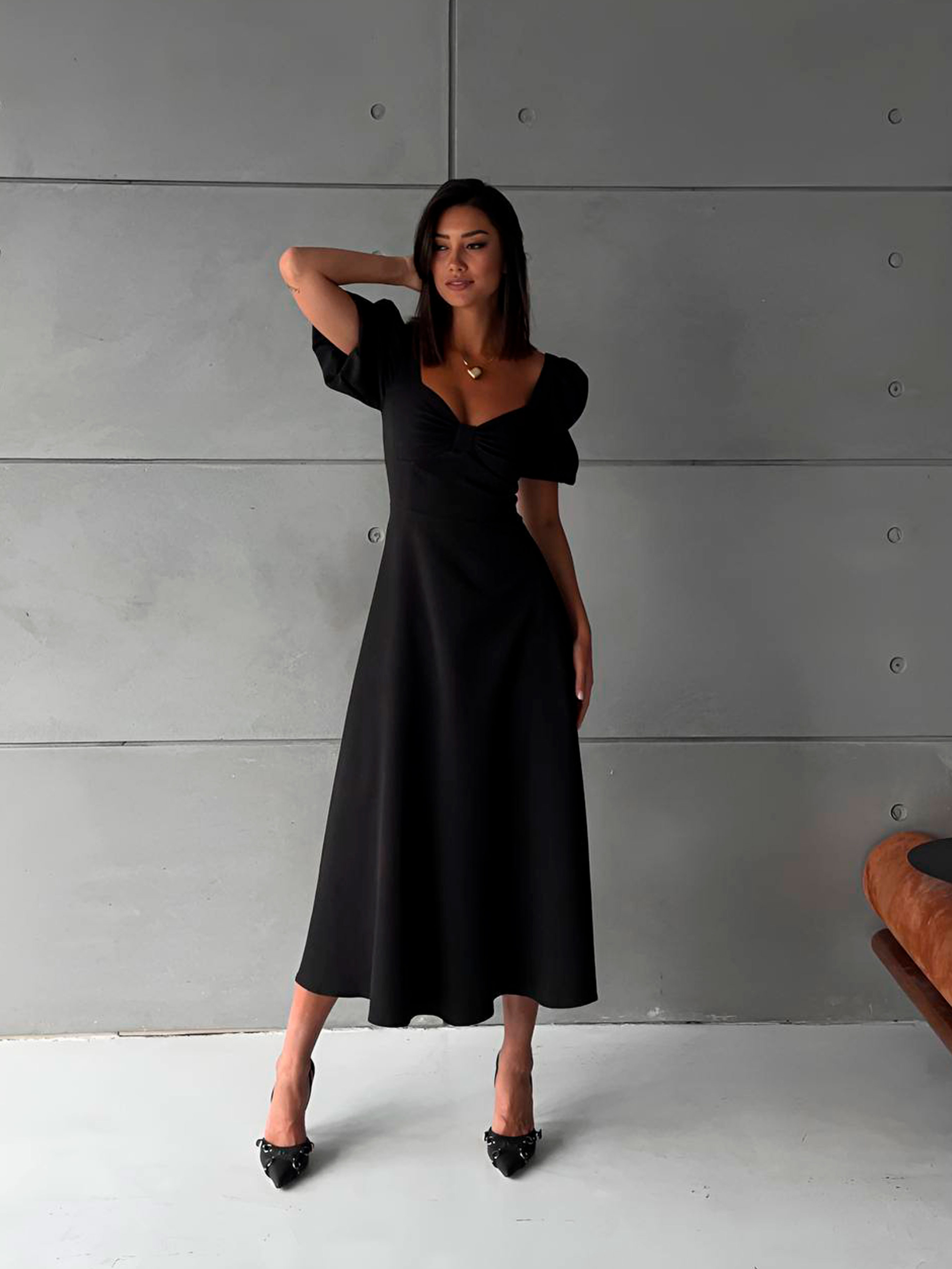 Жіноча вечірня міді сукня з рукавом-ліхтариком — це втілення класичної витонченості та ніжності. Шляхетний образ надає особливої чистоти та аристократизму, роблячи цю сукню ідеальним вибором для урочистих подій, хрестин, розпису або святкової вечері. Завдяки довжині міді та грайливим рукавам, модель виглядає одночасно стримано та романтично, підкреслюючи ваш витончений стиль та внутрішню гармонію. Матеріал: Структурна якість та комфорт Збалансований склад (20% вовна, 80% поліестер): Костюмна тканина з додаванням вовни забезпечує виробу дорогий вигляд та приємні тактильні відчуття. Поліестер гарантує зносостійкість і дозволяє сукні зберігати ідеальну білосніжність та форму після прання. Гладка фактура: Матеріал має матову гладку поверхню, яка виглядає бездоганно при будь-якому освітленні. Повітропроникність: Незважаючи на щільність костюмної тканини, присутність вовни дозволяє шкірі дихати, що важливо для комфортного перебування на святі. Особливості дизайну та фасону Рукави-ліхтарики: Короткий пишний рукав додає образу жіночності та легкої вінтажності, акцентуючи увагу на витончених руках. Фасон Кльош та довжина Міді: Спідниця, що розширюється донизу, створює красивий силует «пісочний годинник», м'яко приховуючи лінію стегон і підкреслюючи талію. Зручність без застібок: Продуманий крій дозволяє легко вдягати сукню, забезпечуючи ідеальну посадку по фігурі без зайвої фурнітури. Характеристики: Матеріал: Костюмна тканина. Склад: 80% Поліестер, 20% Вовна. Колір: Молочний, чорний. Довжина: Міді-сукня. Фасон рукава: Ліхтарик (короткий). Фасон сукні: Кльош. Стиль: Вечірній / Святковий. Сезон: Літо / Демісезон. Виробник: Україна. Рекомендації з догляду: Світла тканина з вовною потребує дбайливого догляду: Прати при температурі не вище 30°C у режимі делікатного прання. Використовуйте рідкі засоби для білих делікатних тканин. Сушити на плічках у розправленому вигляді, щоб уникнути заломів на рукавах-ліхтариках. Прасувати з виворітного боку через вологу тканину або скористатися відпарювачем для збереження об'єму рукавів.