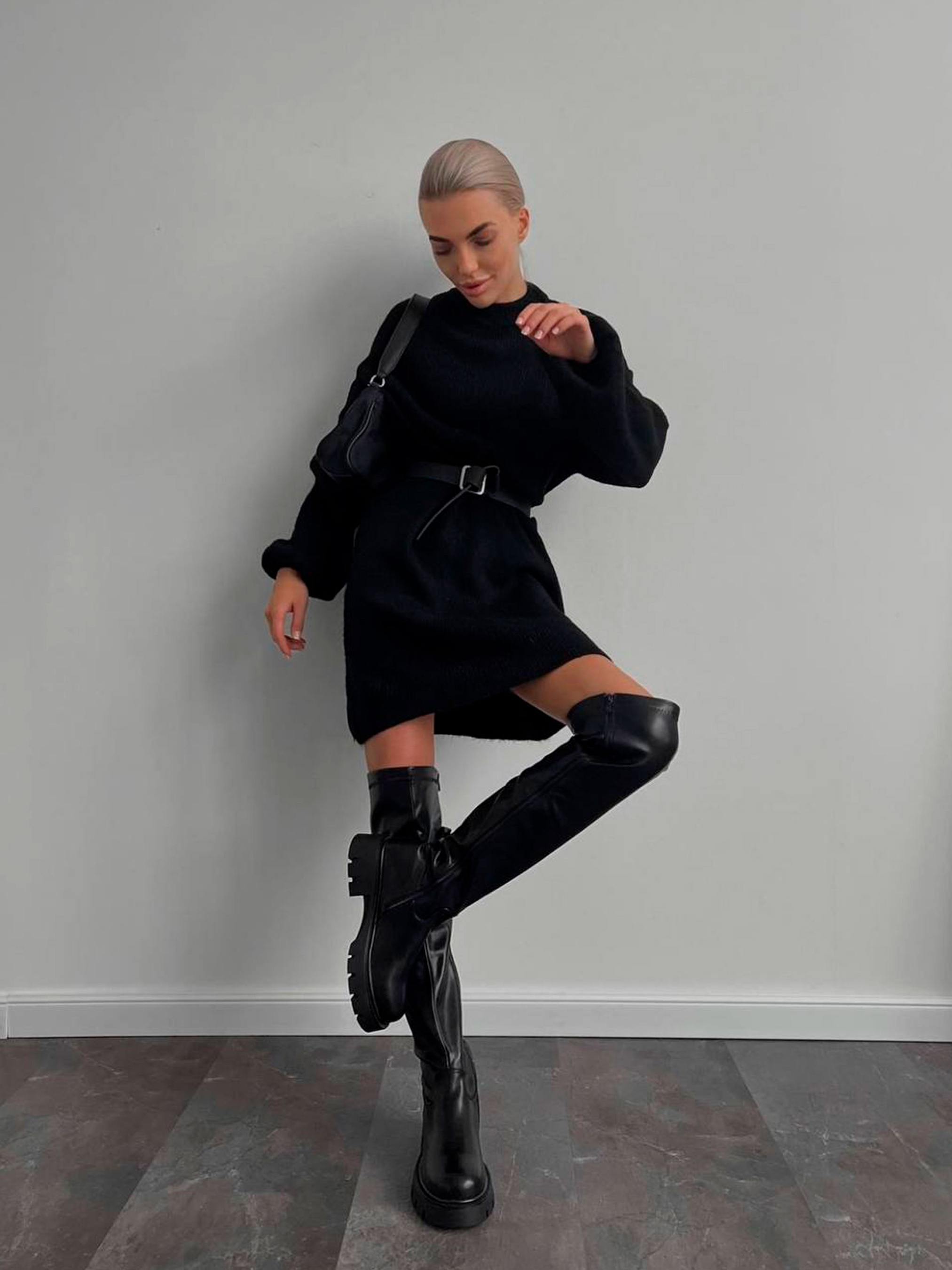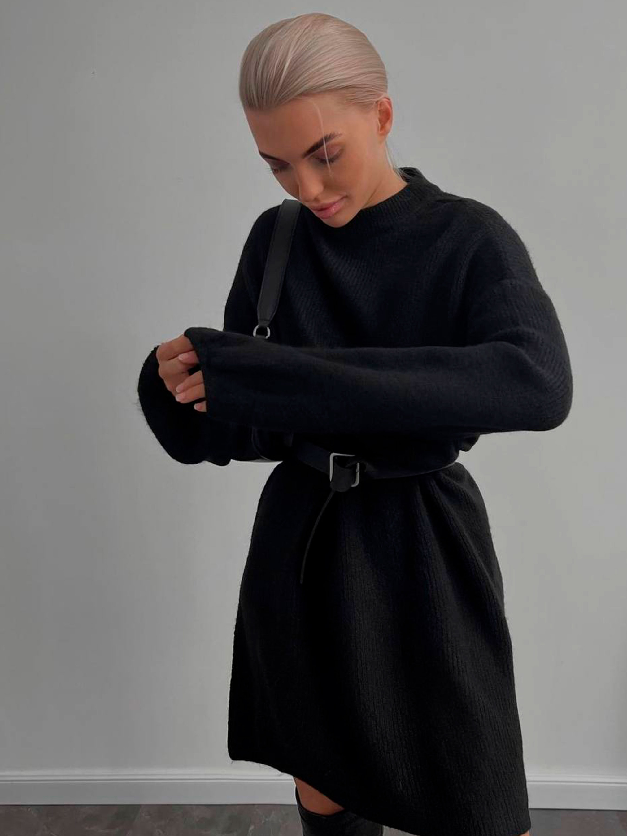 Жіноча ангорова міні сукня з паском — це ідеальне поєднання затишного комфорту та стриманої елегантності. Глибокий чорний колір у поєднанні з фактурою в рубчик створює стильний, графічний образ, який підходить як для офісних буднів, так і для вечірніх прогулянок. Фасон «сукня-свитер» дарує відчуття свободи, а пасок у комплекті дозволяє миттєво змінити настрій образу, зробивши акцент на талії та підкресливши жіночність силуету. Матеріал: Тепло вовни та м'якість ангори Преміальний склад (40% вовна, 28% віскоза, 30% поліестер, 2% еластан): Високий вміст натуральної вовни гарантує відмінне збереження тепла в прохолодний демісезонний період. Віскоза робить полотно шовковистим і приємним до шкіри, а додавання еластану забезпечує гарну посадку без деформації виробу. Фактура в рубчик: Вертикальні лінії не лише додають тканині цікавої структури, а й візуально витягують силует, додаючи стрункості. Приємна на дотик: Тканина з ефектом ангори надзвичайно ніжна, вона не колеться і забезпечує максимальний затишок протягом усього дня. Дизайн та особливості крою Фасон Сукня-свитер: Універсальний крій, який поєднує в собі розслабленість повсякденного одягу та витонченість класичної сукні. Рукав Реглан: Такий крій рукава робить лінію плечей більш м'якою та похилою, забезпечуючи ідеальну посадку на будь-яку фігуру та повну свободу рухів. Довжина Міні: Дозволяє створити грайливий образ, який чудово поєднується як із високими чоботами, так і з черевиками на грубій підошві. Акцент на талії: Завдяки паску ви можете самостійно регулювати ступінь прилягання сукні, створюючи потрібний вам об'єм. Характеристики: Матеріал: Ангора (в рубчик). Склад: 30% поліестер, 40% вовна, 28% віскоза, 2% еластан. Колір: Чорний. Довжина: Міні-сукня. Фасон: Сукня-свитер. Рукав: Довгий, реглан. Стиль: Повсякденний (Casual). Сезон: Демісезон. Виробник: Україна. Рекомендації з догляду: Щоб ангорове полотно залишалося м'яким і пухнастим: Прати виключно у делікатному режимі при температурі до 30°C. Використовуйте м'які засоби (гелі) для вовни. Сушити виріб бажано на горизонтальній поверхні в розправленому вигляді, щоб уникнути розтягування під власною вагою. Прасувати лише парою або з вивороту через марлю на мінімальній температурі.