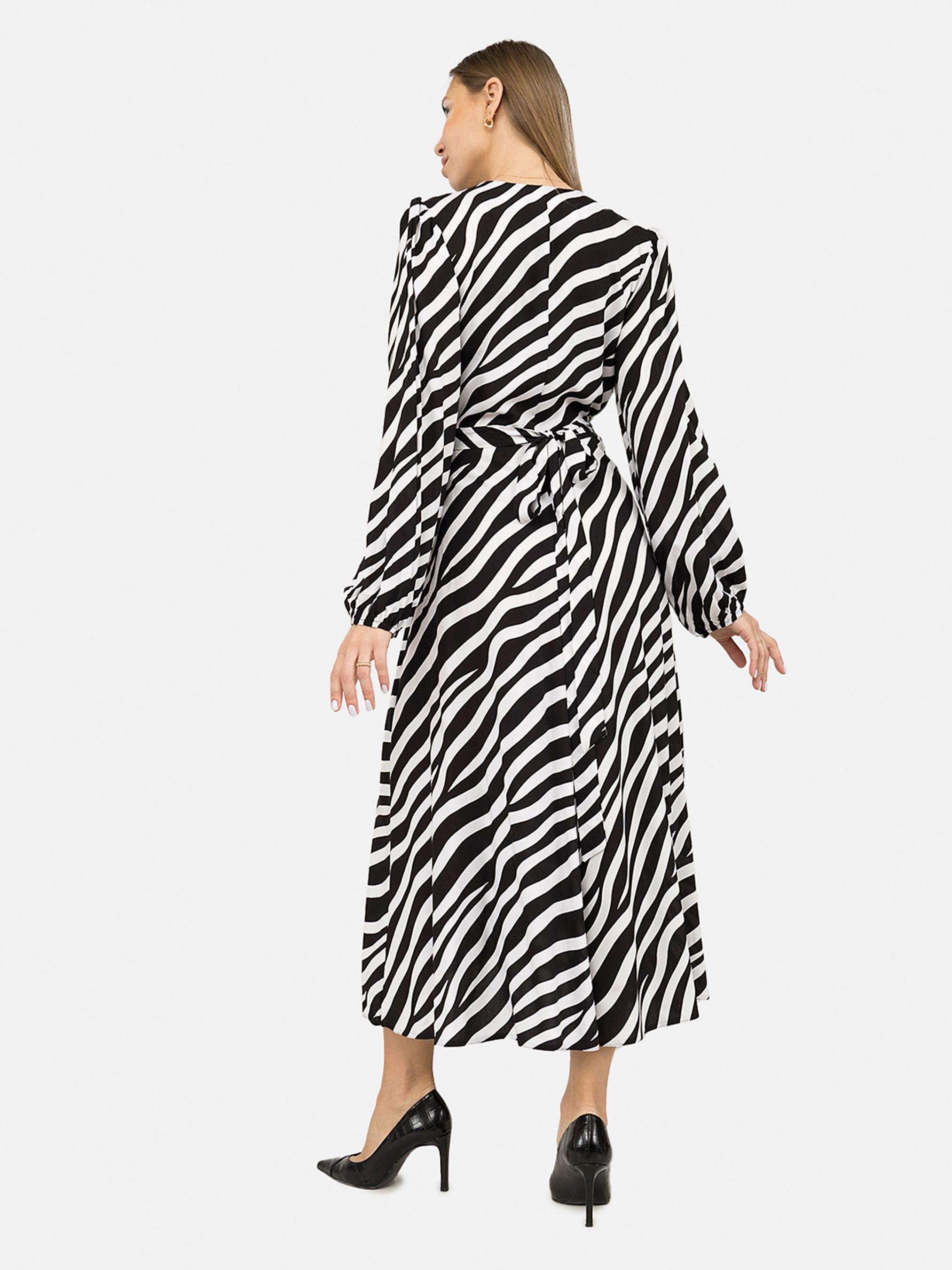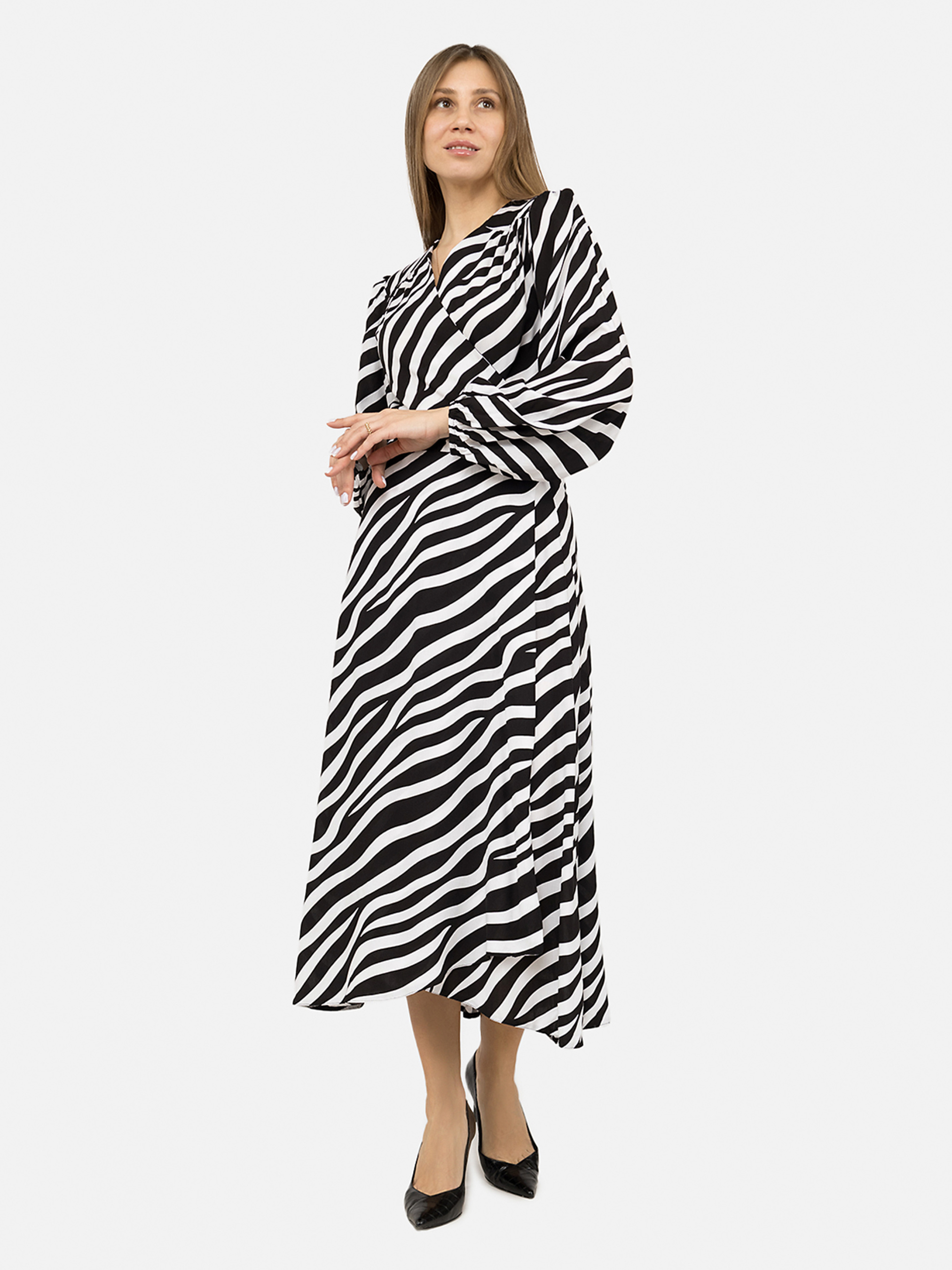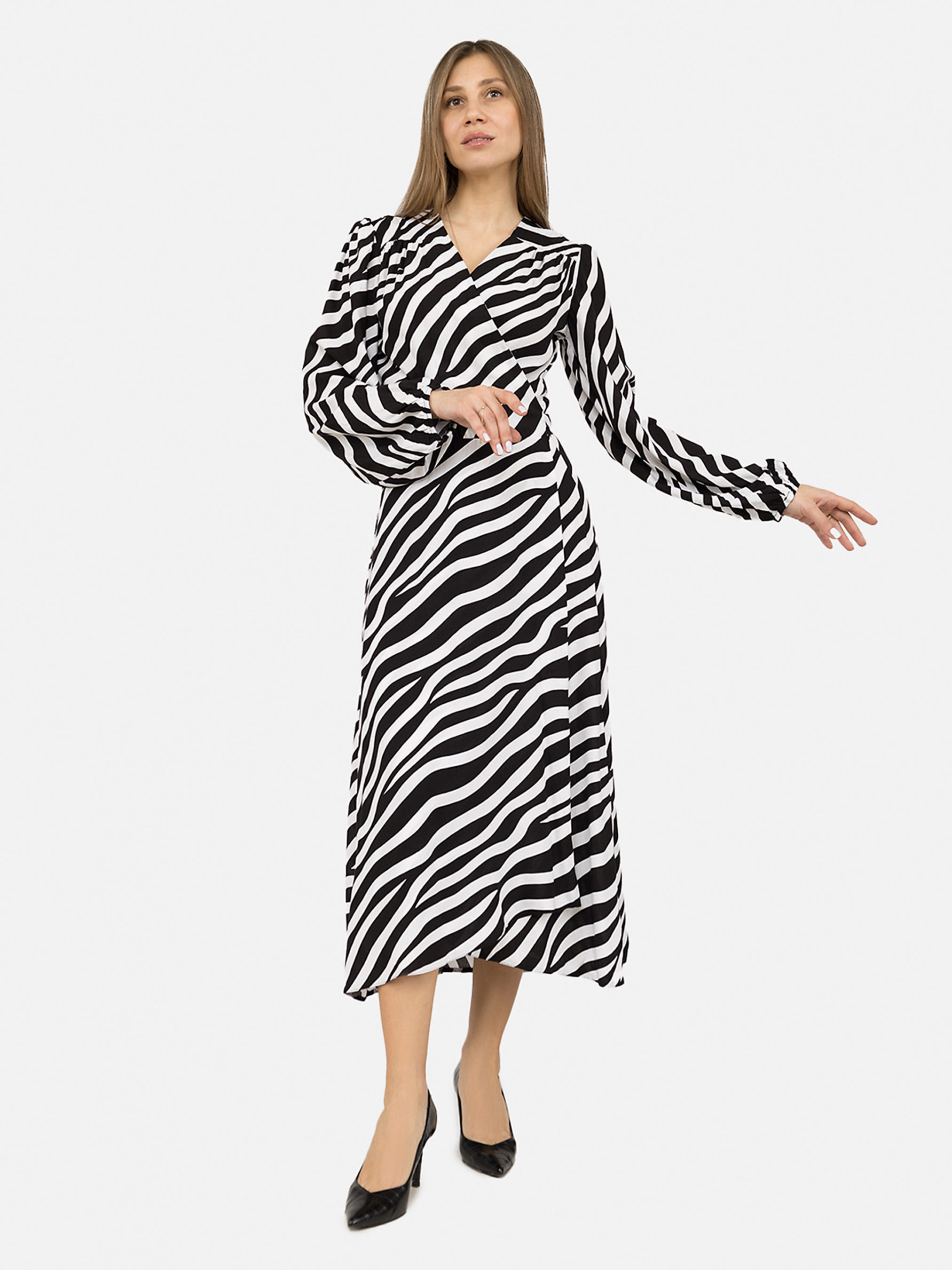 Платье на запах женское - это не просто одежда, а воплощение женственности и элегантности. Изготовленное из легкой, костюмной ткани, которая обеспечивает комфорт и подчеркивает силуэт, это платье идеально подходит как для ежедневной носки, так и для особых случаев. Дизайн платья характеризуется классическим запахом, что позволяет регулировать глубину декольте, делая его универсальным для различных типов фигуры и вкусов. Благодаря своему стилю, платье легко сочетается с различными элементами гардероба, будь то пиджак для офиса или жакет для вечера, обеспечивая комфорт и великолепный вид. Запаховой крой добавляет утонченного силуэта, а длина миди обеспечивает элегантность и универсальность. Это платье станет не только прекрасным дополнением к вашему гардеробу, но и позволит вам чувствовать себя уверенно, элегантно и женственно в любой ситуации. Особенности изделия: Цвет: черный, с декоративным узором. Материал изготовления: штапель. Состав: 80% хлопок, 20% вискоза. Крой: подчеркивает талию. Длина: миди. Платье имеет длинный рукав. Сезон: демисезонный. Параметры модели: Рост: 170 см. Размер на модели: 46. Страна производитель: Украина.