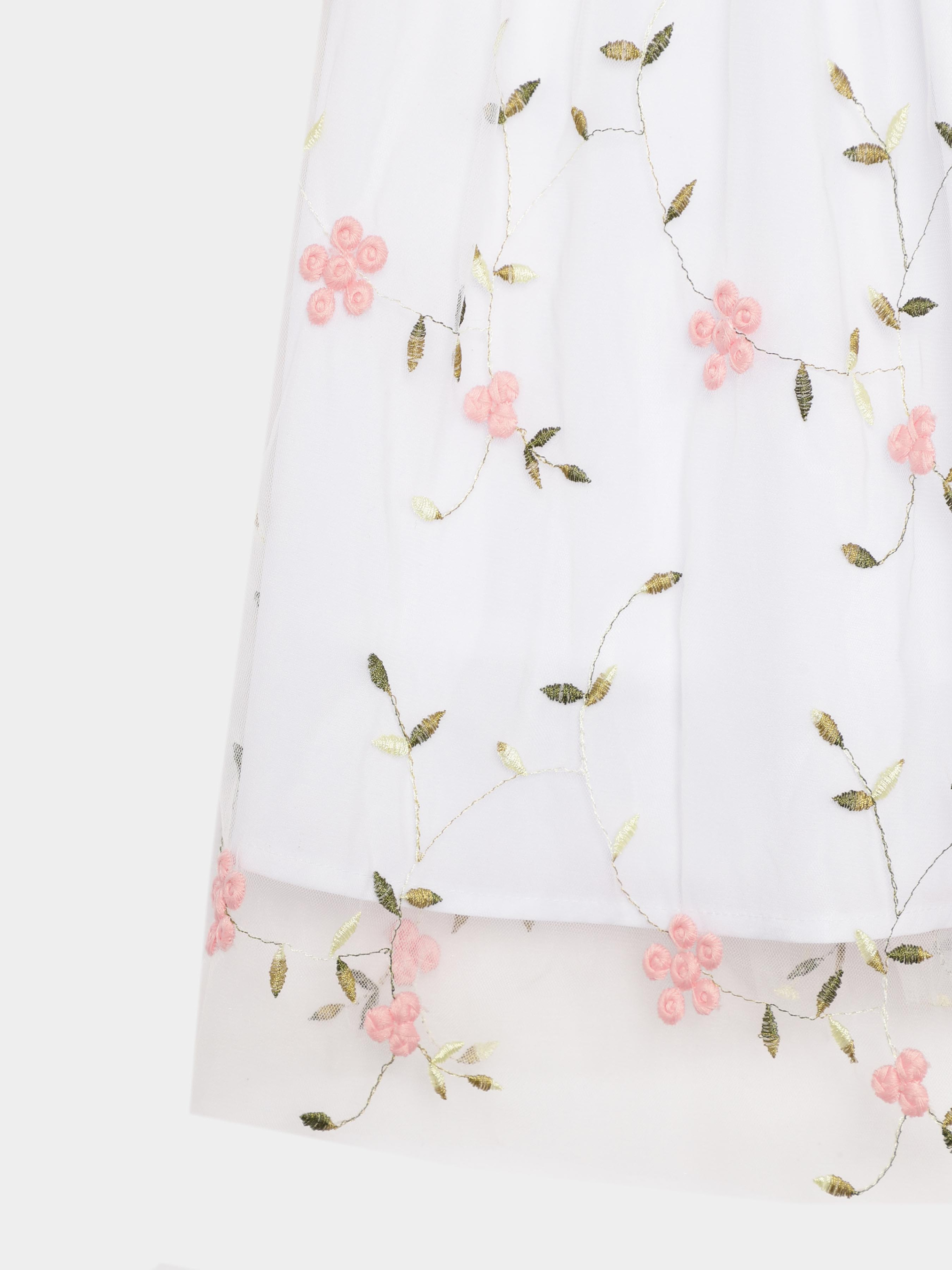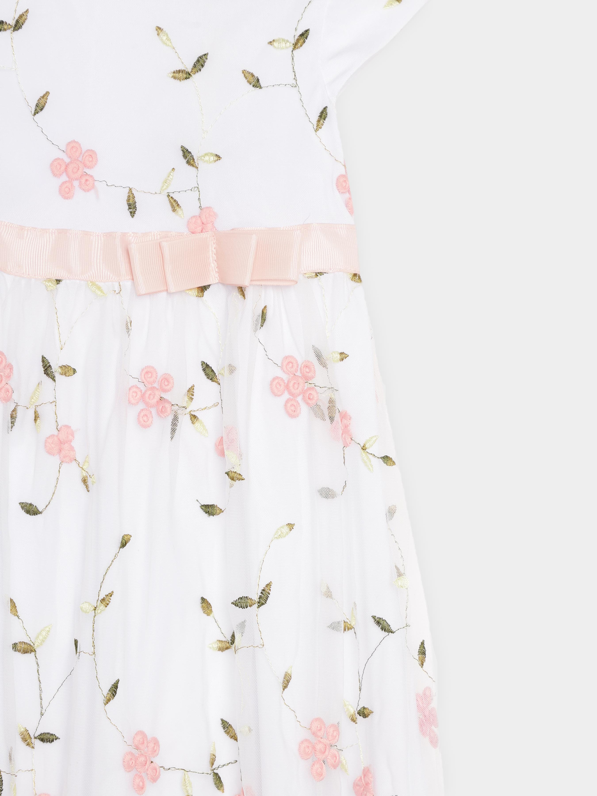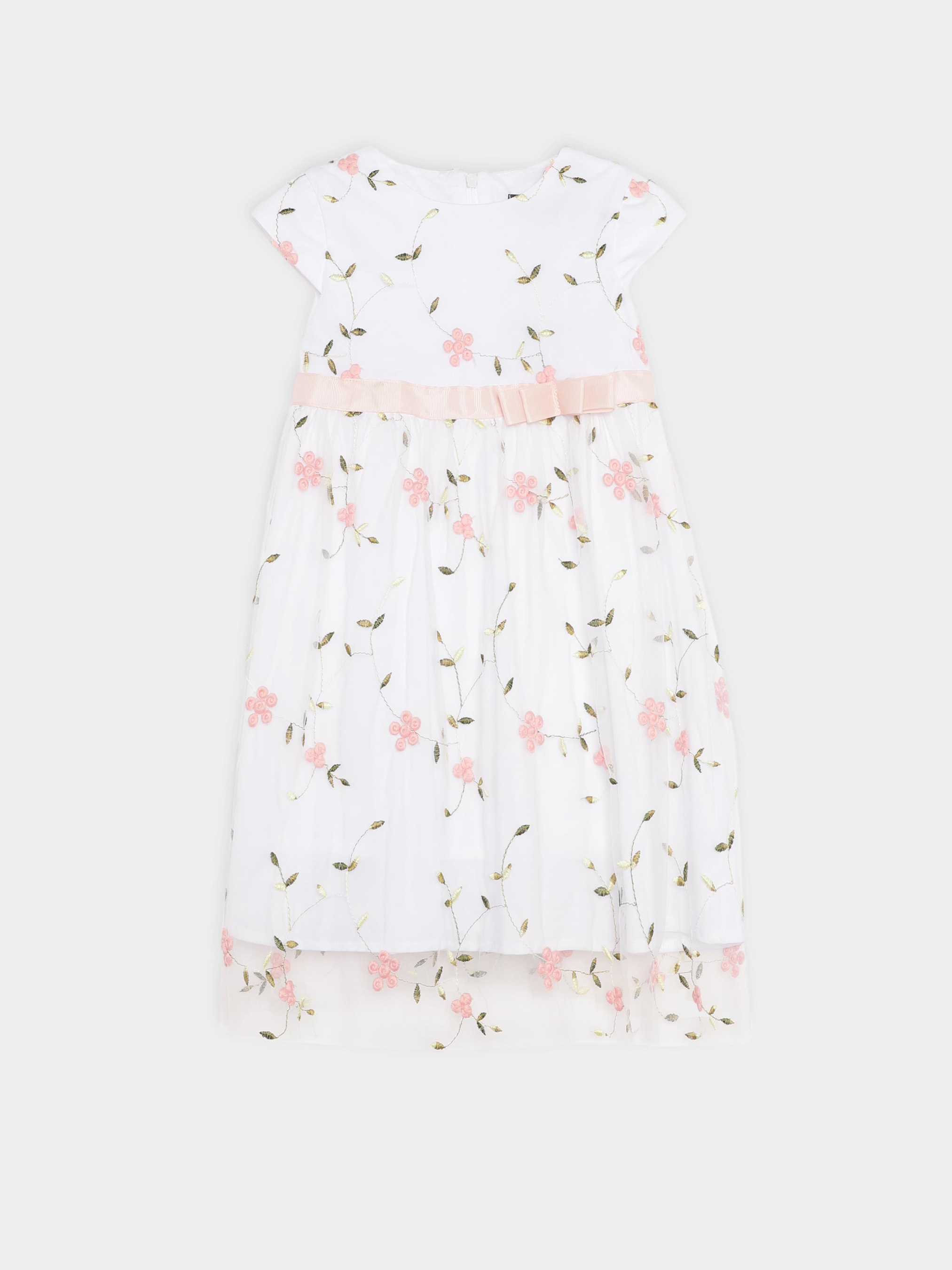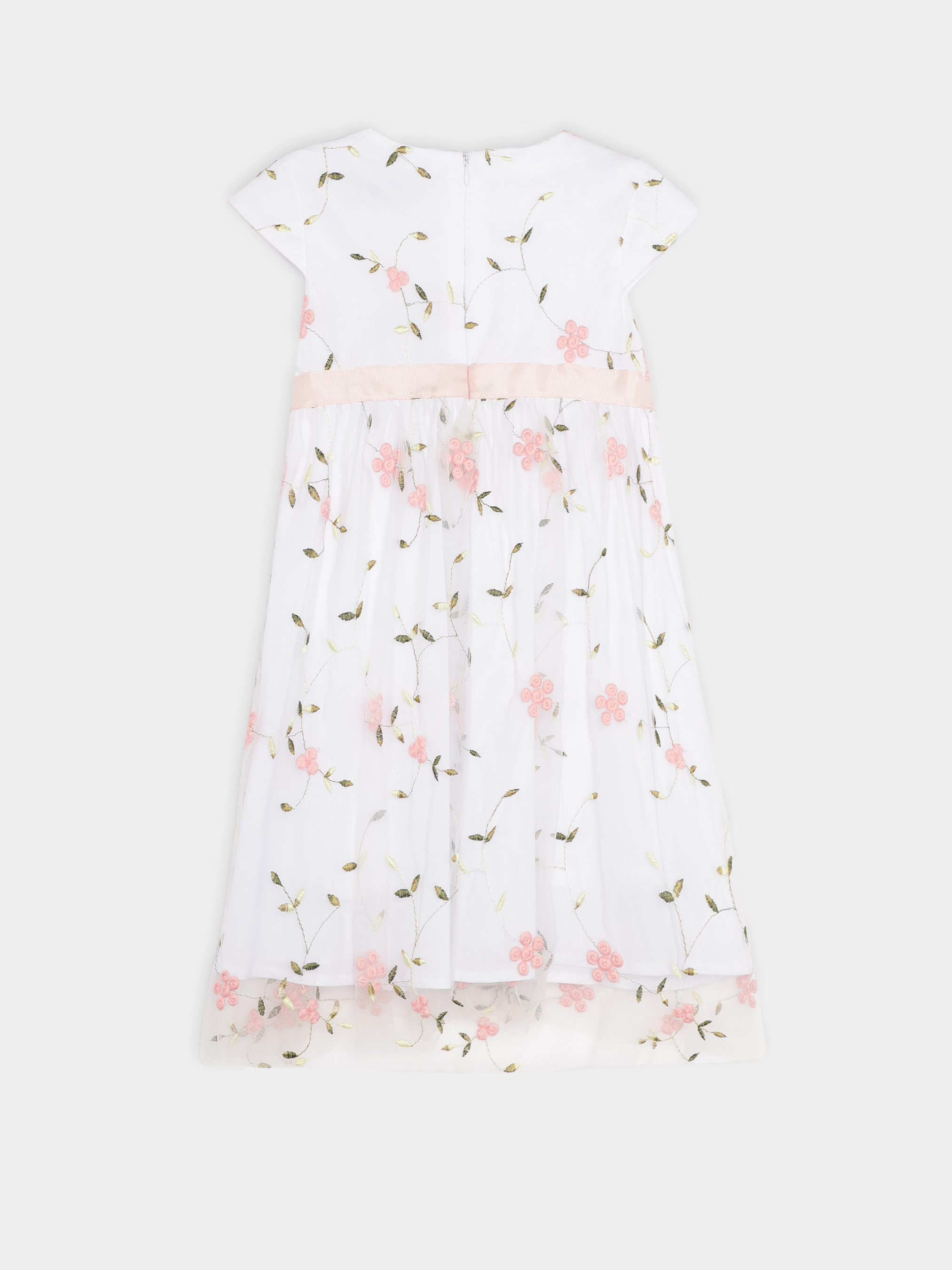 Нарядное платье в английском стиле - универсальный вариант на любое торжественное событие. Детали модели: Основной цвет платья белый. Круглая горловина с круглым вырезом. Укороченный рукав укороченный. Застежка - на спинке молния. По линии талии декорировано розовой лентой с аккуратным бантиком. Платье выполнено из атласной ткани, поверх прозрачная сетка с вышитыми розовыми цветочками. Длина изделия - до колен. Подкладка из натуральной ткани. Размерный ряд: на рост от 92 до 140 см. Состав: 20% вискоза, 80% полиэстер. Подкладка - 100% коттон Рекомендации по уходу: деликатная стирка при температуре 30 градусов *Оттенок цвета изделия на картинке может немного отличаться от реального.