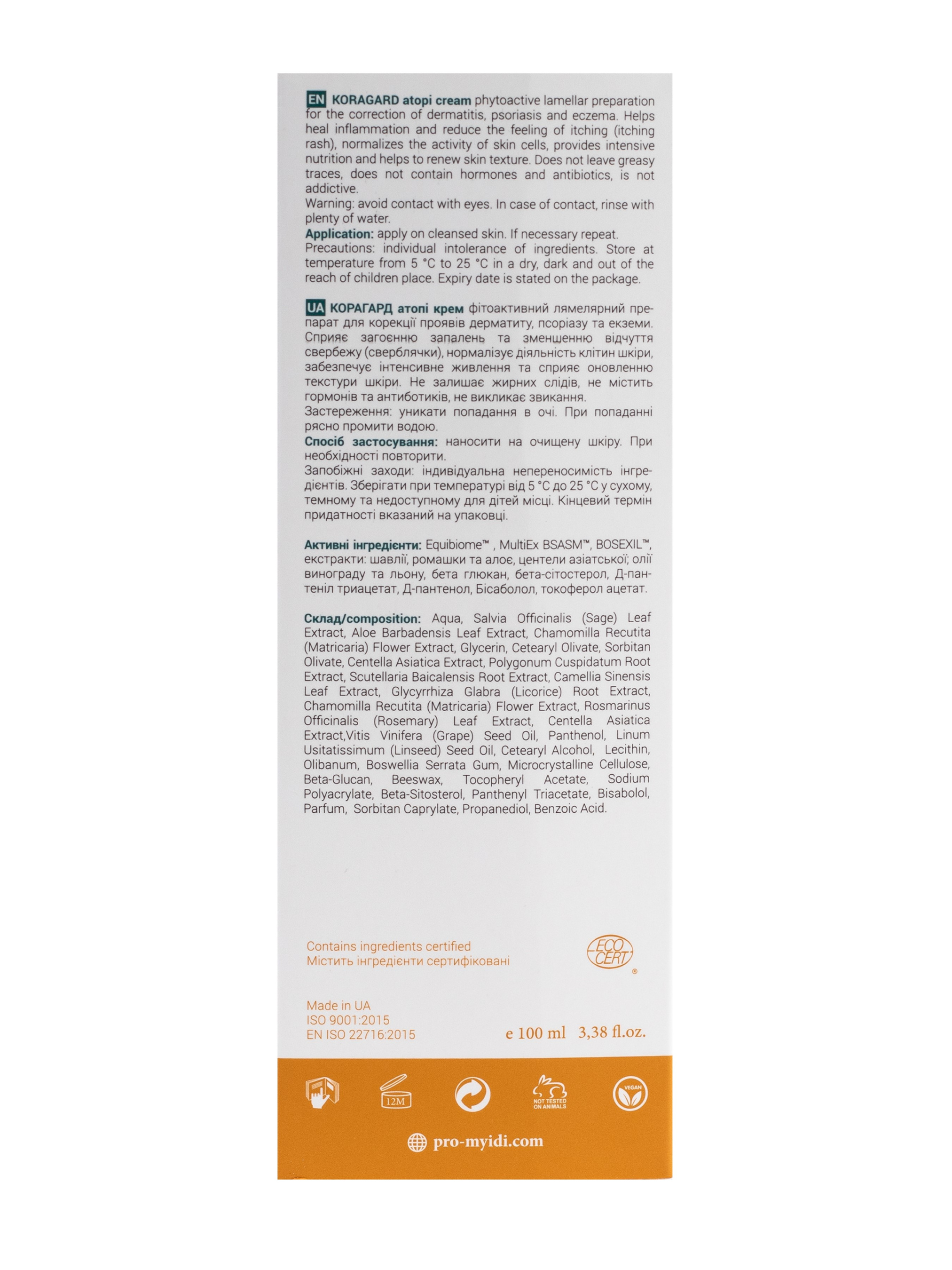 Корагард атопи крем - фитоактивный лямелярный препарат для коррекции проявлений дерматита, псориаза и экземы. Способствует заживлению воспалений и уменьшению ощущения зуда, нормализует деятельность клеток кожи, обеспечивает интенсивное питание и способствует обновлению текстуры кожи. Не оставляет жирные следы, не содержит гормонов и антибиотиков, не вызывает привыкания. Способ применения: наносить на очищенную кожу. При необходимости повторить Активные ингредиенты: Equibiome trade, MultiEx BSASM trade, BOSEXIL trade, экстракты: шалфея, ромашки и алоэ, центели азиатской; масла винограда и льна, бета-глюкан, бета-ситостерол, Д-пантенил триацетат, Д-пантенол, Бисаболол, токоферол ацетат. INCI: Aqua, Salvia Officinalis (Sage) Leaf Extract, Aloe Barbadensis Leaf Extract, Chamomilla Recutita (Matricaria) Flower Extract, Glycerin, Cetearyl Olivаte, Sorbitan Olivate, Centella Asiatica Extract, Polygonum Cuspidatum Root Extract, Scutellaria Baicalensis Root Extract, Camellia Sinensis Leaf Extract, Glycyrrhiza Glabra (Licorice) Root Extract, Chamomilla Recutita (Matricaria) Flower Extract, Rosmarinus Officinalis (Rosemary) Leaf Extract, Centella Asiatica Extract,Vitis Vinifera (Grape) Seed Oil, Panthenol, Linum Usitatissimum (Linseed) Seed Oil, Cetearyl Alcohol, Lecithin, Olibanum, Boswellia Serrata Gum, Microcrystalline Cellulose, Beta-Glucan, Beeswax, Tocopheryl Acetate, Sodium Polyacrylate, Beta-Sitosterol, Panthenyl Triacetate, Bisabolol, Parfum, Sorbitan Caprylate, Propanediol, Benzoic Acid.