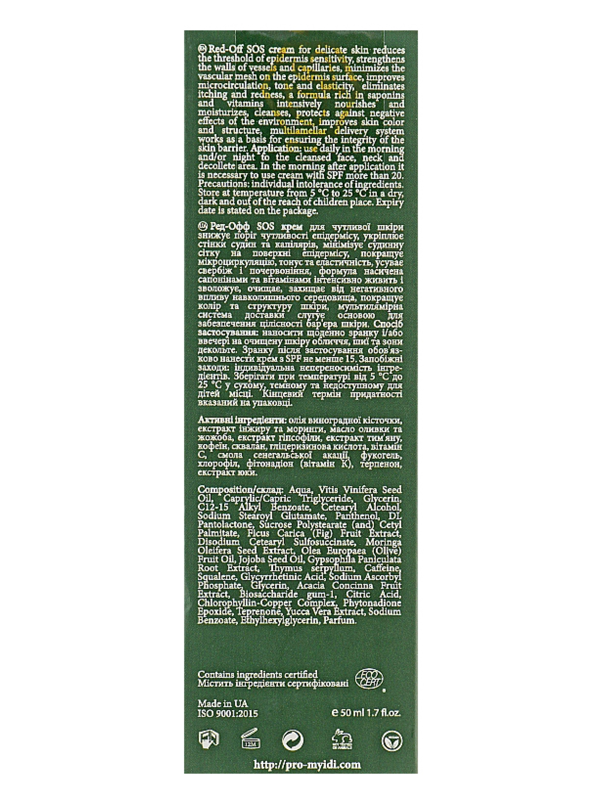 Red-off SOS cream прекрасно борется с покраснениями на коже, устраняет зуд и снижает порог чувствительности кожи благодаря растительным экстрактам гипсофилы, тимьяна и юкки. Уникальная формула крема насыщенна сапонинами и витаминами, которые интенсивно увлажняют и питают кожу, улучшая цвет лица и его структуру. Витамин К в составе крема помогает укреплять стенки сосудов, минимизирует сосудистую сетку и является мощными агентом в профилактике розацеа и купероза. Чтобы максимально защитить кожу от негативного воздействия свободных радикалов и окружающей среды, крем содержит активный антиоксидантный комплекс хлорофилла, масла жожоба и витамина С. А мультиламеллярная система доставки всех полезных компонентов крема в глубокие слои кожи обеспечивает целостность кожного барьера.