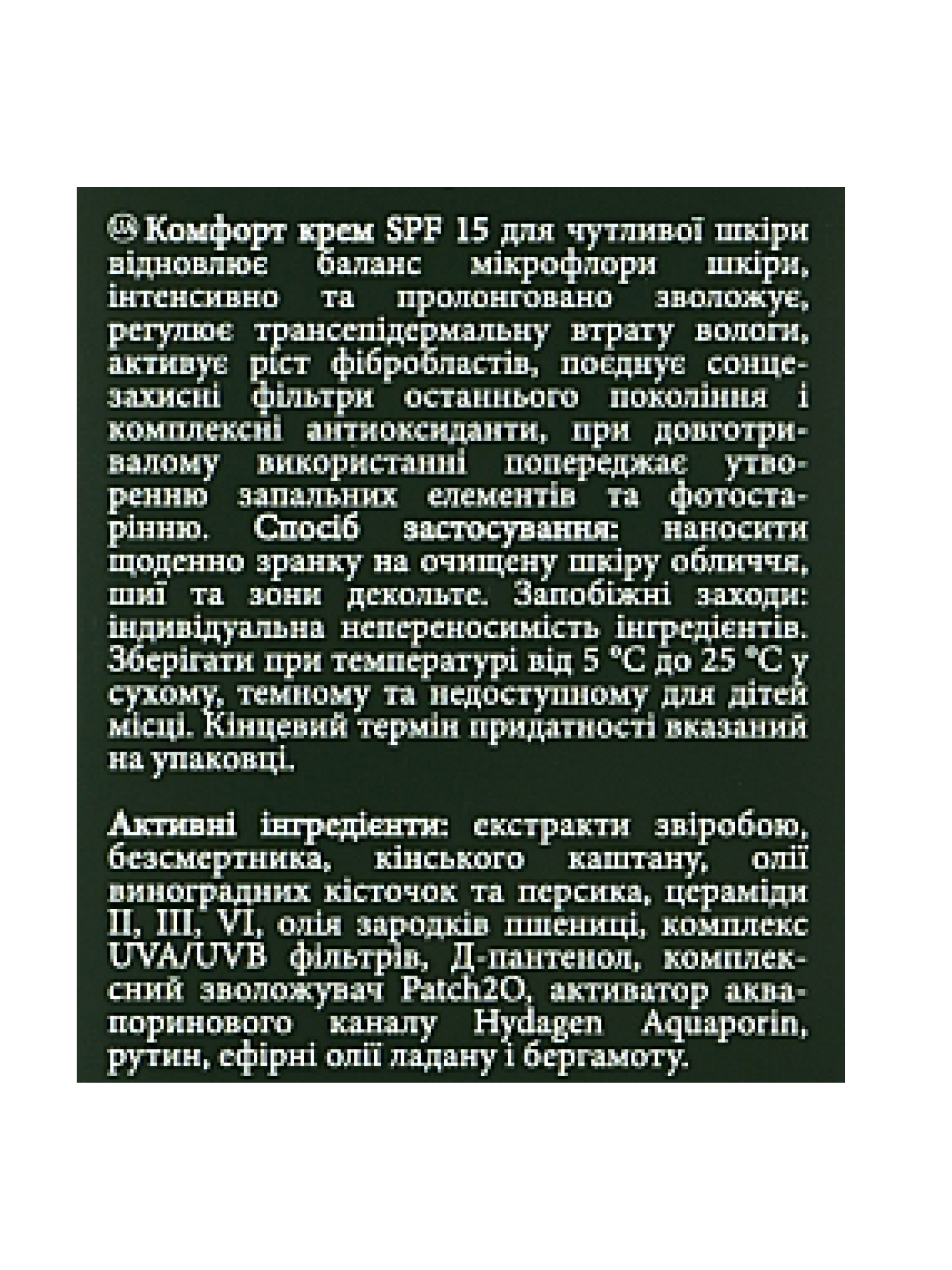 Comfort cream SPF 15 создан для восстановления баланса микрофлоры кожи. Крем содержит комплекс ценных эфирных масел виноградных косточек, персика, зародышей пшеницы и бергамота, которые интенсивно питают кожу, а в сочетании с комплексным увлажнителем Patch2O предупреждают трансэпидермальную потерю влаги кожей. Крем содержит экстракт конского каштана, он помогает улучшить кровоток, налаживает обменные процессы в коже и предупреждает разрушение гиалуроновой кислоты, сохраняя молодость кожи. Д-пантенол в составе крема усиливает антиэйдж эффект, этот компонент регулирует выработку коллагена, что важно для поддержания эластичности и упругости кожи, а в комбинации с комплексными антиоксидантами и солнцезащитными фильтрами нового поколения предотвращает фотостарение кожи.