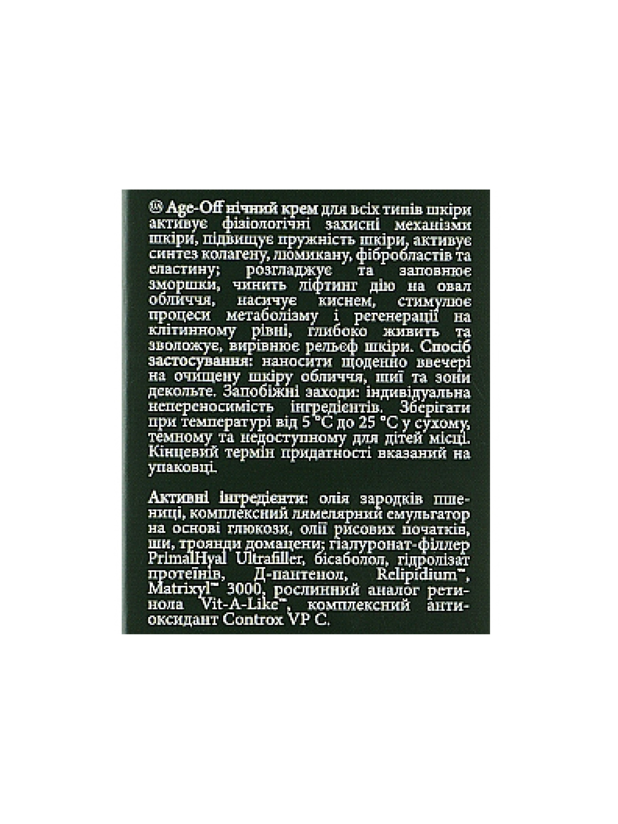 Антивозрастной ночной крем Age off night cream – уникальное антиэйдж средство. Крем активизирует защитные механизмы кожи, стимулирует процессы метаболизма и регенерации на клеточном уровне. Age off night cream содержит растительный аналог ретинола Vit-A-Like, который стимулирует синтез коллагена, фибробластов и эластина в клетках кожи. Этот ингредиент в комбинации с Д-пантенолом поддерживают эластичность и упругость кожи, разглаживая мимические морщины под глазами, около рта, на лбу, в уголках глаз. Гидролизат рисовых протеинов в комбинации с комплексом церамидов усиливает омолаживающийся эффект устраняя дряблость, подтягивая кожу и укрепляя ее барьерные функции. В составе крема присутствуют масло вечерней примулы и комплексный антиоксидант Сontrox VP C, они помогают нейтрализовать действие свободных радикалов и защищают кожу от агрессивного воздействия окружающей среды. Ваша кожа вернёт упругость и сияние всего за пару применений, так как крем содержит бисаболол, который усиливает эффективность других полезных компонентов крема.