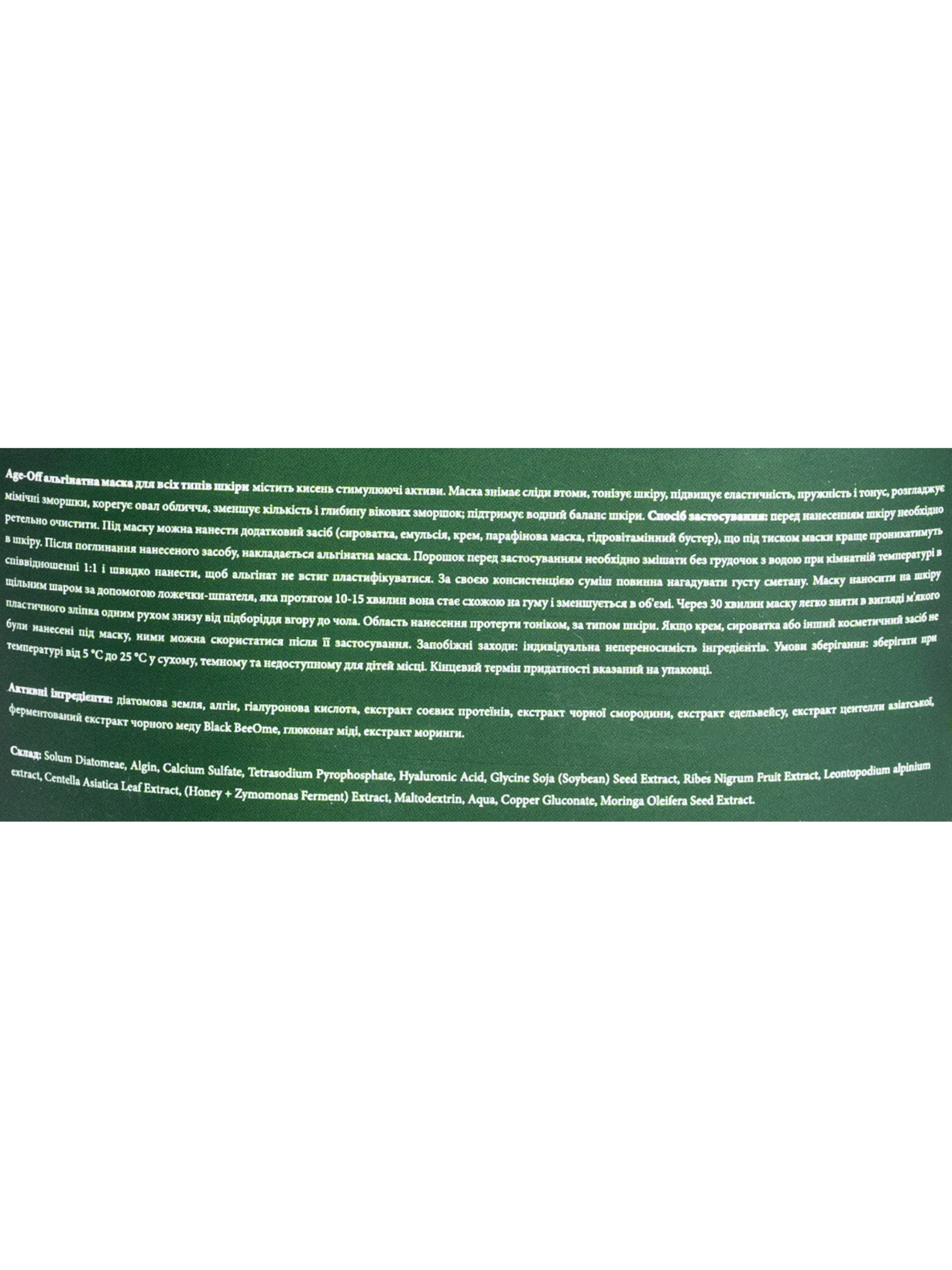 Age-off alginate mask интенсивно тонизирует кожу, основной ингредиент - мед BlackBeeOme помогает уменьшить проявление возрастных изменений кожи, в сочетании с экстрактом эдельвейса он разглаживает мимические морщины, борется с глубокими морщинами и корректирует овал лица. Экстракт черной смородины содержит большое количество витамина С, он нейтрализует действие свободных радикалов, стимулирует выработку коллагена, оказывает противовоспалительное действие. Экстракт черной смородины обладает легким отбеливающим эффектом, тонизирует, увлажняет и витаминизирует эпидермис, а центелла азиатская дополняет его действие, улучшая кровообращение и цвета лица. Диатомовая земля и алгин вместе с гиалуроновой кислотой интенсивно увлажняют и деликатно подтягивают кожу, в то время как соевые протеины обеспечивают биологический лифтинг, в то время как соевые протеины обеспечивают биологический лифтинг. Активные ингредиенты: диатомовая земля, алгин, гиалуроновая кислота, экстракт соевых протеинов, экстракт черной смородины, экстракт эдельвейса, экстракт центеллы азиатской, ферментированный экстракт черного меда Black BeeOme, глюконат меди, экстракт моринги. INCI: Solum Diatomeae, Algin, Calcium Sulfate, Tetrasodium Pyrophosphate, Hyaluronic Acid, Glycine Soja (Soybean) Seed Extract, Ribes Nigrum Fruit Extract, Leontopodium alpinium extract, Centella Asiatica Leaf Extract, (Honey + Zymomonas Ferment) Extract, Maltodextrin, Aqua, Copper Gluconate, Moringa Oleifera Seed Extract.