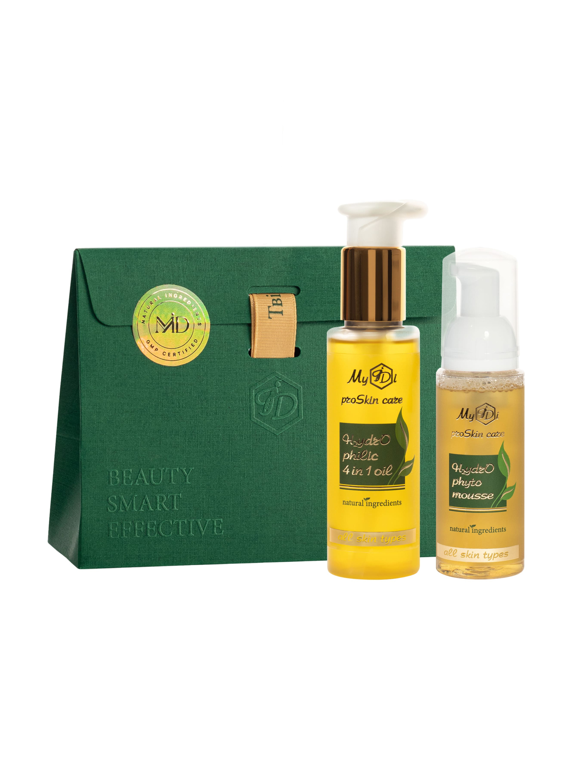 Подарочный набор для демакияжа и двухэтапного очищения с гидрофильным маслом и увлажняющим муссом MyIDi SET H2ydrOphilic 4 in 1 oil/100ml + H2ydrO phyto mousse/80ml То самое идеальное очищение с набором от MyIDi. Двухэтапное очищение является наиболее правильным и эффективным. Подходит для всех типов кожи. Этап 1: гидрофильное масло – для первичного очищения и снятия макияжа. Для эффективного удаления макияжа, себума и солнцезащитного крема следует применять очищающие продукты на основе масла или эмульсии. Масло и масляные эмульсии лучше всего расщепляют и выводят с поверхности кожи все перечисленные липидные компоненты. Гидрофильное масло H2ydrOphilic 4 in 1 oil эффективно очищает поры от загрязнений и стойкого макияжа. Масла интенсивно питают кожу лица, а гиалуроновая кислота обеспечивает необходимое увлажнение. Бисаболол в составе проявляет мощные антимикробные свойства, усиливает интенсивность проникновения других космецевтических ингредиентов. Комплекс церамидов восстанавливает липидный барьер в роговом слое эпидермиса, предотвращая потерю влаги кожей. Аллатоин положительно влияет на выработку коллагена. Этап 2: мусс – для глубокого и целевого доочищения. Когда на первом этапе мы избавились от макияжа и солнцезащитного крема, тщательное очищение на втором этапе обеспечивает полное удаление малейших остатков загрязнения и подготовит кожу для следующих этапов ухода. Очищающий увлажняющий фито мусс H2ydrO phyto mousse деликатно, бережно и глубоко очищает поры от повседневных загрязнений, а также мягко устраняет остатки косметических средств и гидрофильного масла с кожи. Содержит максимум активных ингредиентов, увлажняющих кожу, а экстракт рускуса демонстрирует прекрасный противовоспалительный и противоотечный эффект, ускоряет заживление существующих воспалительных элементов. В комбинации с L-миндальной кислотой экстракт рускуса выравнивает тон кожи и эффективно борется с нежелательной для вас пигментацией. Состав: 1. Гидрофильное масло для снятия макияжа 4 в 1 MyIDi H2YDROPHILIC 4 IN 1 OIL (100 мл) INCI: Aqua, Jojoba Seed Oil, Soybean (Soja) Bean Oil, Walnut (Juglans regia) Oil, Cannabis Sativa Seed Oil, Glycereth- 8 Esters, PEG-7 Glyceryl Cocoate, Macadamia Ternifolia (Macadamia Nut) Seed Oil, Honey, Phospholipids, Sphingolipids, Hyaluronic Acid, Sucrose Stearate, Panthenol, Dryopteris Filix-Mas Leaf Extract, Vitis Vinifera Seed Extract, Water, Propanediol, Sodium Cocoyl Glutamate, Caprylyl Glycol, Lactococcus Ferment Extract, Ethylhexylglycerin, Lactic Acid, Glucose, Urea,Urtica Dioica Leaf Extract, Glycerin, Allantoin, Bisabolol, Ascorbyl Palmitate, Parfum, Sorbitan Caprylate, Propanediol, Benzoic Acid. 2. Очищающий увлажняющий мусс MyIDi H2ydrO phyto mousse (80 мл) INCI: Aqua, Ruscus Aculeatus Root extract, Hyaluronic Acid, Matricaria chamomilla Flower Extract, Vaccinium Myrtillus, Calendula Officinalis Extract, Sophora Extract, Glycerin, Betaine, Horse Chestnut Extract, Armeniaca vulgaris extract, Panthenol, Lactic Acid, Lavanula Angustifolia Mill, Aloe Barbadensis Leaf Juice, Biosaccharide gum-1, PEG-7 glyceryl cocoate, L-Mandelic Acid, D-panthenol, Rosmarinus Officinalis, Geranium Essential Oil, Prunus avium, Aesculus hippocastanum Extract, Benzyl Аlcohol, Tocopheryl Acetate, Parfum.