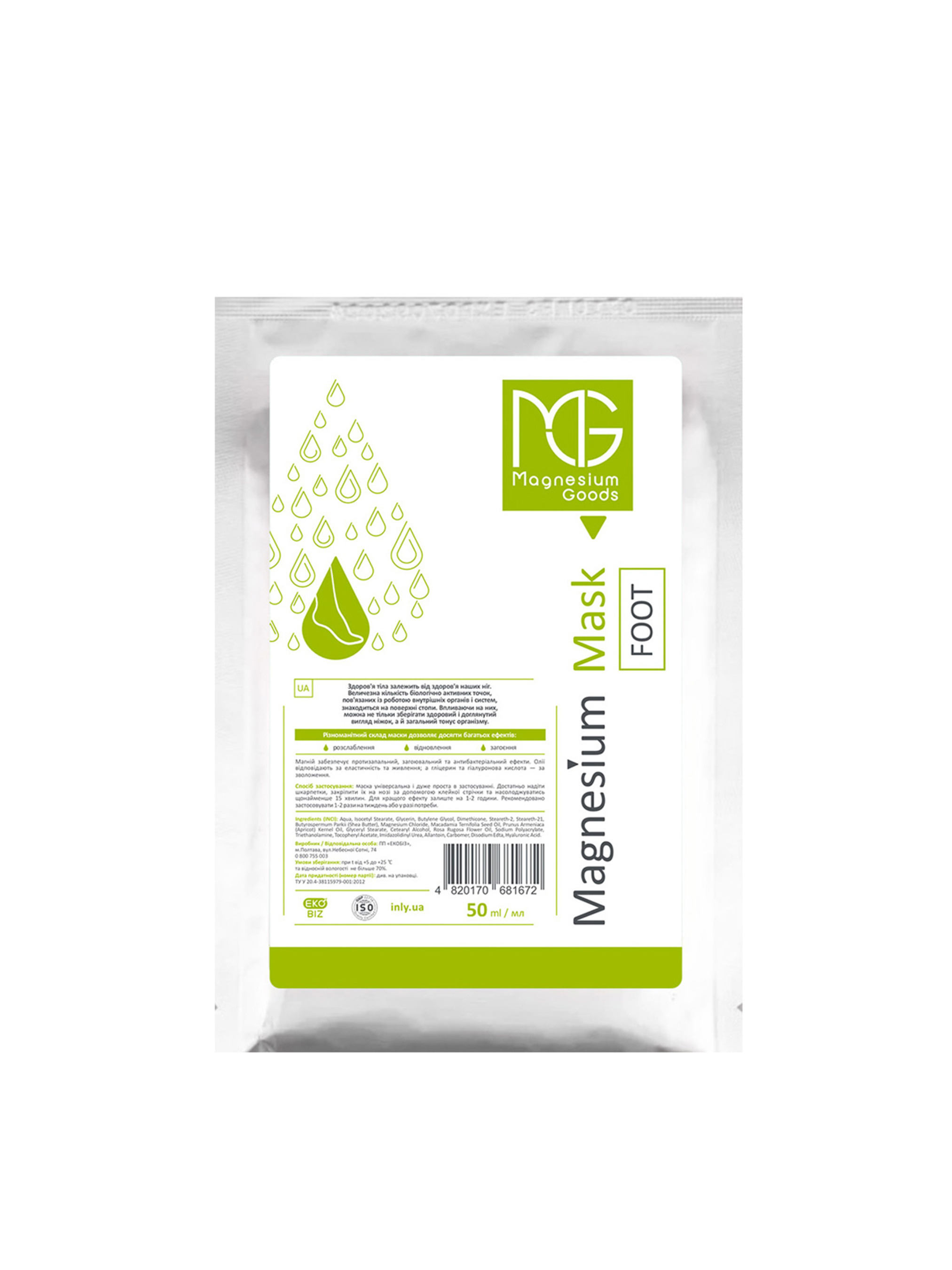 Magnesium Foot Mask — удобная маска-носочки, которые обеспечивают питание и смягчение кожи, помогают сохранить педикюр в безупречном состоянии и дарят приятные минуты отдыха. Обеспечивает ощущение легкости в ногах, способствует расслаблению Увлажняет и питает кожу ног, насыщая ее магнием Улучшает качество отдыха благодаря своему благоприятному воздействию Помогает сохранять кожу стоп мягкой и гладкой, насыщая ее влагой и питательными веществами Продлевает долговечность педикюра Основные активные ингредиенты: масло ши, хлорид магния, масло макадамии, мочевина, масло абрикосовых косточек. Способ применения Наденьте маску-носочки на чистые стопы, зафиксируйте их с помощью ленты и примите комфортное положение. Наслаждайтесь процедурой в течение 15-20 минут — это идеальное время, которое можно совместить с маской для лица. Для максимального эффекта оставьте маску на 1-1,5 часа или на всю ночь. Сроки и условия хранения указаны на упаковке. Состав INCI Aqua, Isocetyl Stearate, Glycerin, Butylene Glycol, Dimethicone, Steareth-2, Steareth-21, Butyrospermum Parkii (Shea Butter), Magnesium Chloride, Macadamia Ternifolia Seed Oil, Prunus Armeniaca (Apricot) Kernel Oil, Glyceryl Stearate, Cetearyl Alcohol, Rosa Rugosa Flower Oil, Sodium Polyacrylate, Triethanolamine, Tocopheryl Acetate, Imidazolidinyl Urea, Allantoin, Carbomer, Disodium Edta, Hyaluronic Acid