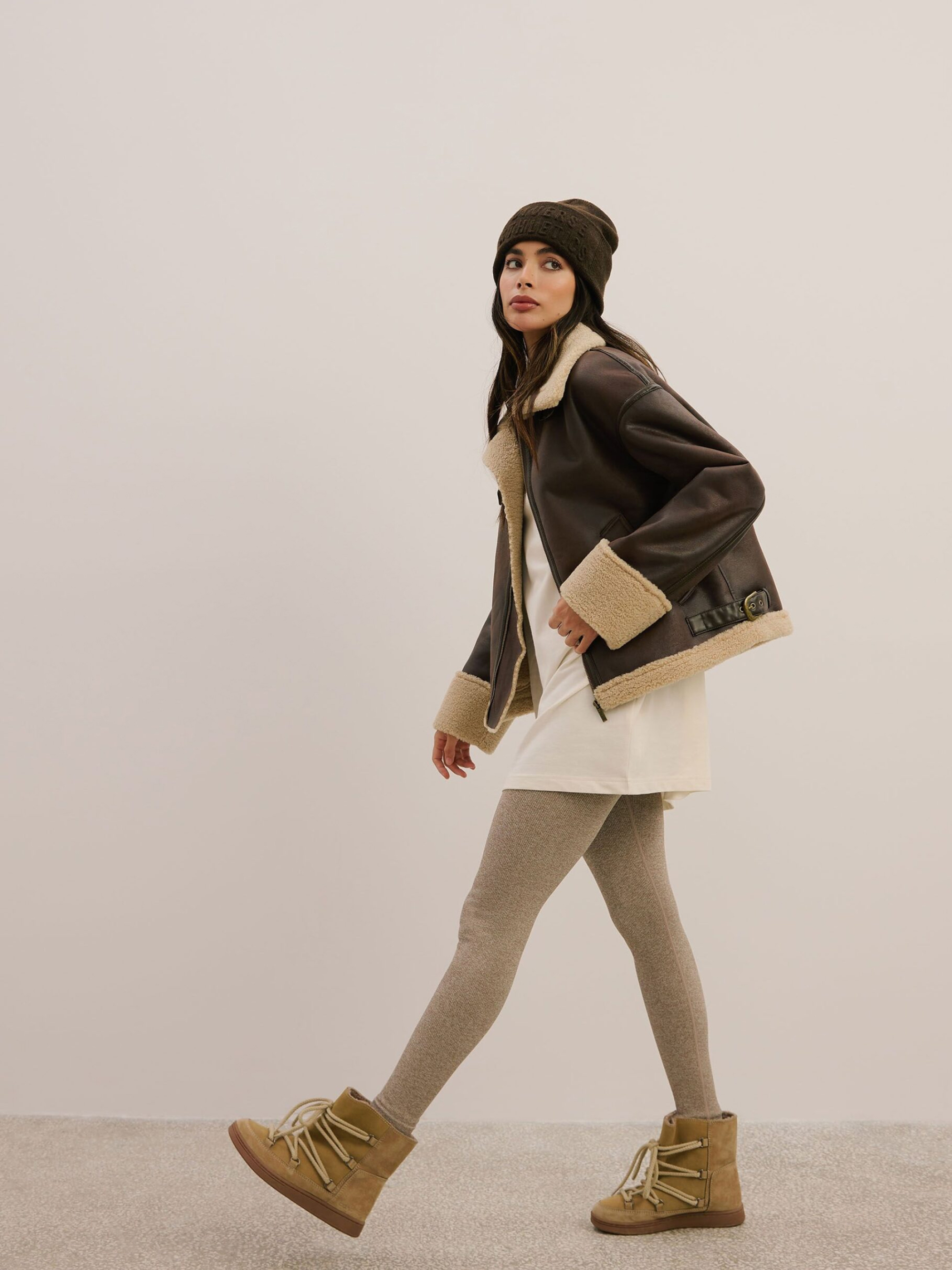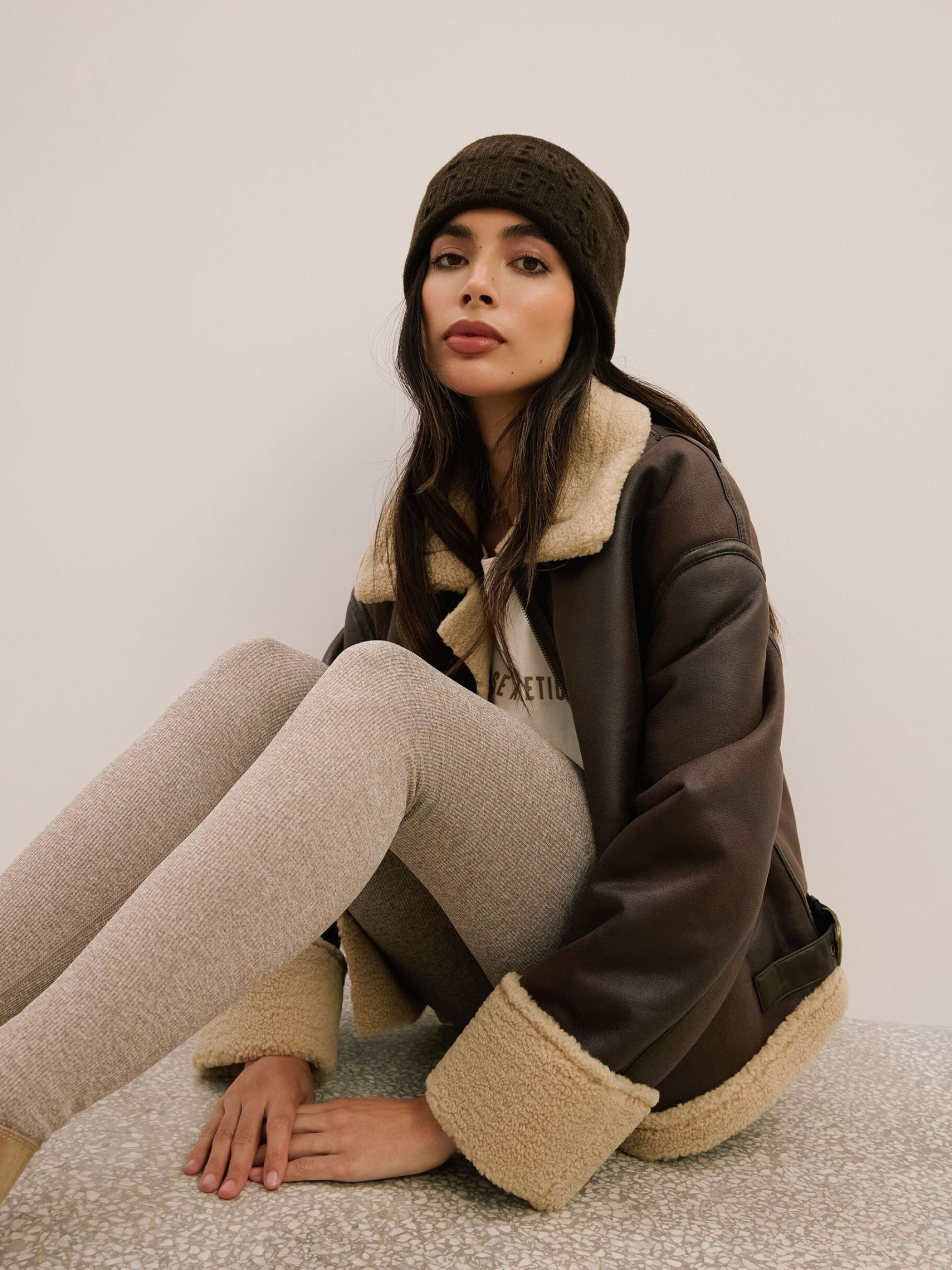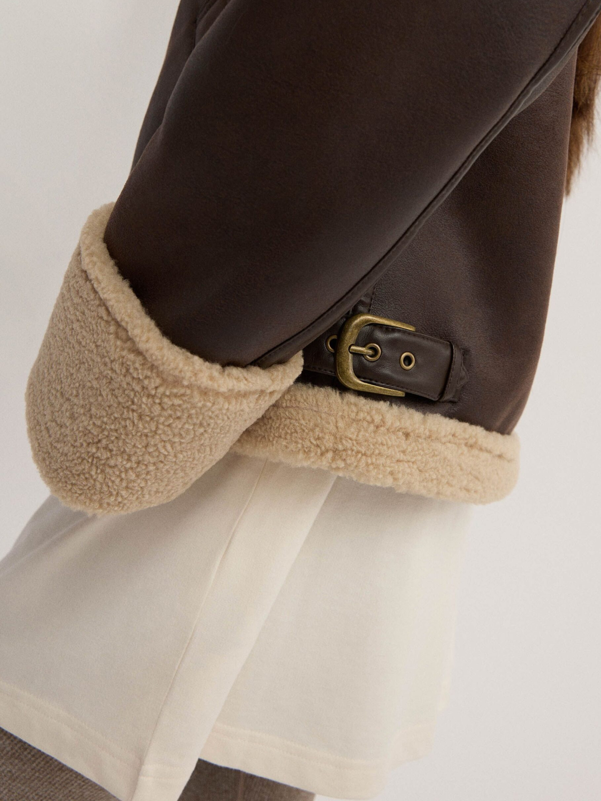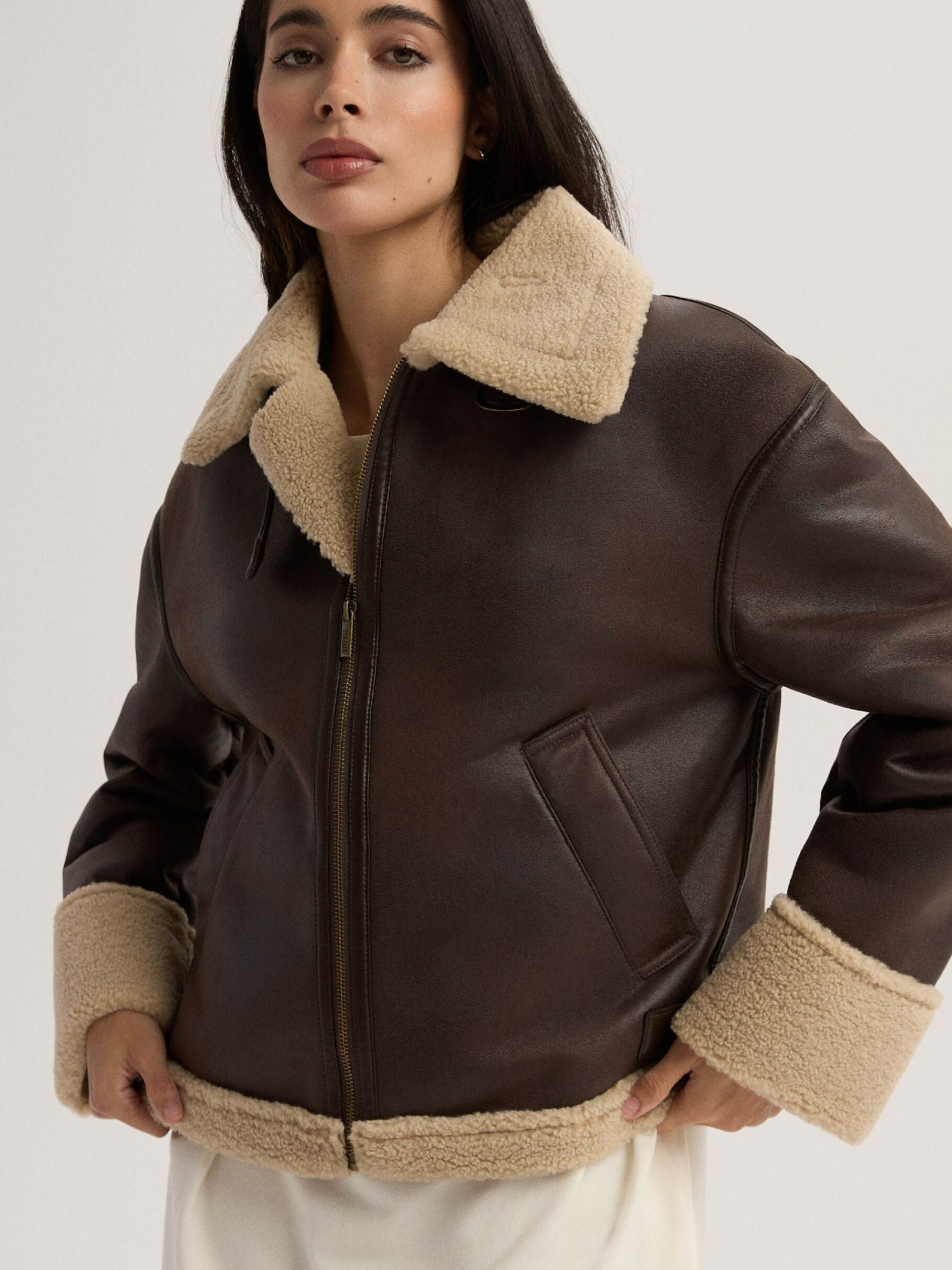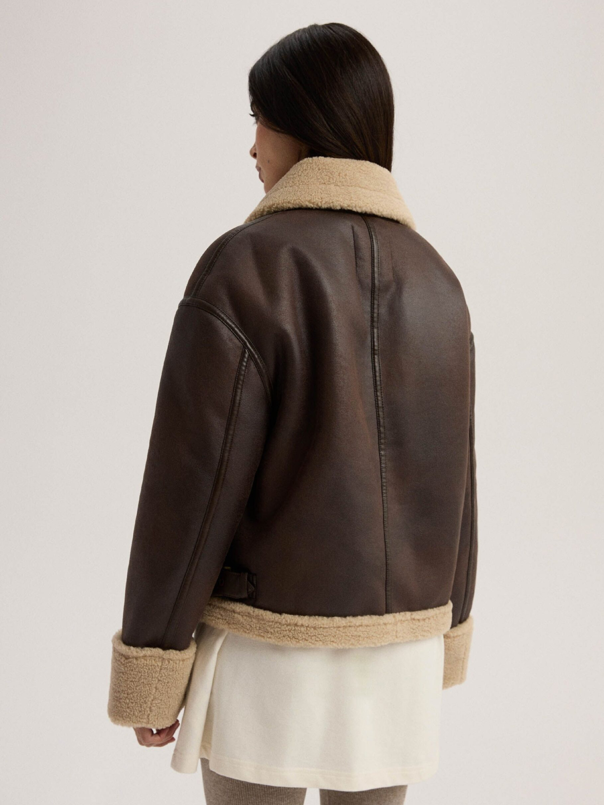 Женская куртка из экокожи и мягкого меха SHEARLISSA / ID: 10047961 Теплая коричневая куртка, идеальная для прохладных дней: - классический фасон бомбер, - большой воротник, - два косых кармана, - металлическая молния, – декоративные швы. Наружный состав 100% полиэстер Уход: - не стирать - не отбеливать - не сушить в сушильной машине - не гладить - не подвергать химчистке Размер: XS S М L XL Длина по центру спинки: 58 58 60 62 64 Ширина снизу: 53 55,5 58 60,5 63 Ширина подмышками: 55 57,5 60 62,5 65 Длина рукава: 55 55 56,5 58 59,5