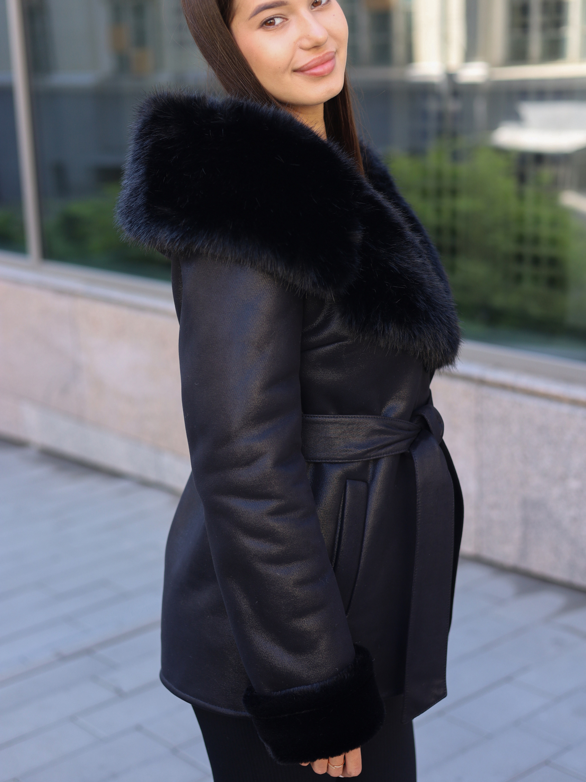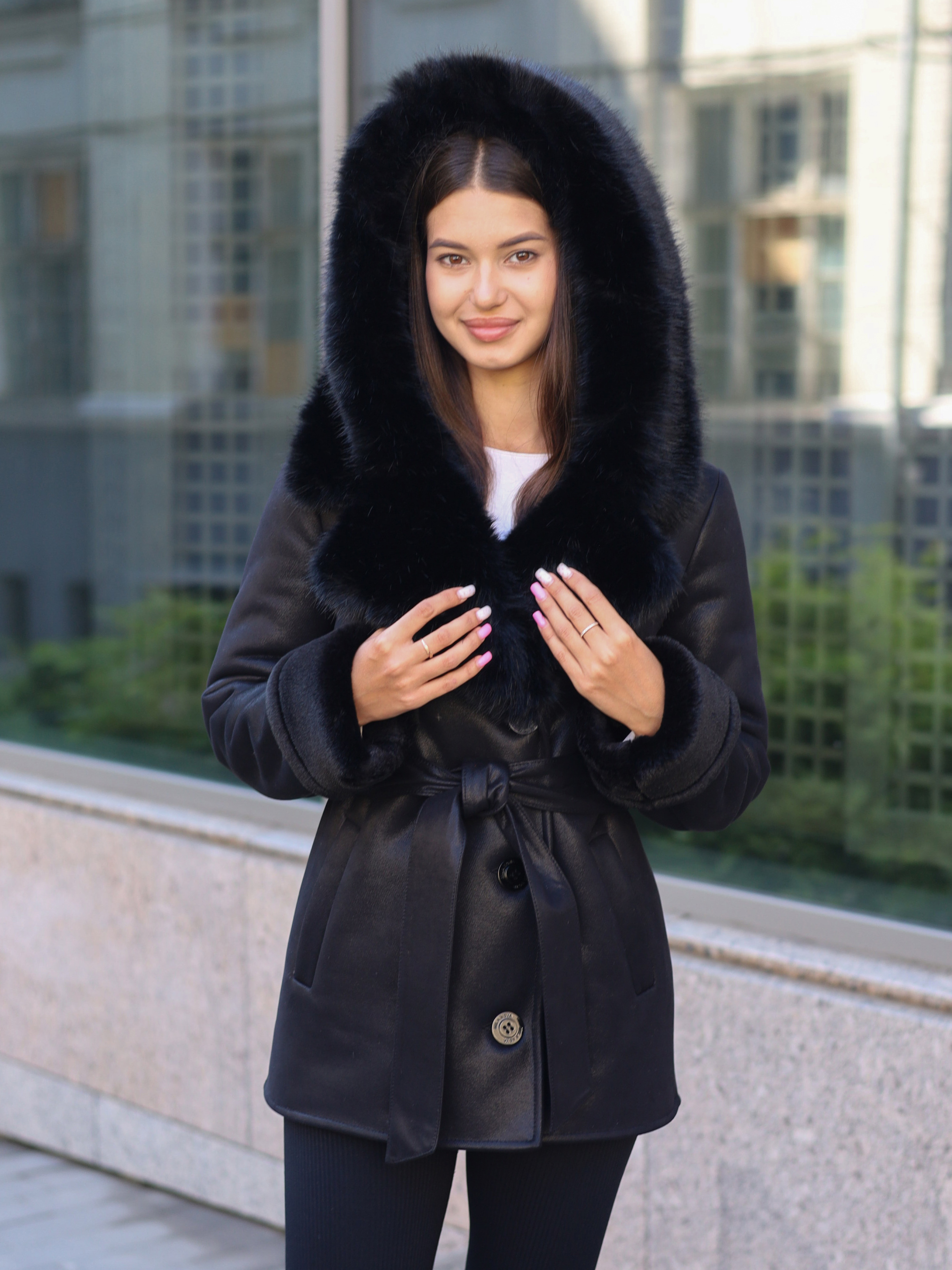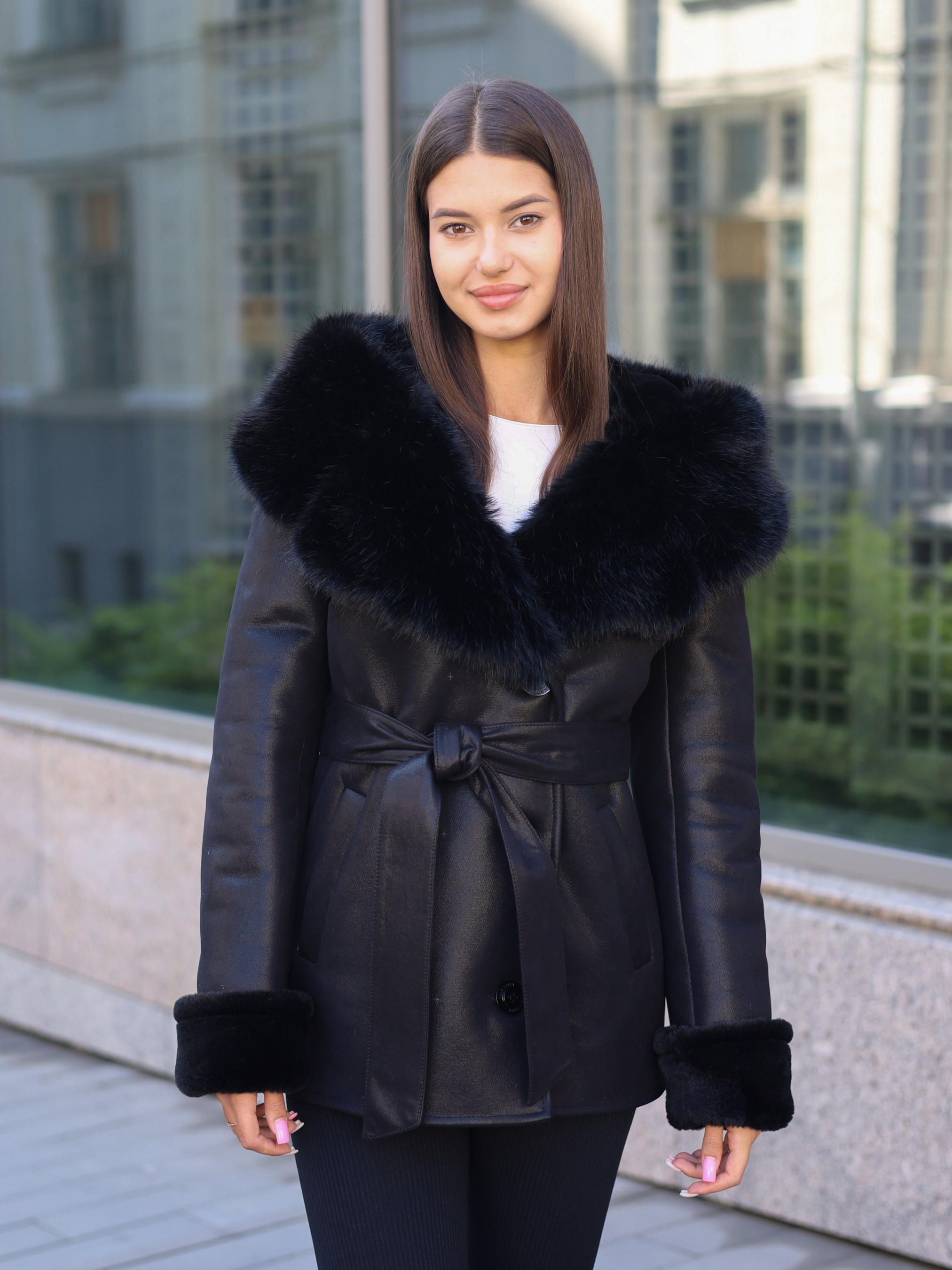 Женская дубленка из экоматериала Стильная дубленка из экоматериала высокого качества. Имеет водоотталкивающее покрытие — защищает от влаги и ветра. Капюшон с мягким экохутром обеспечивает тепло и комфорт. Прямой силуэт создает аккуратный, элегантный вид. Втачный рукав и регулируемые манжеты добавляют удобства. Откладной воротник придает классический стиль. Застежка на пуговицы - практичная и долговечная. Карманы-листочки сохраняют лаконичный дизайн. Пояс в комплекте позволяет подчеркнуть талию. Состав: Верх - 100% полиэстер Параметры: Рост модели — 170 см Длина изделия по спинке — 71 см Длина рукава - 71 см (регулируется манжетой) На фото - размер 44 (S) Преимущества модели: Универсалая овчинка на осень и зиму Сочетает стиль и функциональность Подходит для любого типа фигуры Устойчив к влаге и легко чистится Не теряет форму после стирки