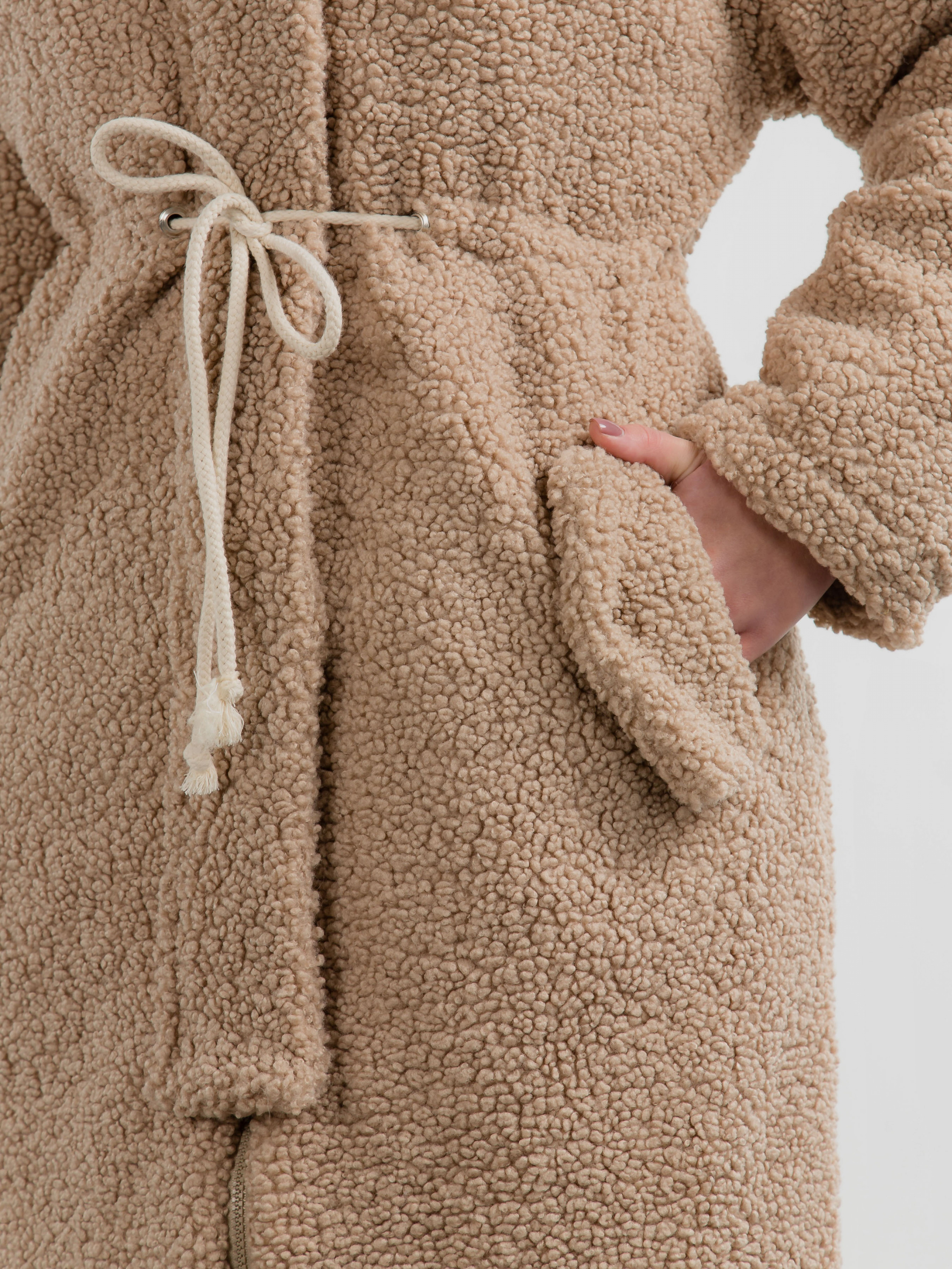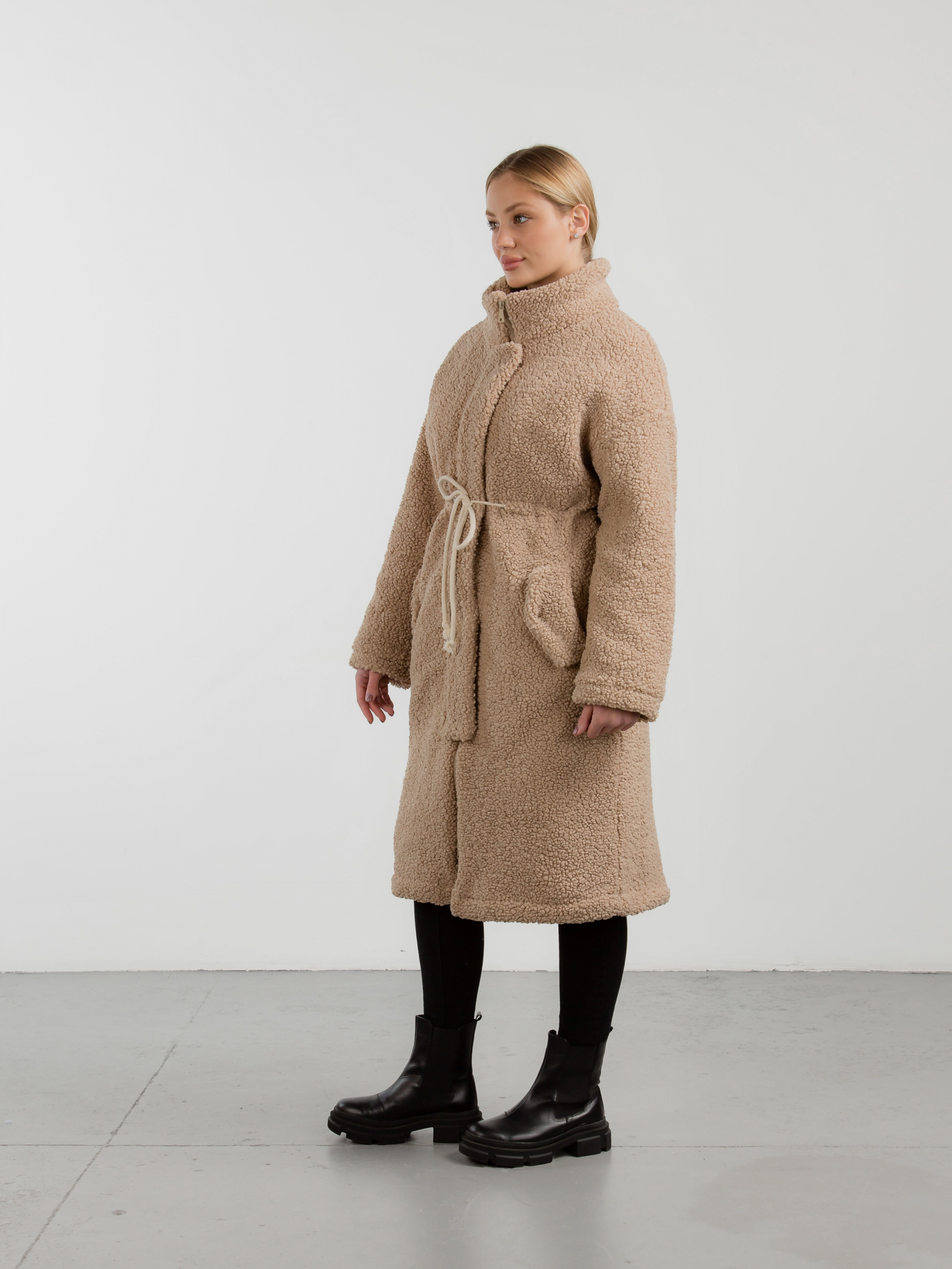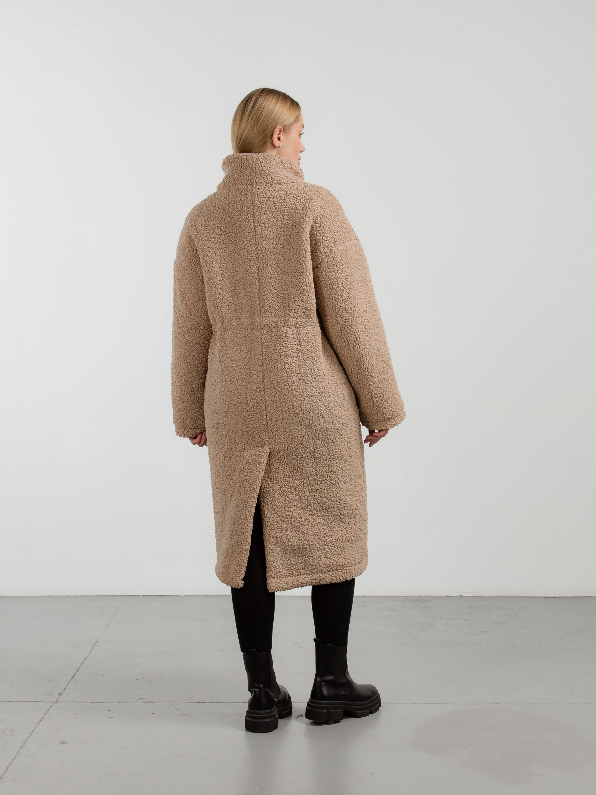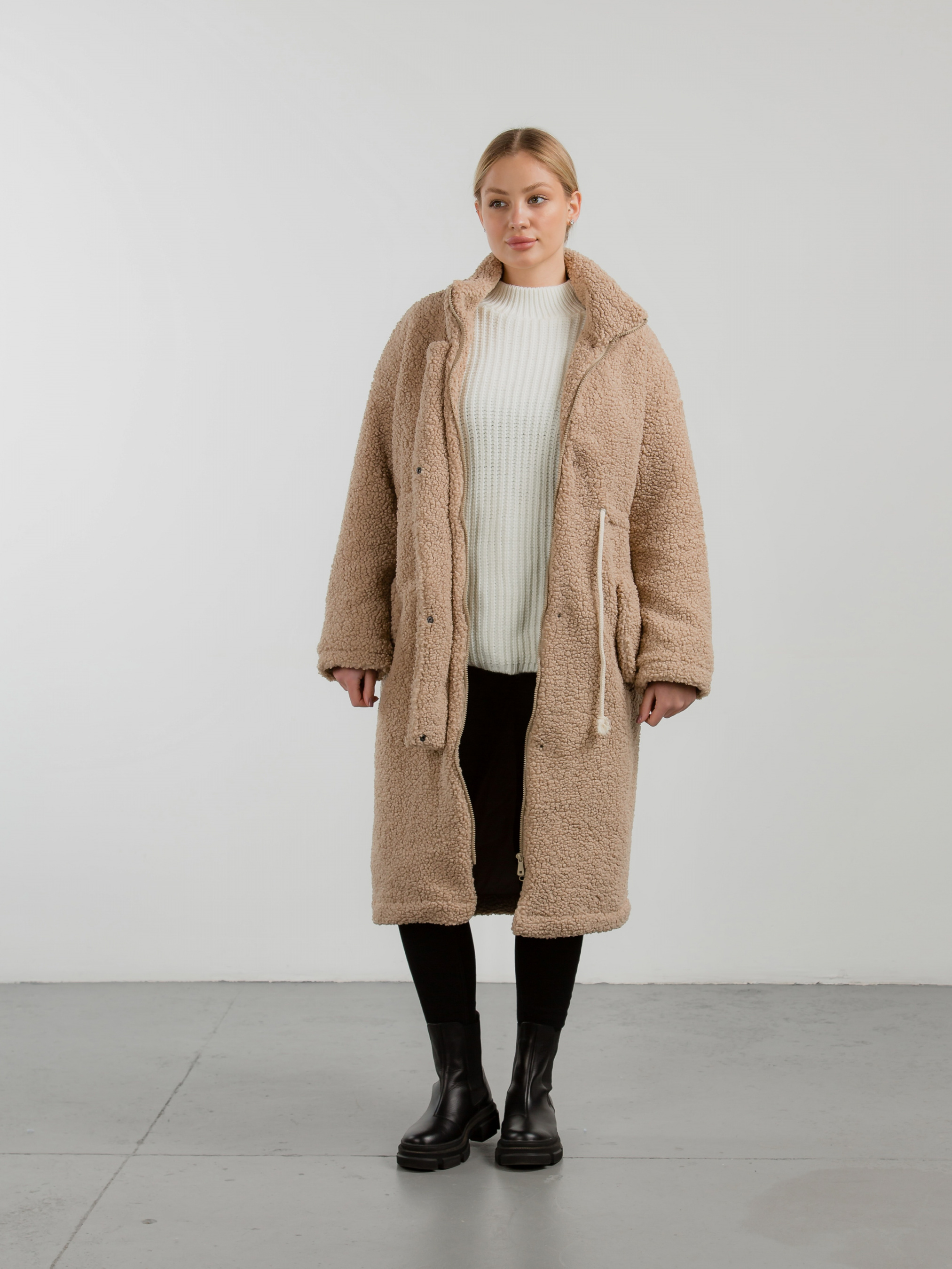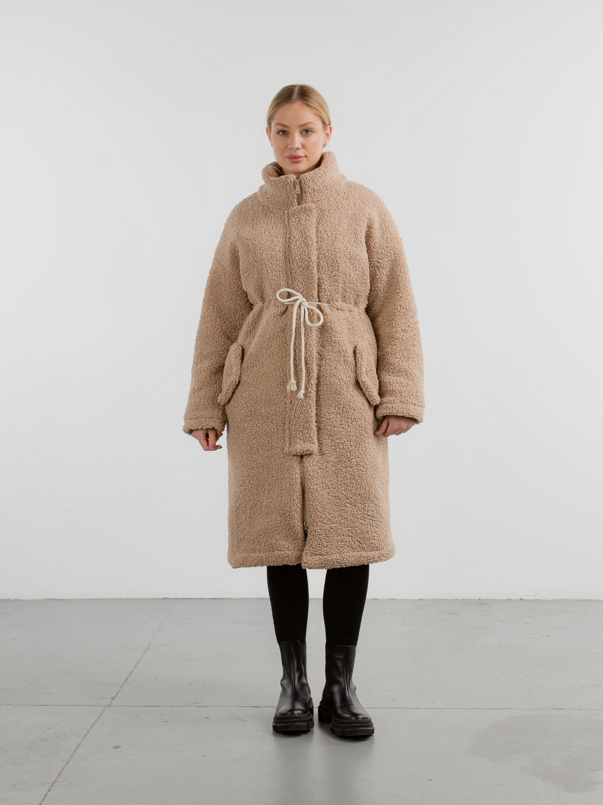 Тёплая длинная шуба прямого силуета. Воротник стойка, застёжка на молнии закрывается планкой на кнопках. Прорезные кармашки на флисе с декоративным клапаном. На талии вставка со шнуром, затянув который можна подчеркнуть талию. Наполнитель, который не даст замерзнуть в погоду до -20 градусов. XS-S