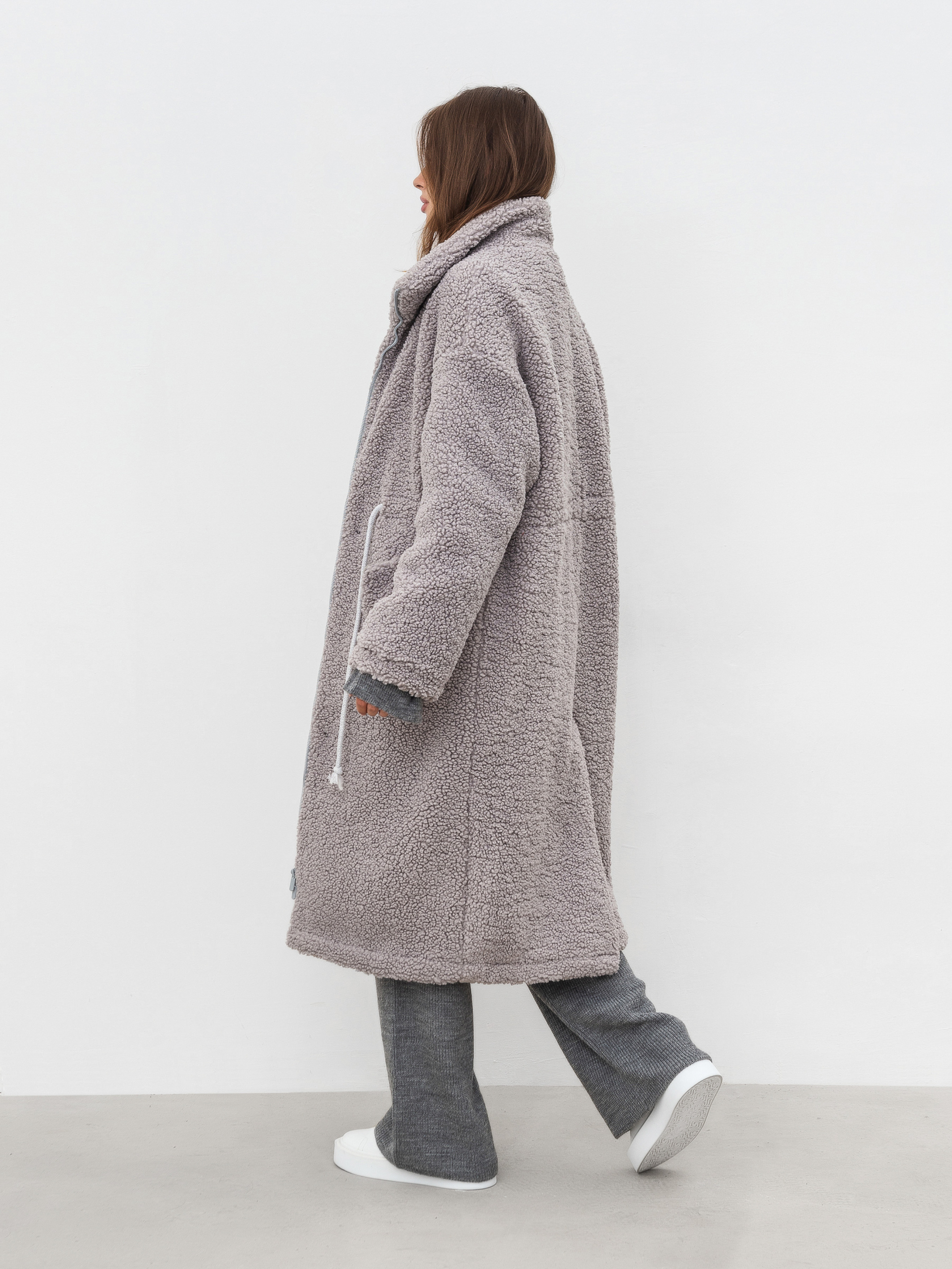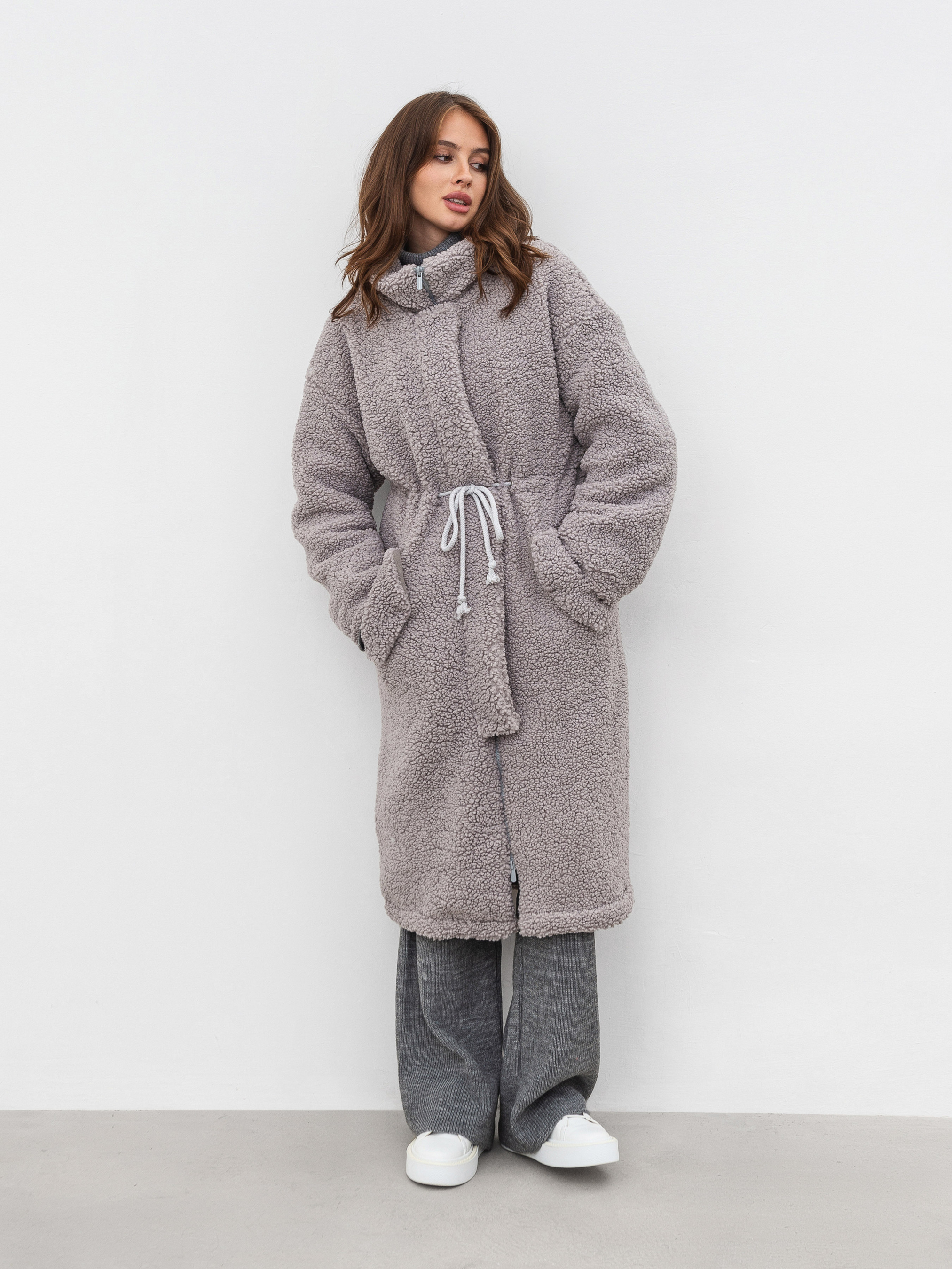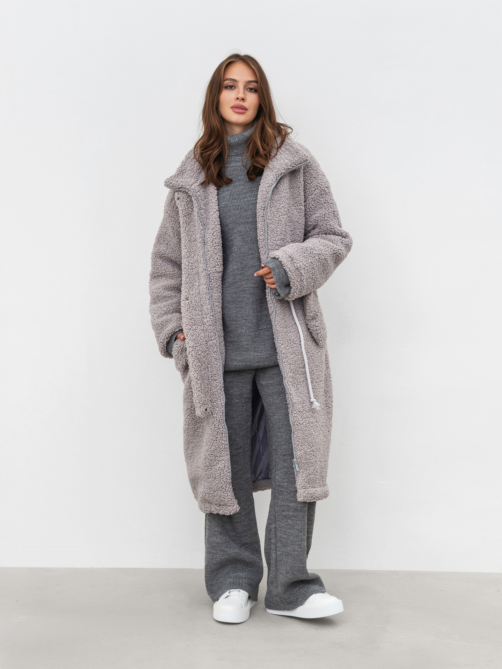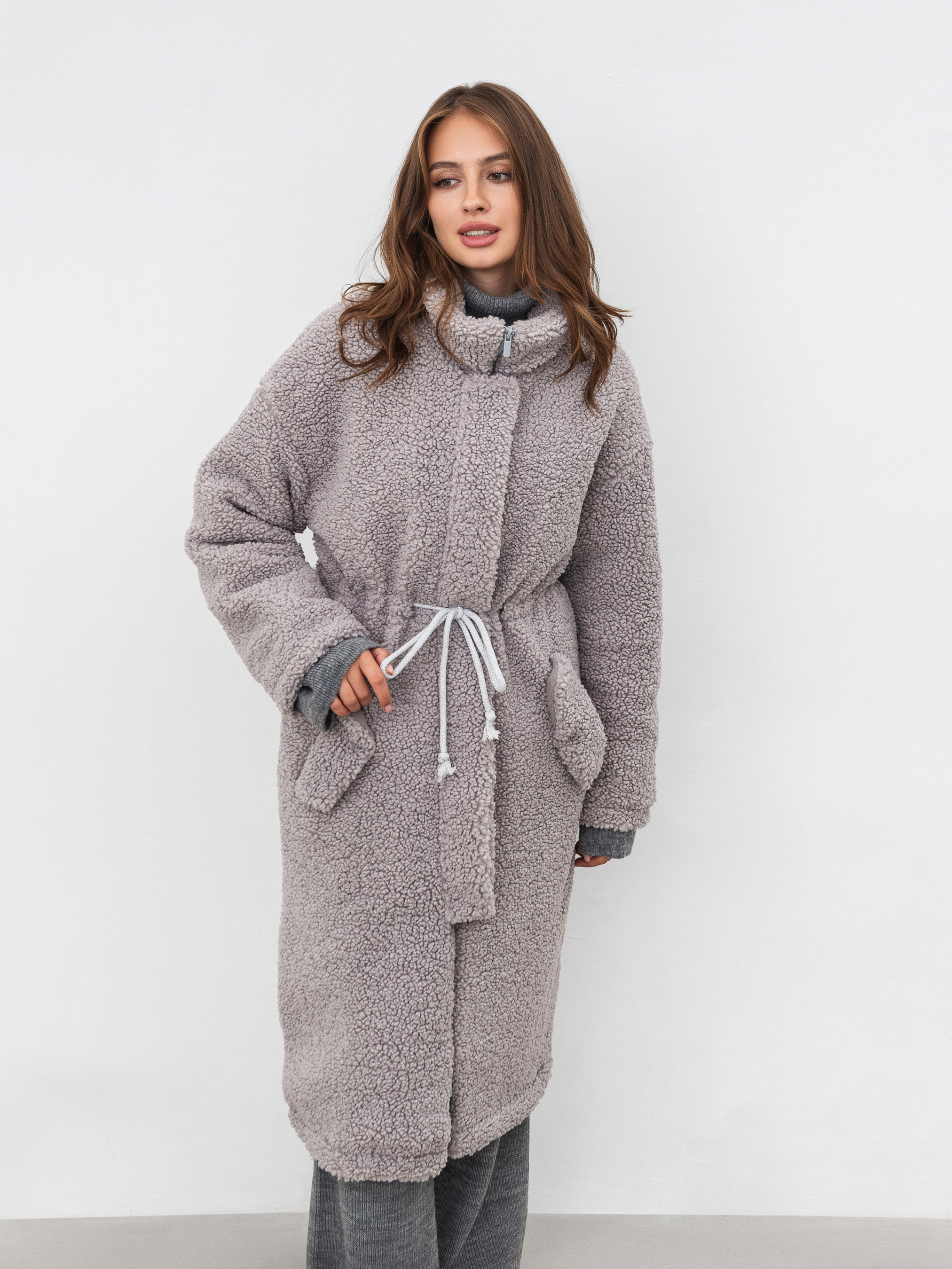 Тёплая длинная шуба прямого силуета. Воротник стойка, застёжка на молнии закрывается планкой на кнопках. Прорезные кармашки на флисе с декоративным клапаном. На талии вставка со шнуром, затянув который можна подчеркнуть талию. Наполнитель, который не даст замерзнуть в погоду до -20 градусов. XS-S