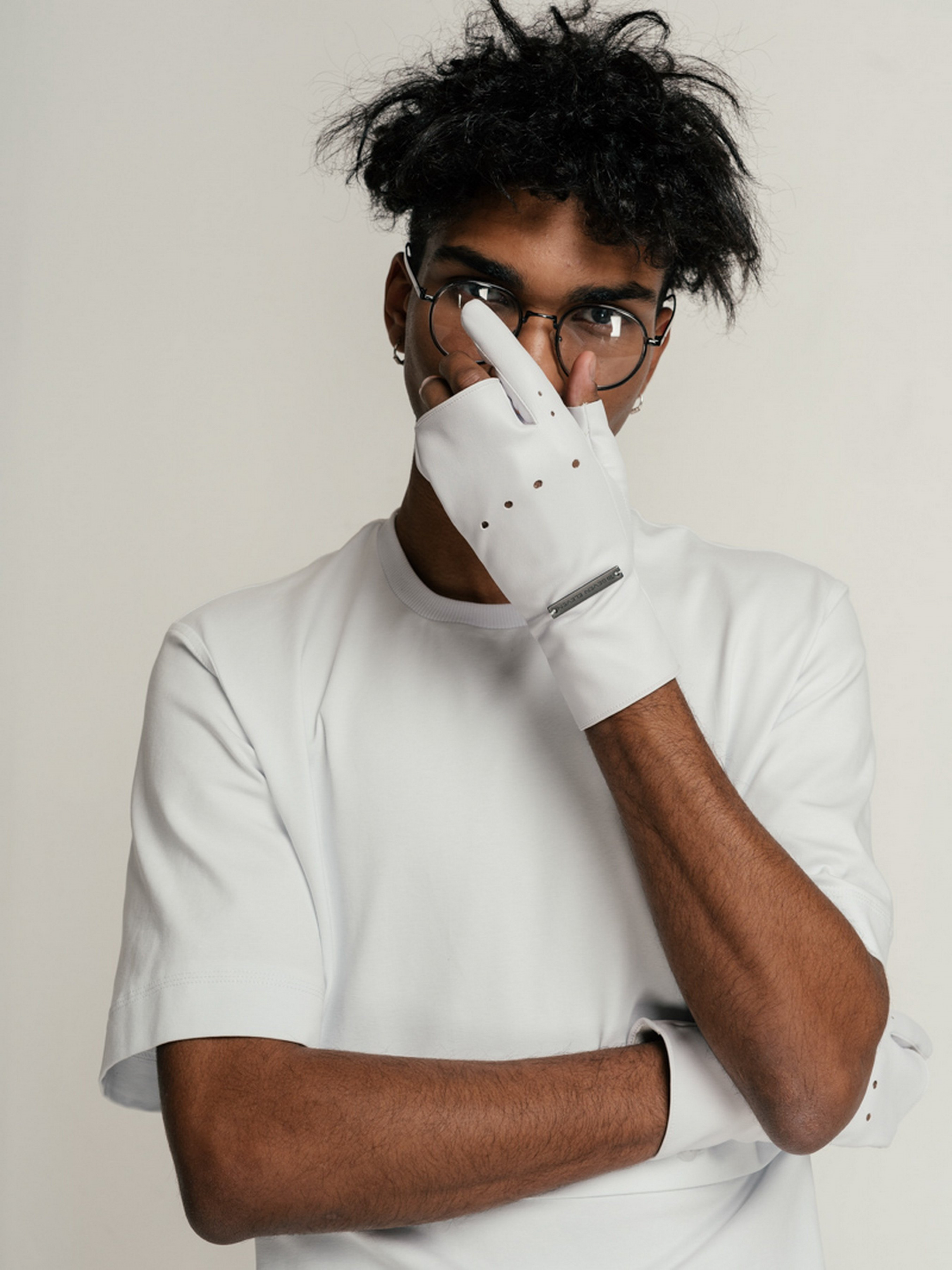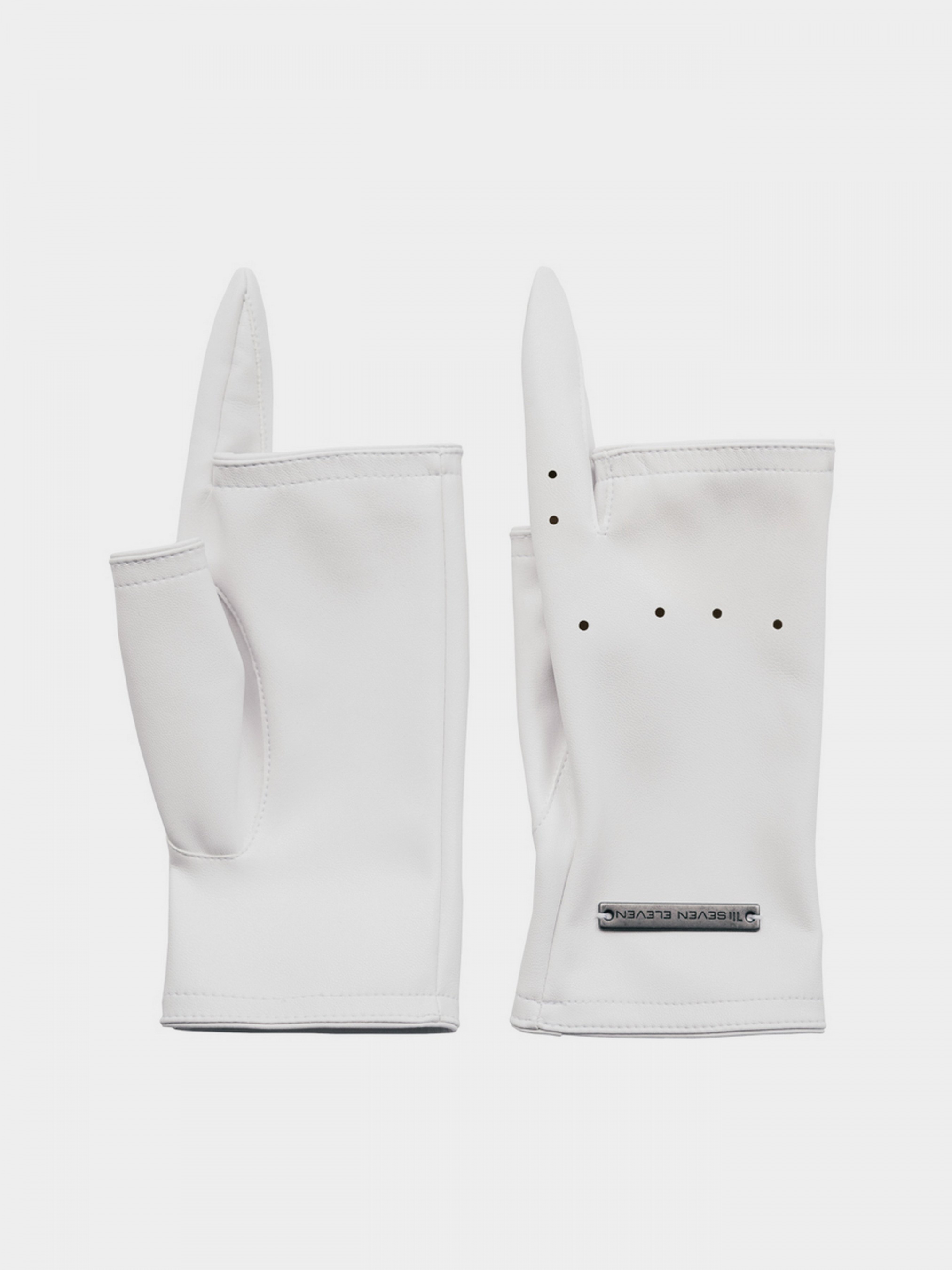 Перчатки короткие с 4 обрезанными пальцами выполнены из веганской кожи.