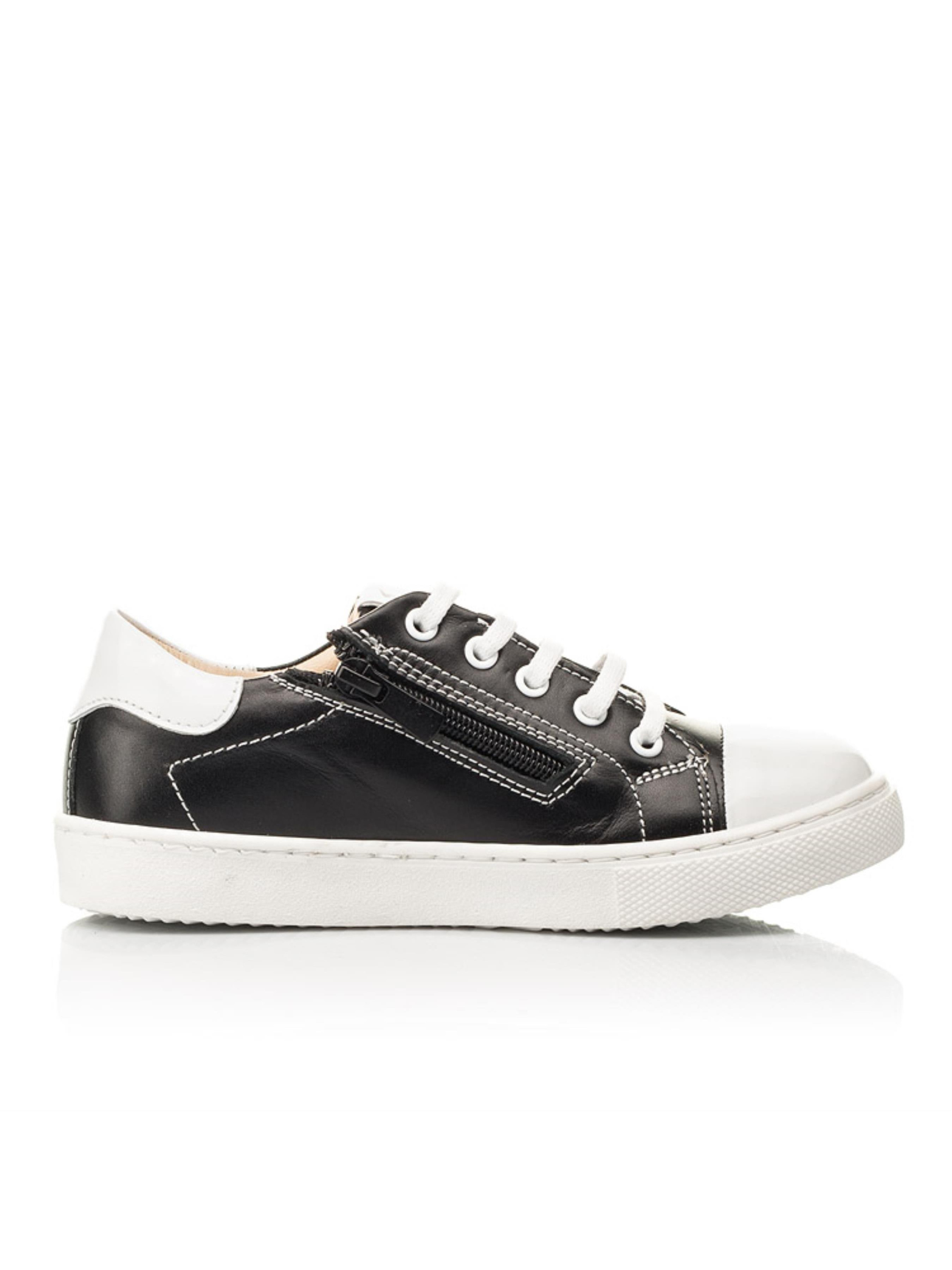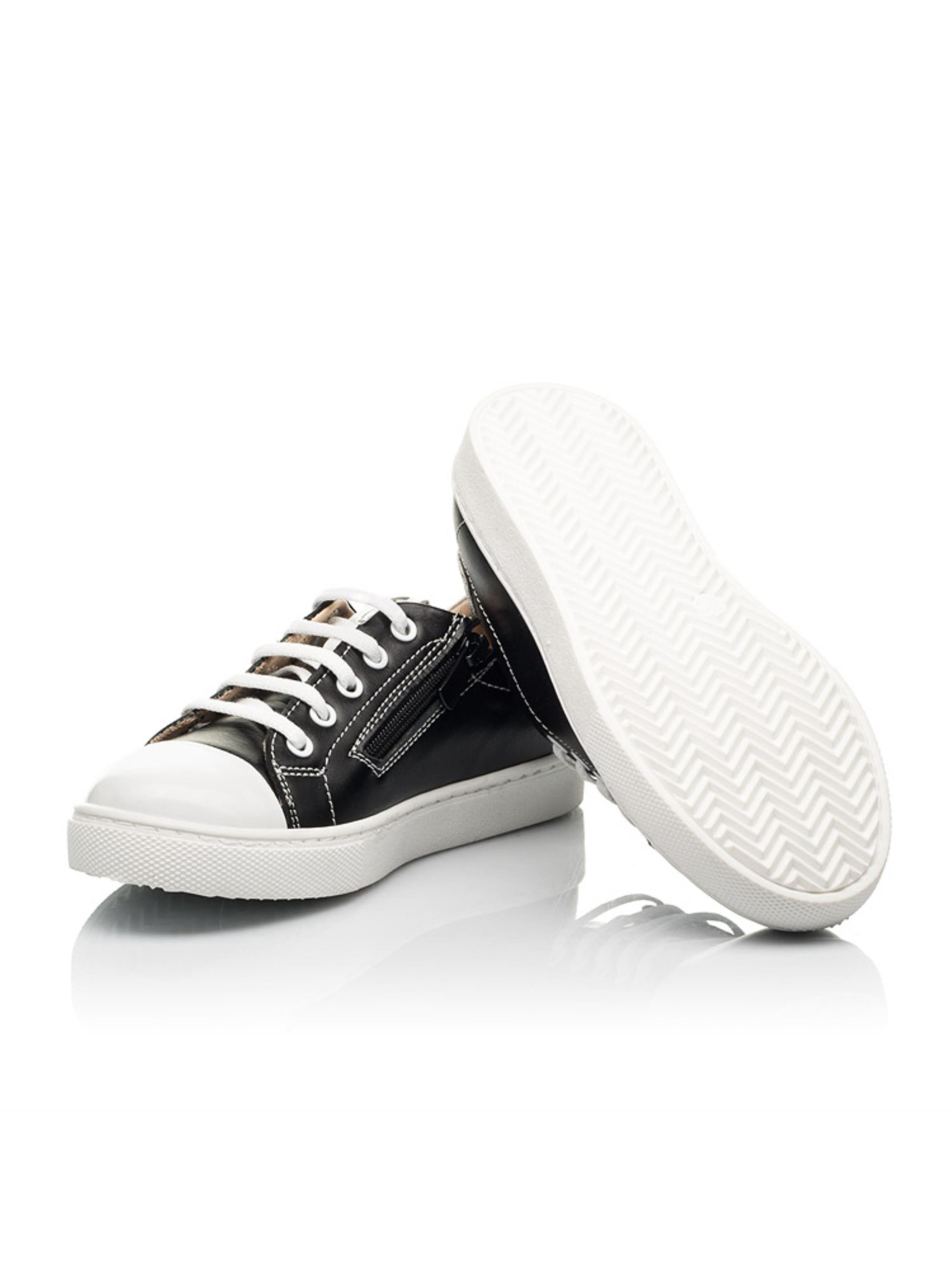 Супер стильная модель детских кед для мальчика/девочки создана на контрасте двух базовых цветов и фактур натуральных материалов. За основу наши дизайнеры выбрали угольно-черную кожу, дополненную вставкой из натуральной лакированной кожи белого цвета на носочке и пятке. Материал подкладки и стельки – натуральная кожа. Скорость обувания обеспечит боковая молния, которая для лучшей фиксации на ножке дополнена шнуровкой. Боковая часть детской обуви украшена четкой фигурной прошивкой. Комфорт детским ножкам обеспечат следующие элементы: жесткий задник, супинатор и анатомически правильная стелька. Язычок обуви украшен фирменным логотипом производителя. Подошва в кедах по периметру прошита.