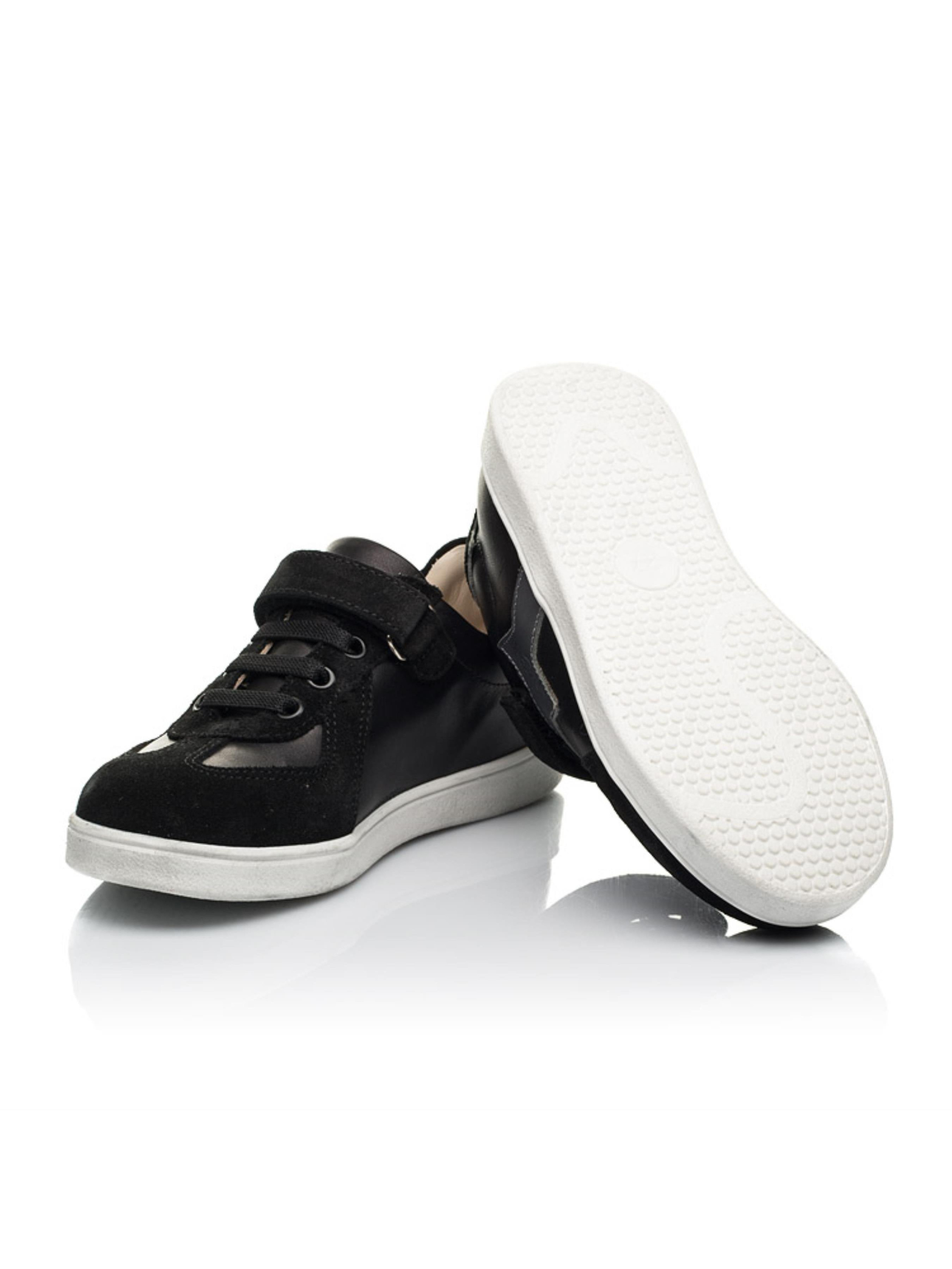 Звездная по внешнему виду и комфортная по своим характеристикам пара кед поражает качеством исполнения. Стильные детские кеды для мальчика пошиты из исключительно натуральных материалов. Материал верха - натуральная кожа черного цвета, которая дополнена вставками из натуральной замши угольно-черного цвета. Материал подкладки и стельки - натуральная гладкая кожа. Украшением модели выступает контрастная вставка серого цвета в виде звезды с логотипом производителя в центре. Легкие, качественные и универсальные кеды для мальчика покорят комфортом маленького модника. Для ускорения процесса обувания в качестве застежки используется шнурок-резинка и надежная липучка-застежка. Детские кеды для комфорта стопы имеют жесткий задник и анатомически правильную стельку с супинатором под свод стопы.