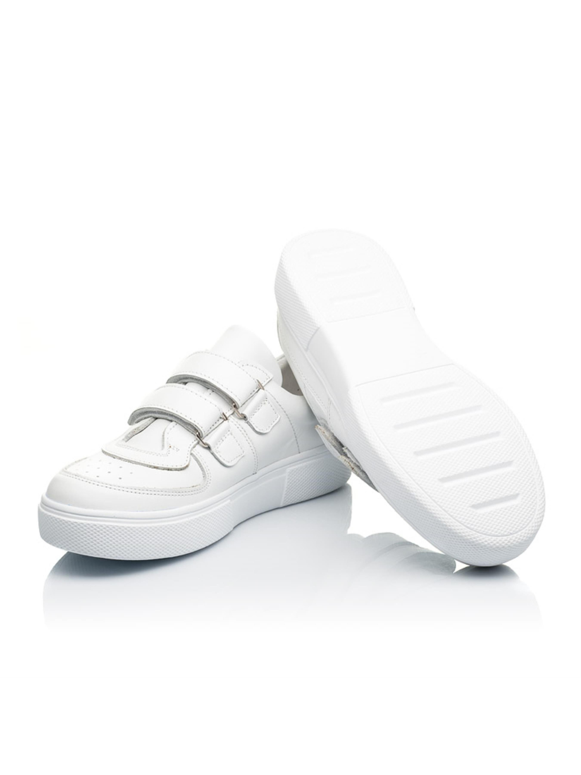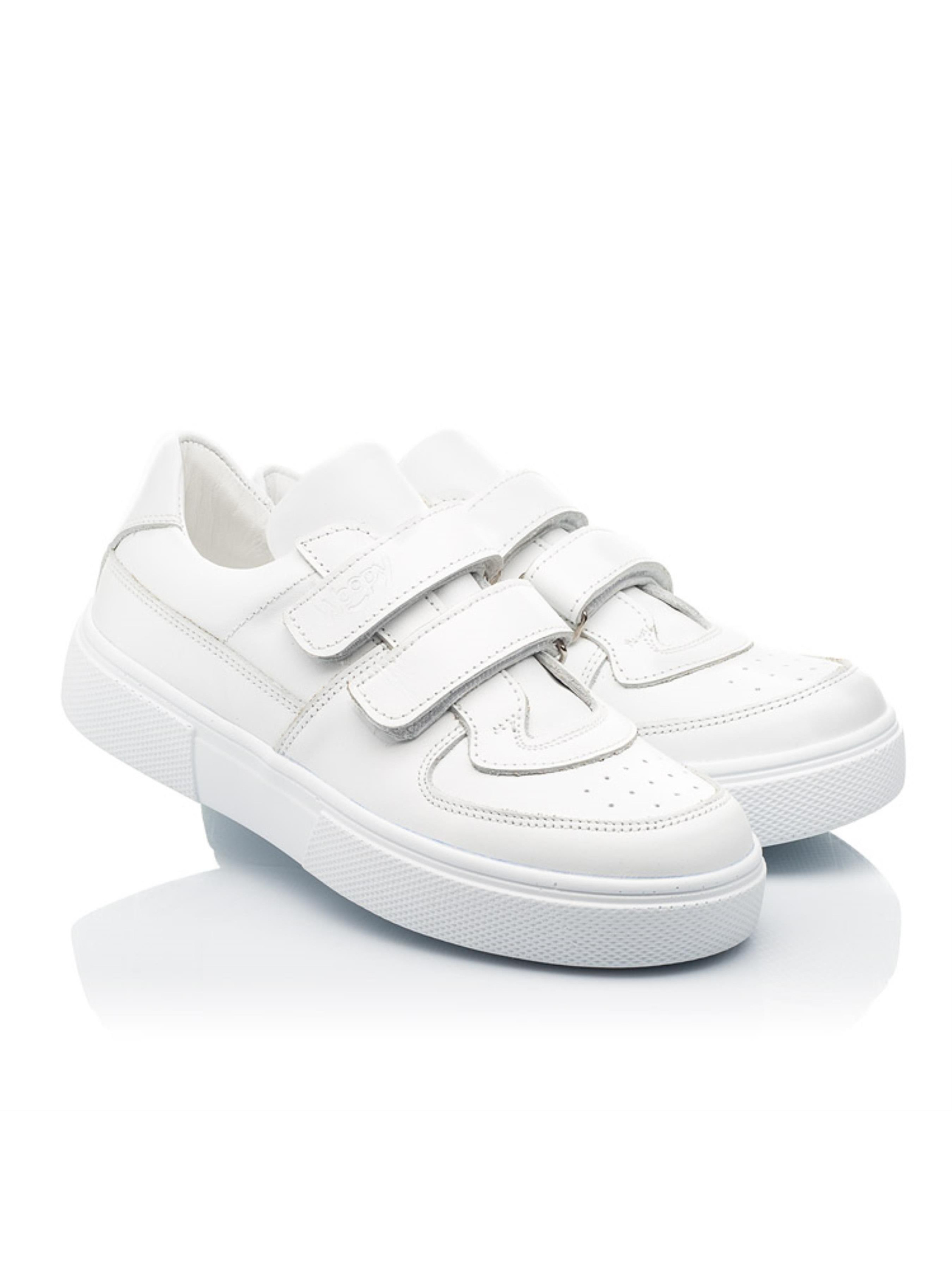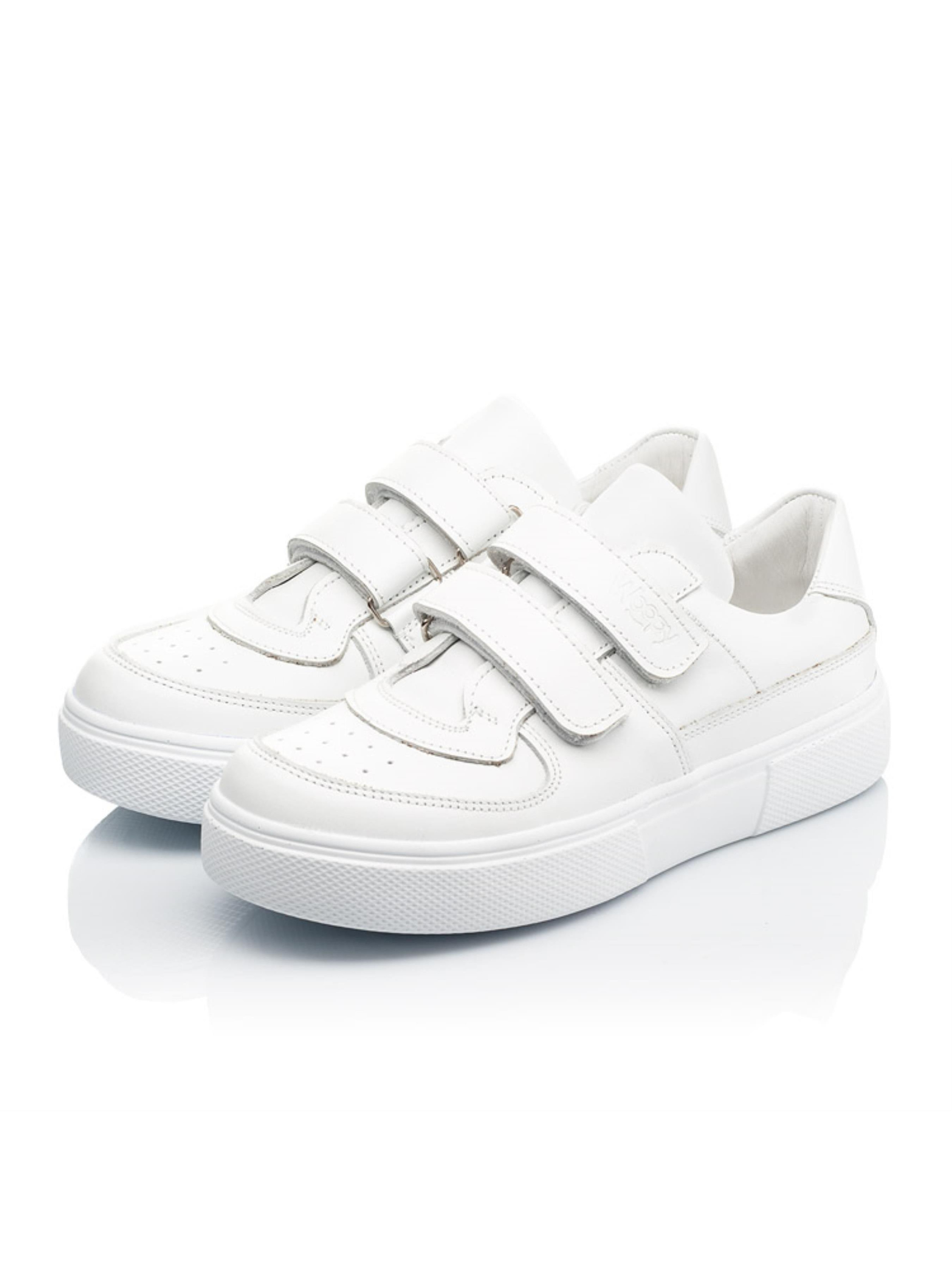 Обувь белого цвета уже несколько лет подряд на пике популярности среди ценителей спортивного стиля. И мы не смогли отказать себе в удовольствии создать неповторимую модель для юных модников. Детские кеды пошиты из снежно-белой кожи. Материал подкладки и стельки - натуральная кожа. Для ускорения процесса обувания в качестве застежки используются две надежные липучки. Такая модель пошита без лишних деталей, простая и лаконичная, но в то же время такая стильная. Вы согласны? Подростковые кеды имеют жесткий задник, анатомическую стельку и супинатор. Все эти элементы детской обуви важны для правильного формирования и положение стопы в обуви. Модель кед декорирована многочисленными декоративными швами, которые предоставляют неповторимости.