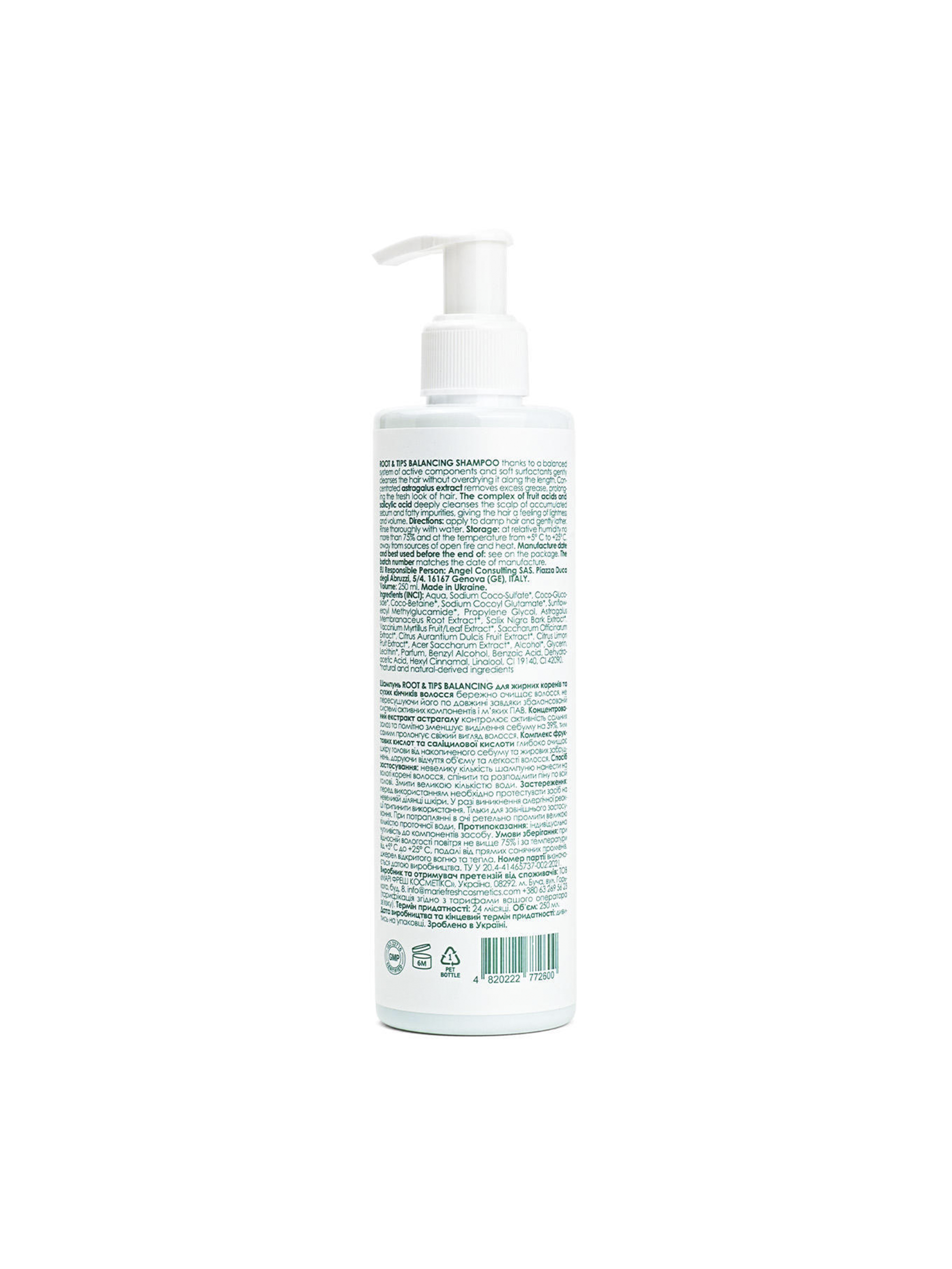 Благодаря сбалансированной системе активных компонентов и мягких ПАВ шампунь бережно очищает волосы, не пересушивая их по длине, убирает отягощение у корней и пушистость кончиков. Концентрированный экстракт китайского женьшеня уменьшает выделение себума на 39%. Комплекс фруктовых (АНА) и салициловая кислота (ВНА) из экстракта коры ивы растворяют накопленный себум и жировые загрязнения, ороговевшие клетки, остатки тяжелых металлов и стайлинговых средств, даря ощущение свежести и легкости волос. Как результат волосы с объемом у корней, шелковистые и послушные по всей длине. *Комплекс натуральных моющих веществ (ПАВ) - бережно очищает волосы, не пересушивая их по длине. *Концентрированный экстракт китайского женьшеня – контролирует активность сальных желез и заметно уменьшает выделение себума на 39%, тем самым пролонгирует свежий вид волос. *Комплекс фруктовых (АНА) кислот – стимулирует к быстрому обновлению эпидермиса, глубоко очищает кожу головы от накопленного себума и жировых загрязнений, ороговевших клеток, остатков тяжелых металлов и стайлинговых средств, даря ощущение свежести и легкости волос. *Салициловая кислота (ВНА) из экстракта коры ивы - предотвращает появление перхоти и обеспечивает профилактику от других кожных заболеваний, очищает поры и заблокированные фолликулы, обеспечивая активный рост здоровых и блестящих волос с невесомыми чистыми корнями. Способ применения: Небольшое количество шампуня нанести на влажные корни волос. Вспенить с помощью пальцев и массирующими движениями распределить пену по всей голове. Смыть большим количеством воды. При необходимости повторить процедуру. Подходит для ежедневного использования для жирных волос и глубокой очистки для сухого типа волос. Состав: Aqua, Sodium Coco-Sulfate*, Coco-Glucoside*, Coco-Betaine*, Sodium Cocoyl Glutamate*, Sunfloweroyl Methylglucamide*, Astragalus Membranaceus Root Extract*, Salix Nigra Bark Extract*, Vaccinium Myrtillus Fruit/Leaf Extract*, Saccharum Officinarum Extract*, Citrus Aurantium Dulcis Fruit Extract*, Citrus Lеmon Fruit Extract*, Acer Saccharum Extract*, Alcohol*, Glycerin, Lecithin*, Parfum, Benzyl Alcohol, Benzoic Acid, Dehydroacetic Acid, Linalool, CI 19140, CI 42090. *natural and natural-derived ingredients