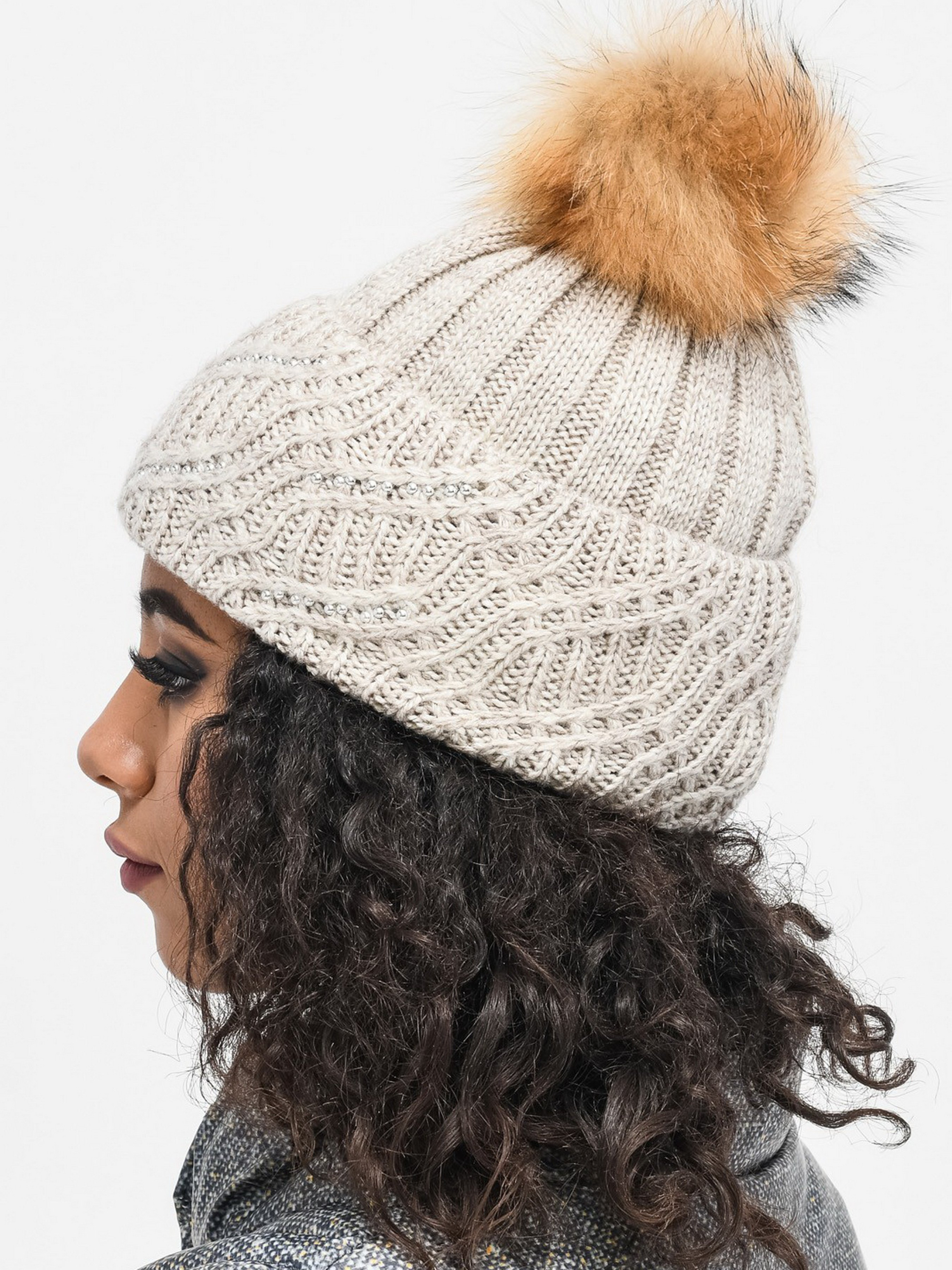 Теплая женская шапка на флисе для прохладного сезона. Модель отличается вязкой-резинка, широким отворотом декорированным узором и стразами. Вверху на самом конце пришит бубон из натурального меха.