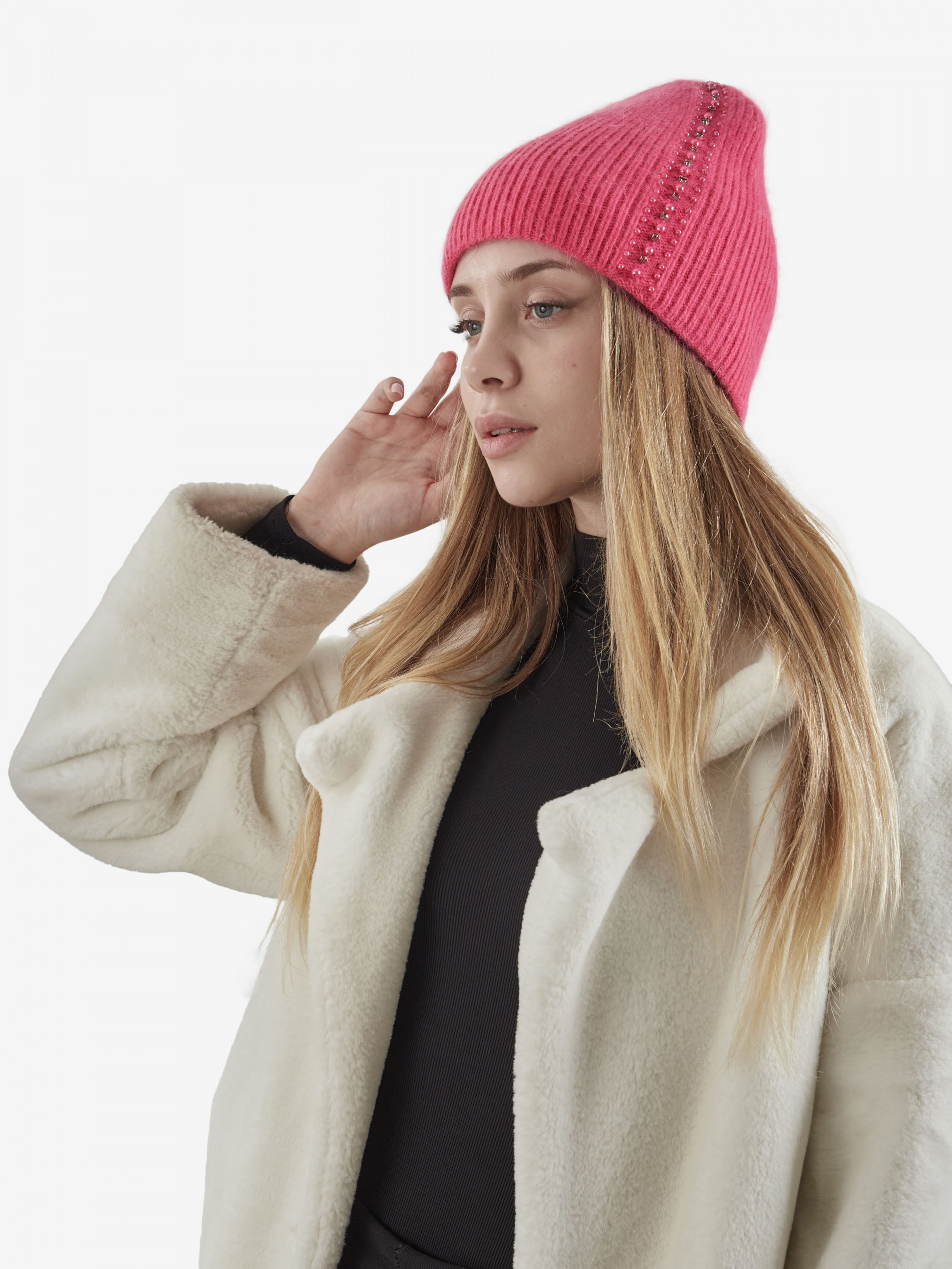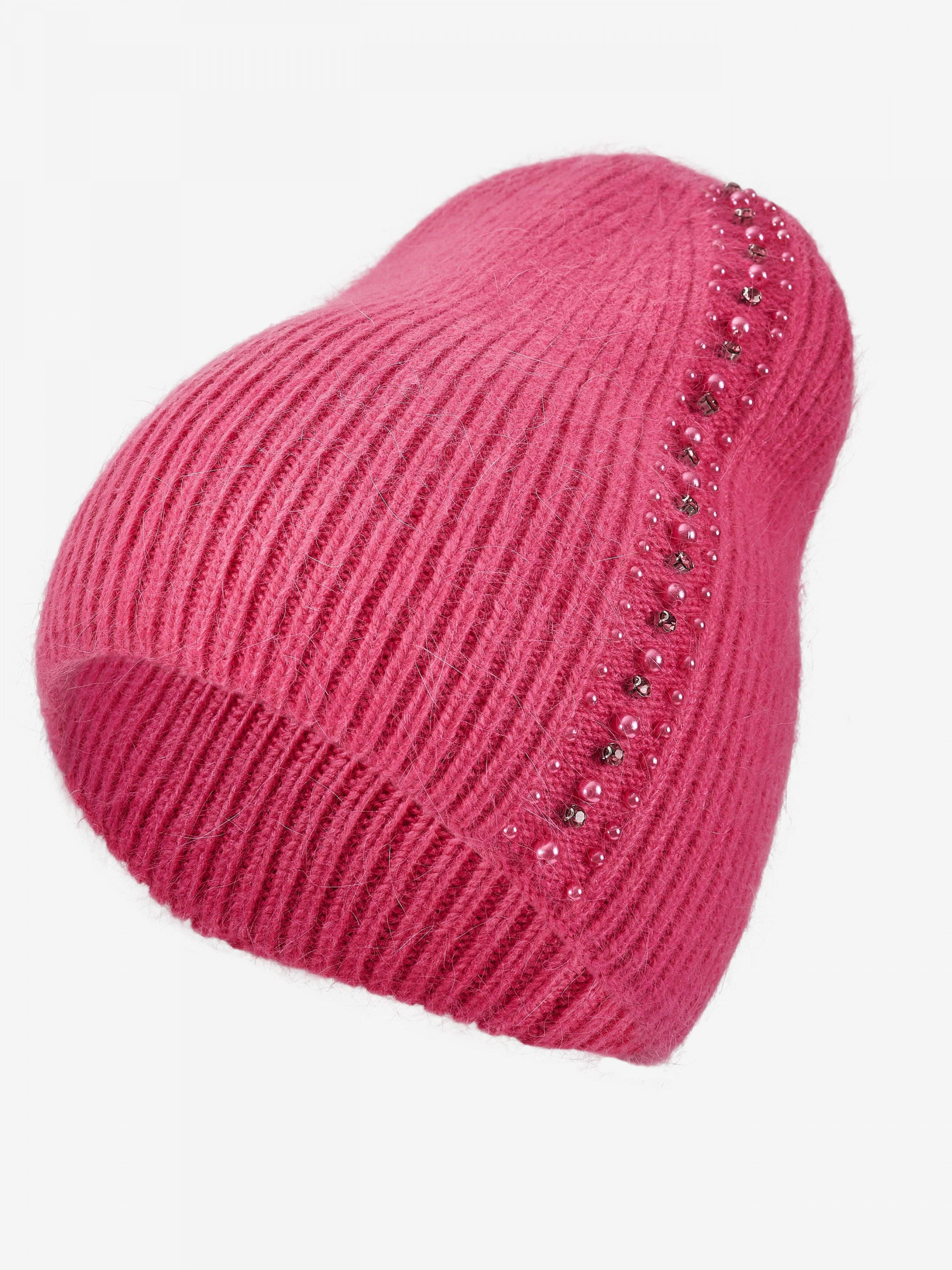 "Стильная женская теплая шапка бини отлично впишется в ваш обыденный образ. Вы будете чувствовать себя комфортно в любую погоду. Шапка эластичная, хорошо тянущаяся и приятная на ощупь. Изделие украшено бусинами и стразами. Такой головной убор отлично защитит голову от ветра и холода, обеспечит комфорт во время ношения. Детали: - Состав: 52% шерсть кролика, 48% акрил - Размер универсальный, хорошо тянется - Высота шапки: 24 см - Полуоборот шапки: 21 см - Сезон: Осень-Зима - Тип вязки: средняя - Декорирована бусинами и стразами"