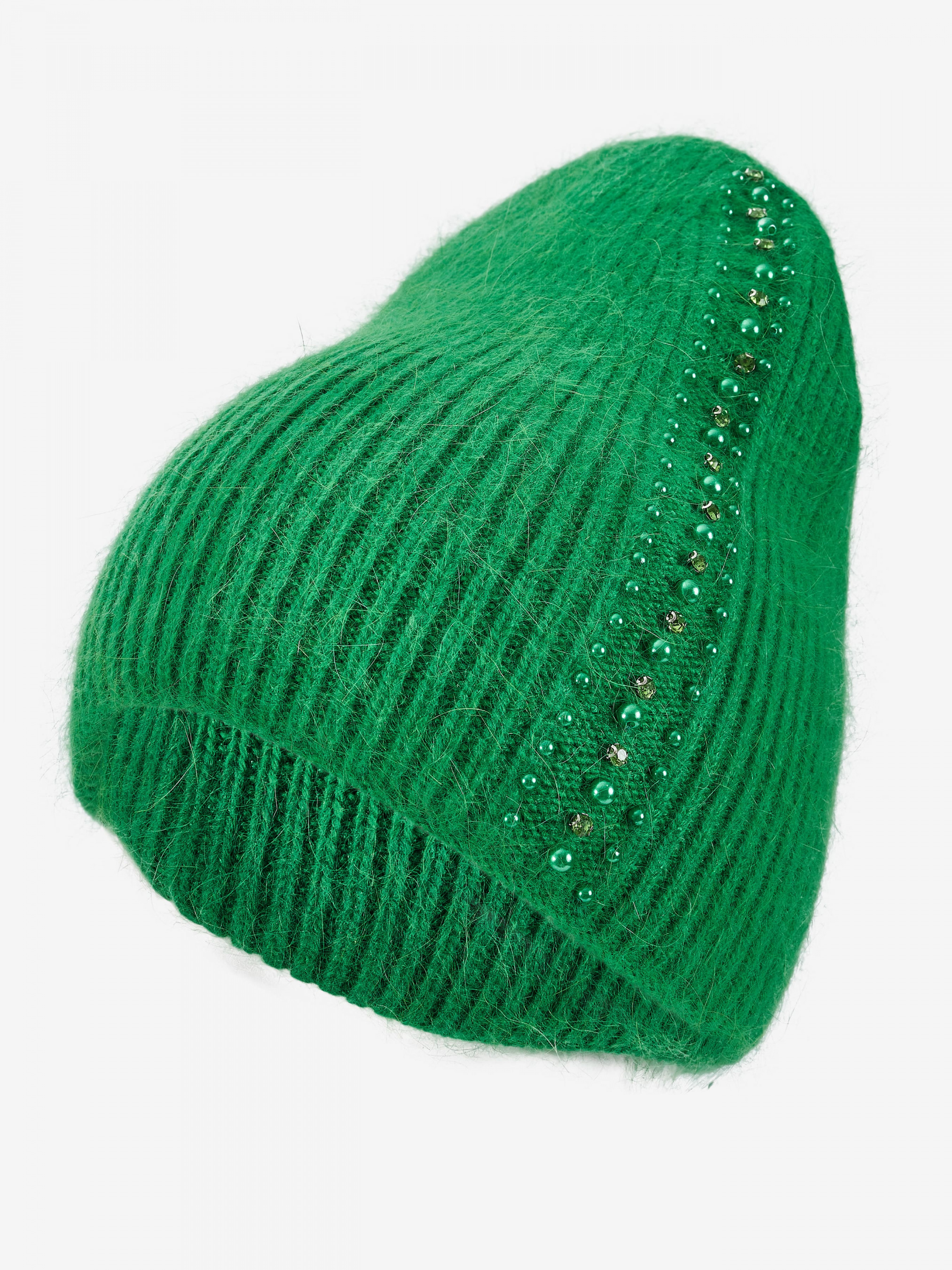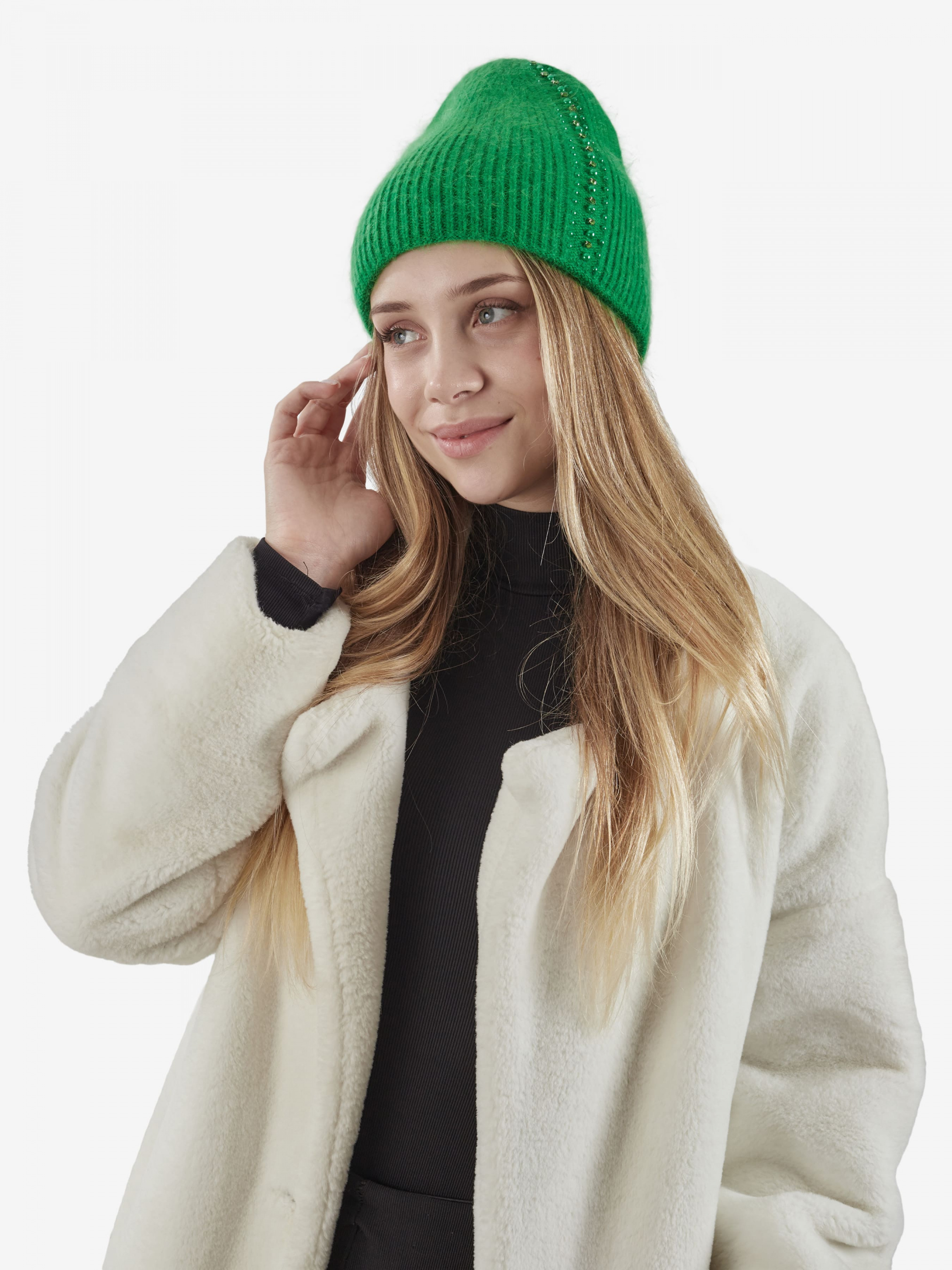 "Стильная женская теплая шапка бини отлично впишется в ваш обыденный образ. Вы будете чувствовать себя комфортно в любую погоду. Шапка эластичная, хорошо тянущаяся и приятная на ощупь. Изделие украшено бусинами и стразами. Такой головной убор отлично защитит голову от ветра и холода, обеспечит комфорт во время ношения. Детали: - Состав: 52% шерсть кролика, 48% акрил - Размер универсальный, хорошо тянется - Высота шапки: 24 см - Полуоборот шапки: 21 см - Сезон: Осень-Зима - Тип вязки: средняя - Декорирована бусинами и стразами"