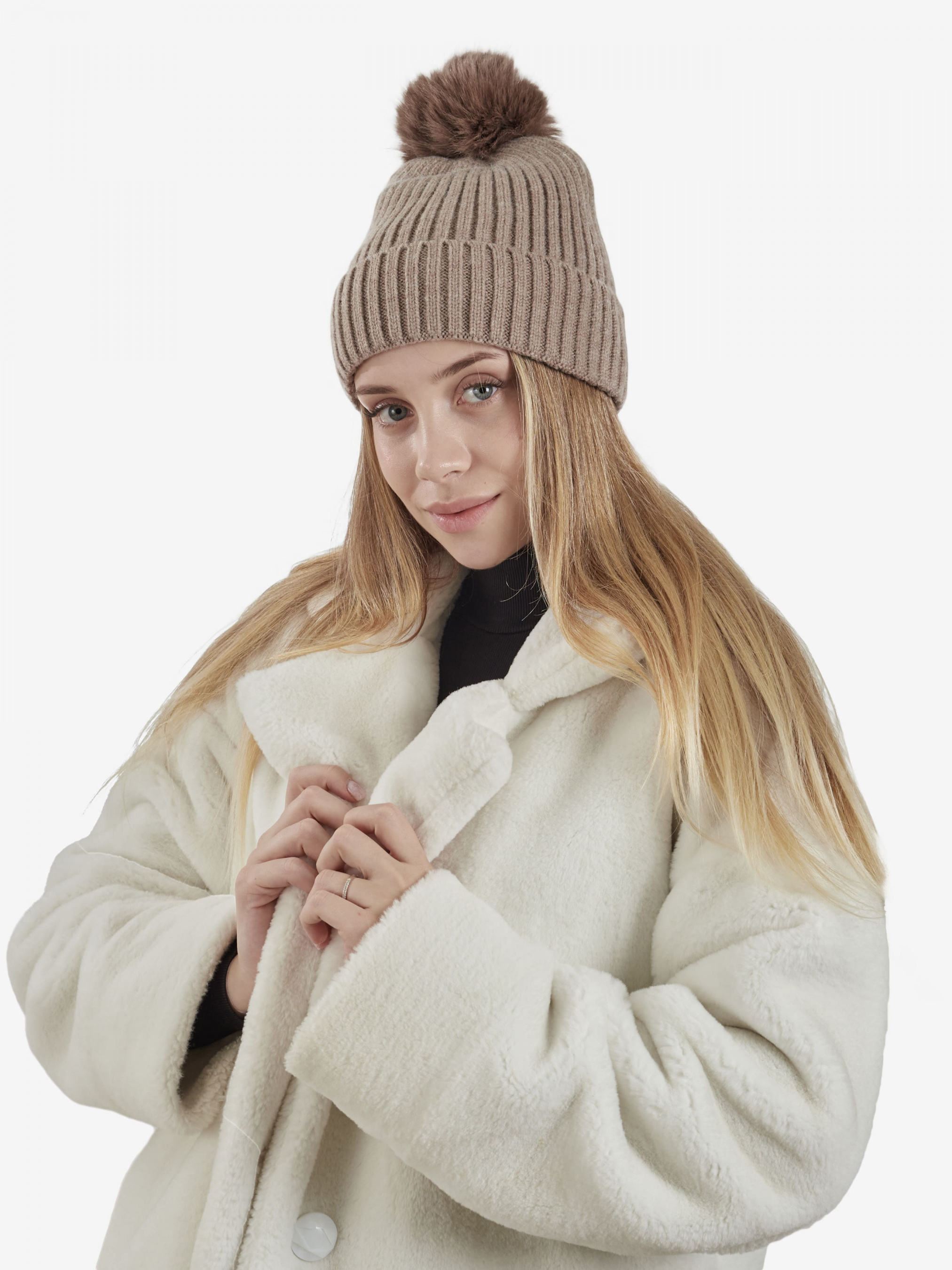 "Стильная женская теплая шапка бини отлично впишется в ваш обыденный образ. Вы будете чувствовать себя комфортно в любую погоду. Шапка дополнена плотно прилегающим отворотом, эластичная, хорошо тянущаяся и приятная на ощупь. Изделие украшено помпоном, который легко отстегивается. Такой головной убор отлично защитит голову от ветра и холода, обеспечит комфорт во время ношения. Детали: - Состав: 50% акрил, 30% котон, 20% полиэстер - Размер универсальный, хорошо тянется - Высота шапки: 21 см - Полуоборот шапки: 20 см - Сезон: Осень-Зима - Тип вязки: средняя - Декорирована помпоном"