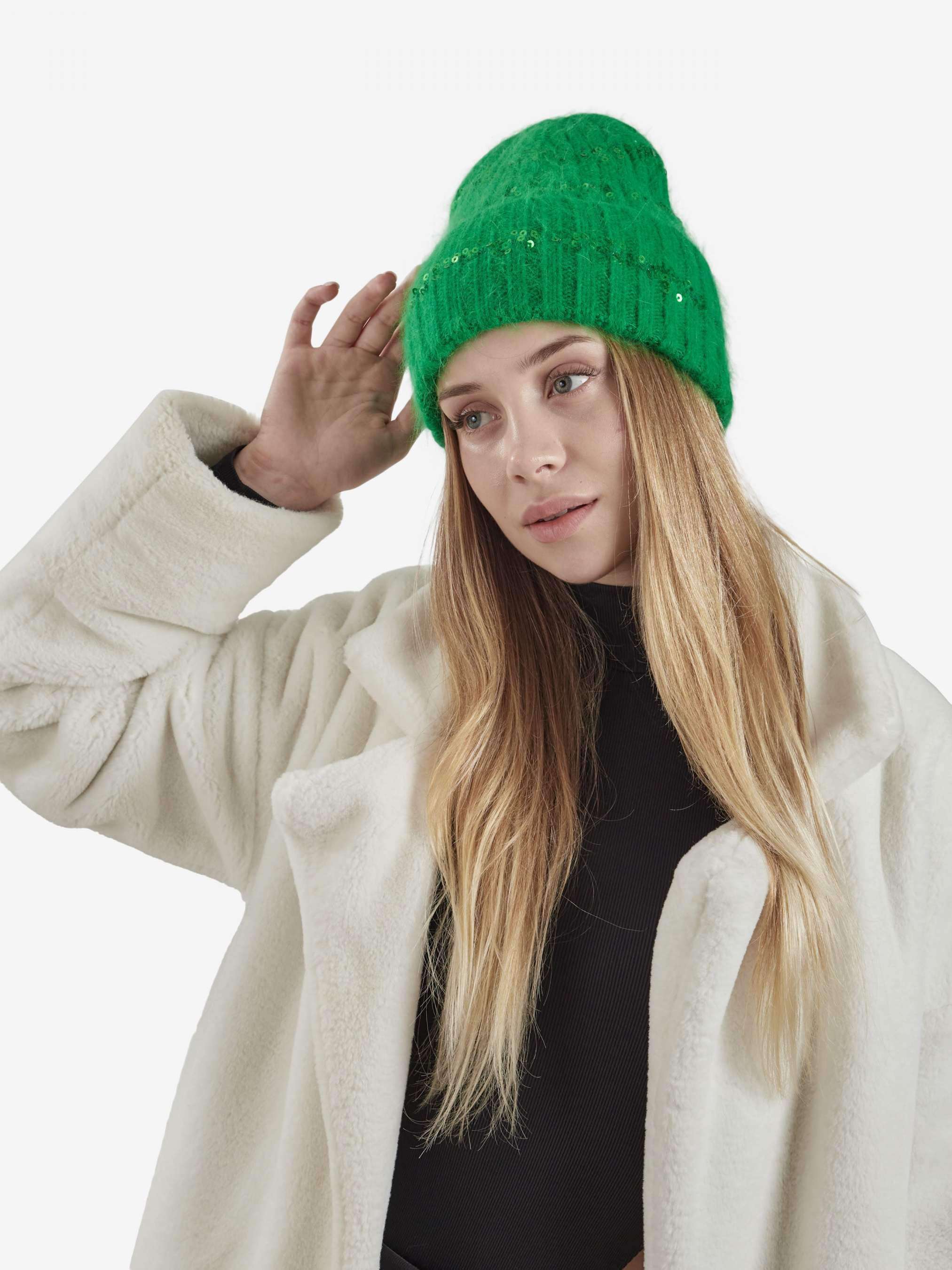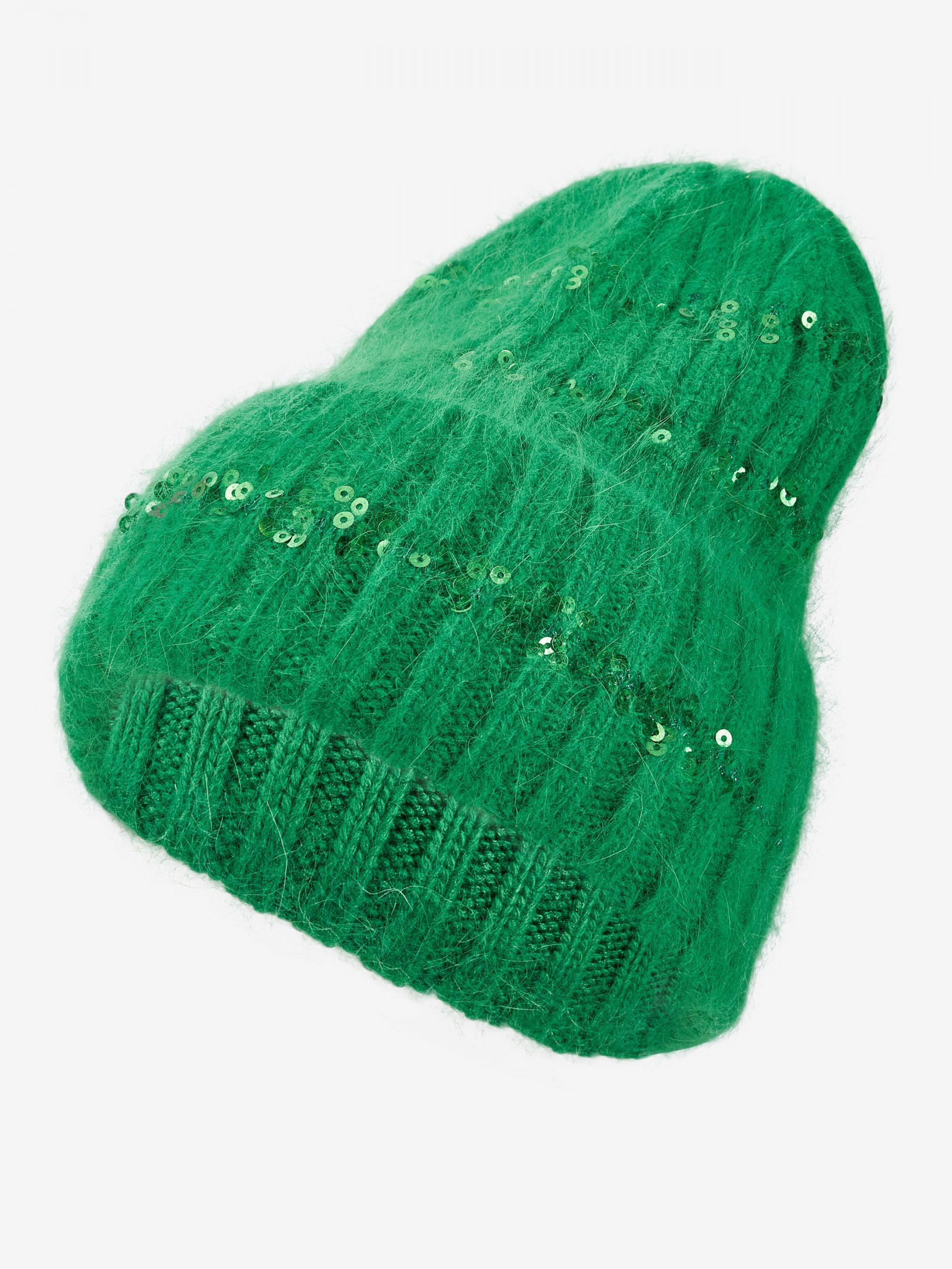 "Стильная женская теплая шапка бини отлично впишется в ваш обыденный образ. Вы будете чувствовать себя комфортно в любую погоду. Шапка дополнена плотно прилегающим отворотом, эластичная, хорошо тянущаяся и приятная на ощупь. Изделие украшено пайетками и прошита люрексовой нитью. Такой головной убор отлично защитит голову от ветра и холода, обеспечит комфорт во время ношения. Детали: - Состав: 52% шерсть кролика, 48% акрил - Размер универсальный, хорошо тянется - Высота шапки: 25 см - Полуоборот шапки: 22 см - Сезон: Осень-Зима - Тип вязки: средняя - Декорирована пайетками"