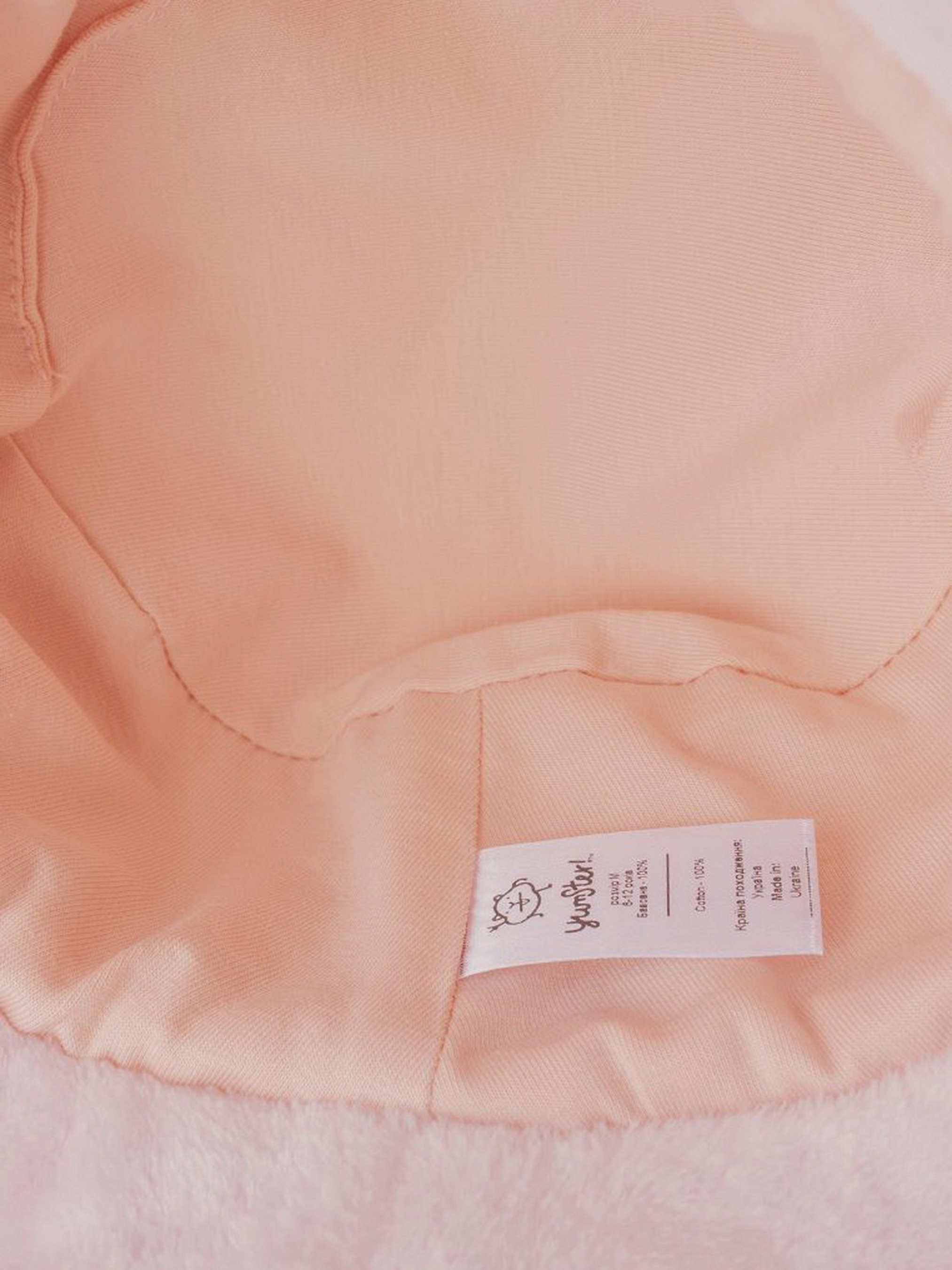 Теплая панама для детей. Основной цвет - розовый. С левой стороны декорирована брендированной лентой. Материал - махра. Подкладка 100% коттон. Поля панамки отстроченные декоративными строчками.