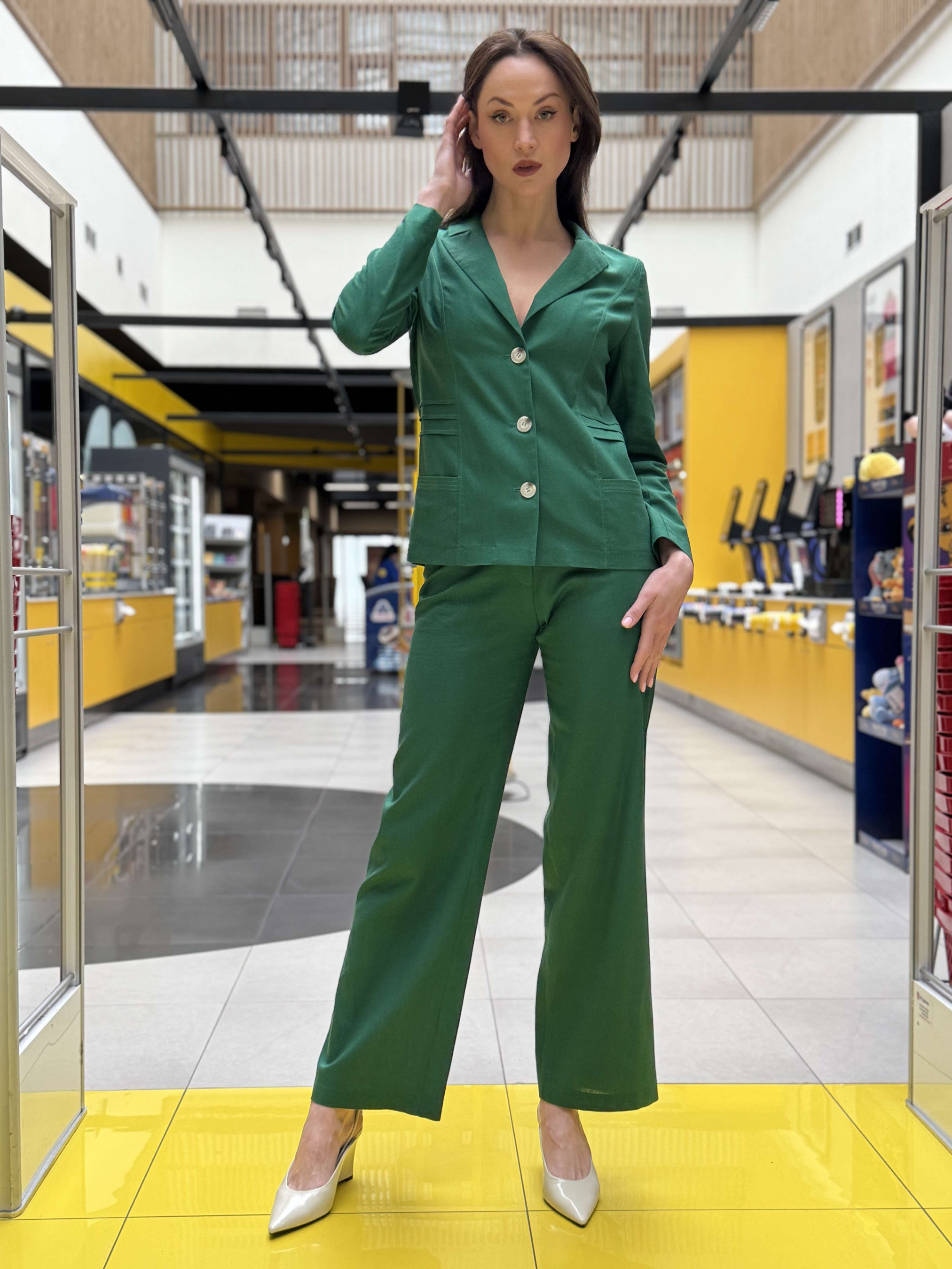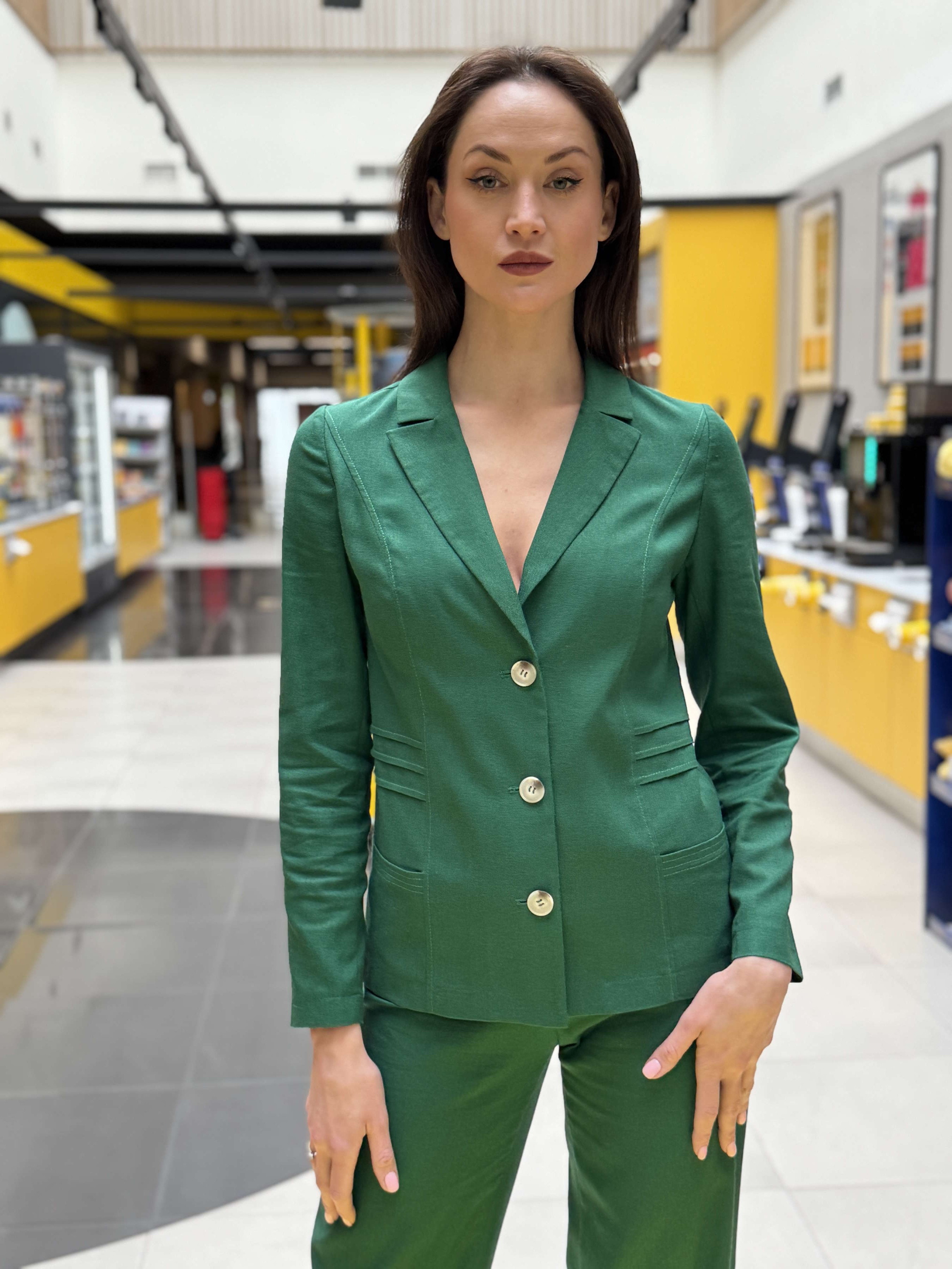 Классический жакет Cat Orange насыщенного зеленого цвета молодой листвы. Выполнен из легкой натуральной льняной ткани. Отложной воротник с лацканами образует глубокий V-образный вырез. Спереди и сзади рельефы для идеального прилегания по фигуре. Длинные рукава, два функциональных кармана. На уровне талии декоративные складки. Без подкладки, застегивается на пуговицы. Жакет рекомендуем комбинировать с классическими брюками из того же модельного ряда.