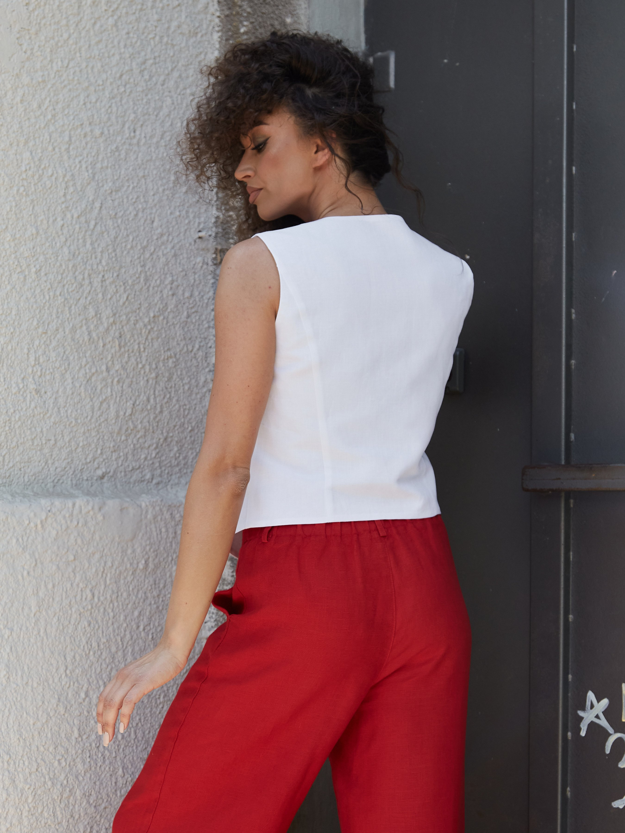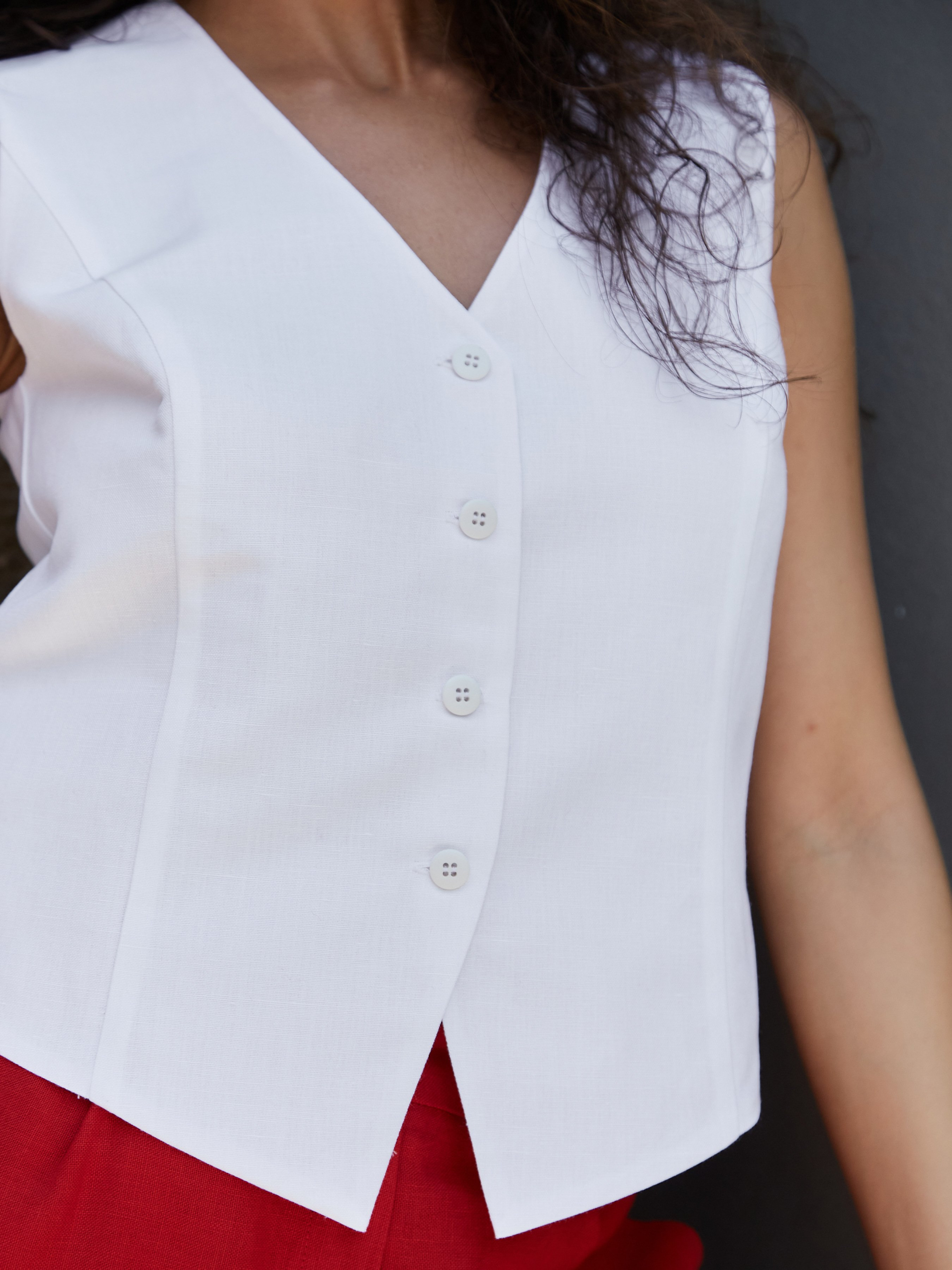 Ця жилетка створена для зручних та стильних образів одночасно. Вона виконана зі 100% льону, тканина легка, м’яка, майже невідчутна на тілі – це must have цього літа. Жилетка створена у двох кольорах – червоному та білому, має напівприталений силует, на передній частині виробу застібка з ґудзиками. V-подібний виріз горловини ефектно виглядає на тілі, підкреслюючи красу жіночих ключиць та шиї. Така жилетка гарно поєднується з легкими сукнями, спідницями або ж із зручними штанами, шортами. Лляний одяг – найкращий варіант на теплу пору року, адже він не парить, приємний до тіла та легко пропускає повітря. Наша лляна колекція надзвичайно комфортна та стильна, вона дарує впевненість та рішучість у кожному кроці.