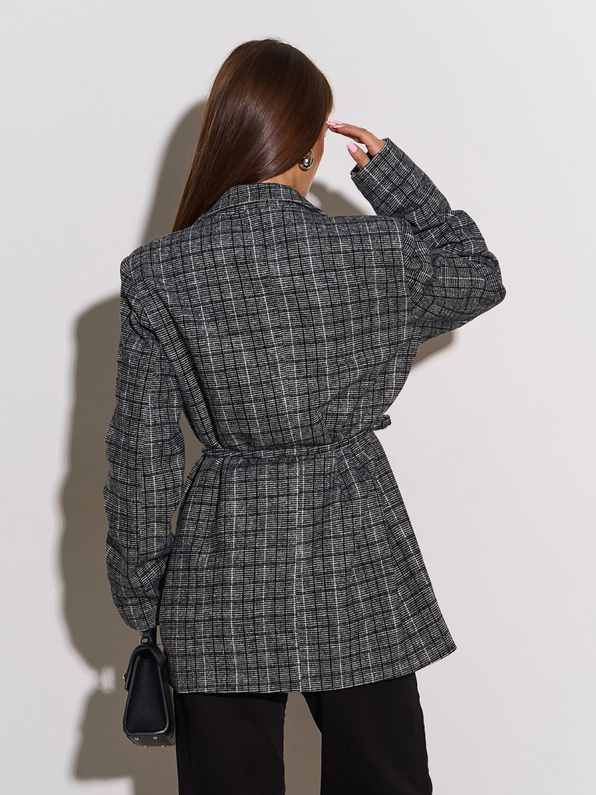 Серый принтованный демисезонный пиджак из шерстяной пальтовой ткани с нижним подкладом и съемным поясом. Модель прямого свободного кроя с подплечниками и длинными рукавами. Пиджак с клапанами на карманах и пуговицах. Полуобхват: Грудь: S/M (56), L/XL (58), Длина изделия - 75, Рукав - 62, Ткань: Низкой эластичности.