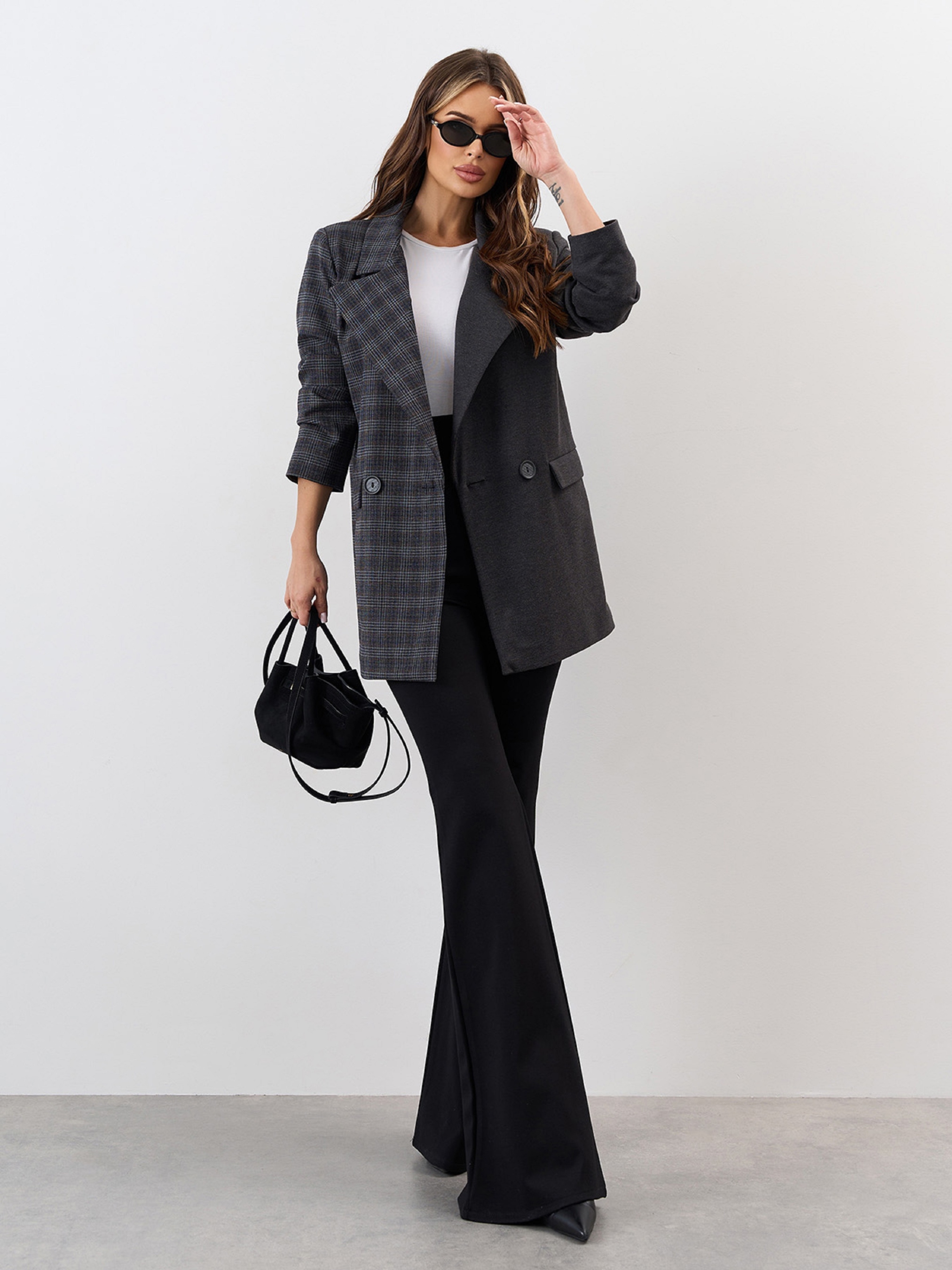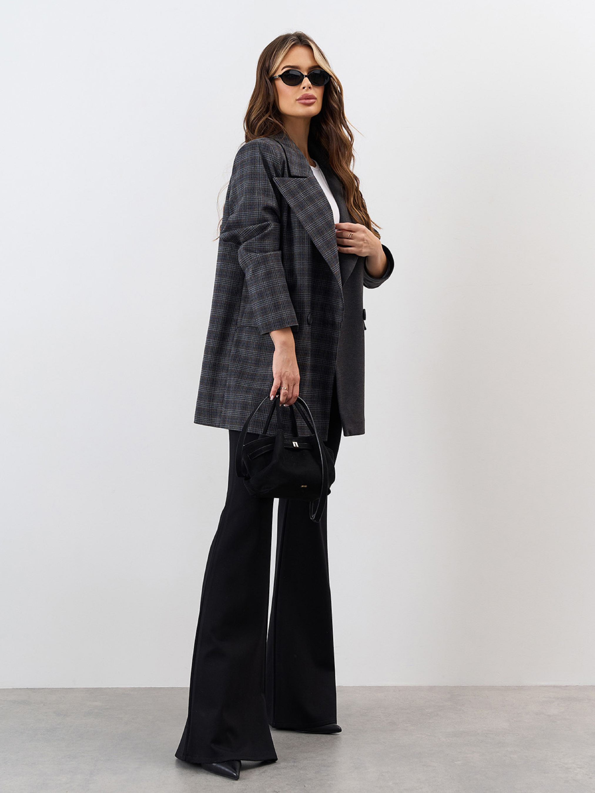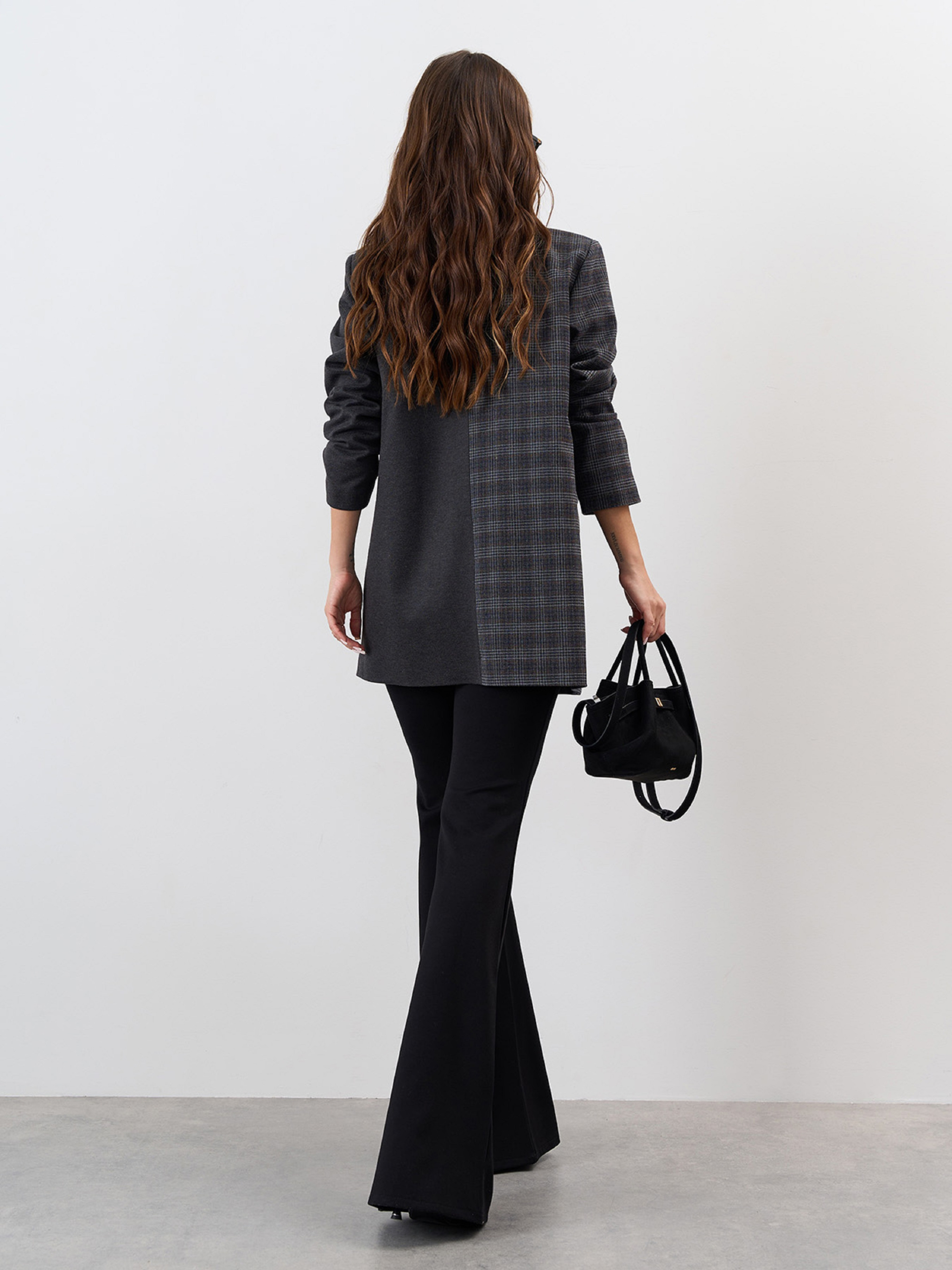 Комбинированный свободный пиджак из темно-серой костюмки с клетчатой симметричной вставкой. Модель на пуговицах с нижним подкладом и классическим английским воротником. Пиджак с длинными рукавами и карманами с клапанами. Полуобхват: Грудь: S (50), M (52), L (54), XL (56), Длина изделия - 73, Рукав - 59, Ткань: Низкой эластичности.