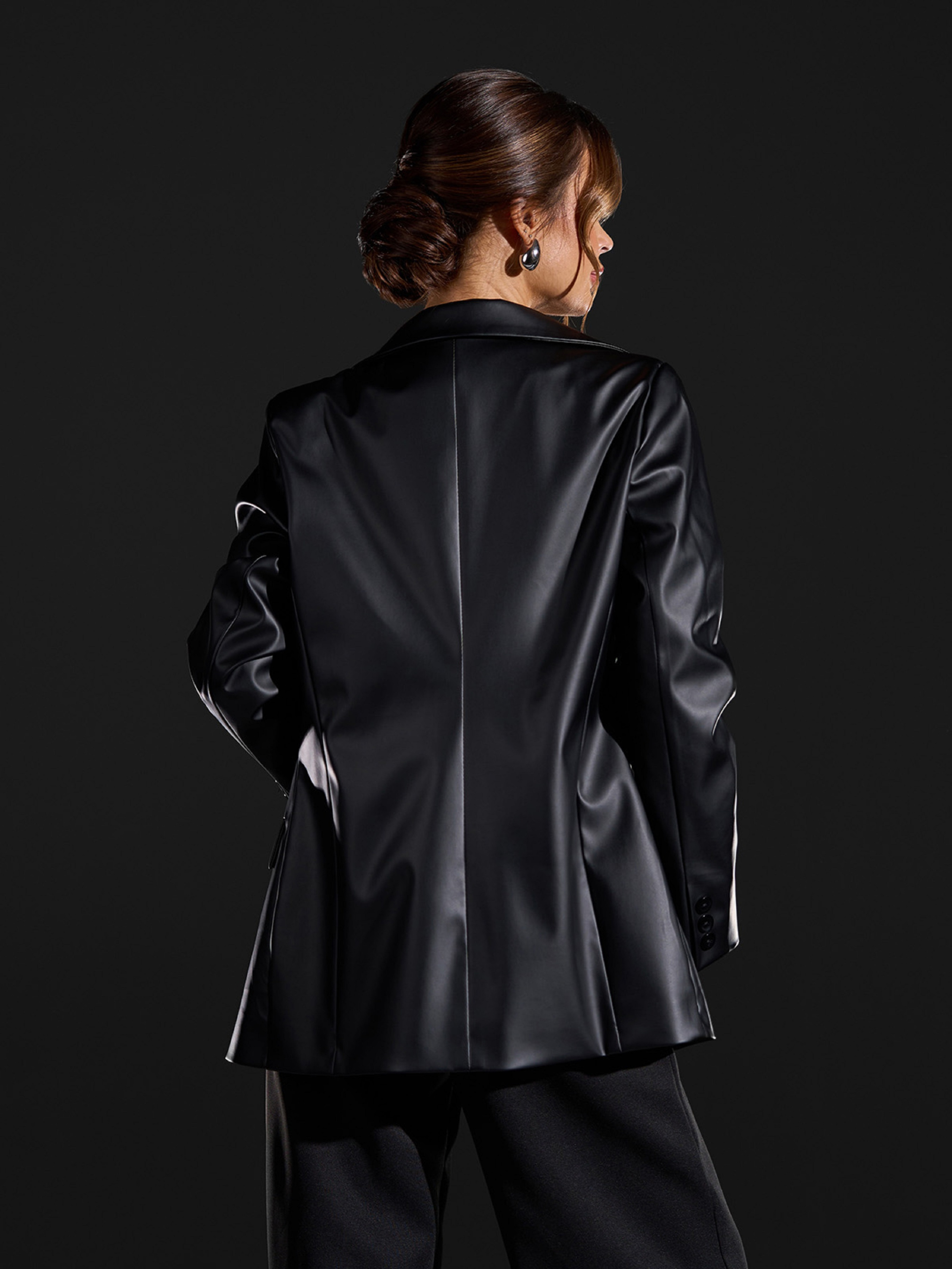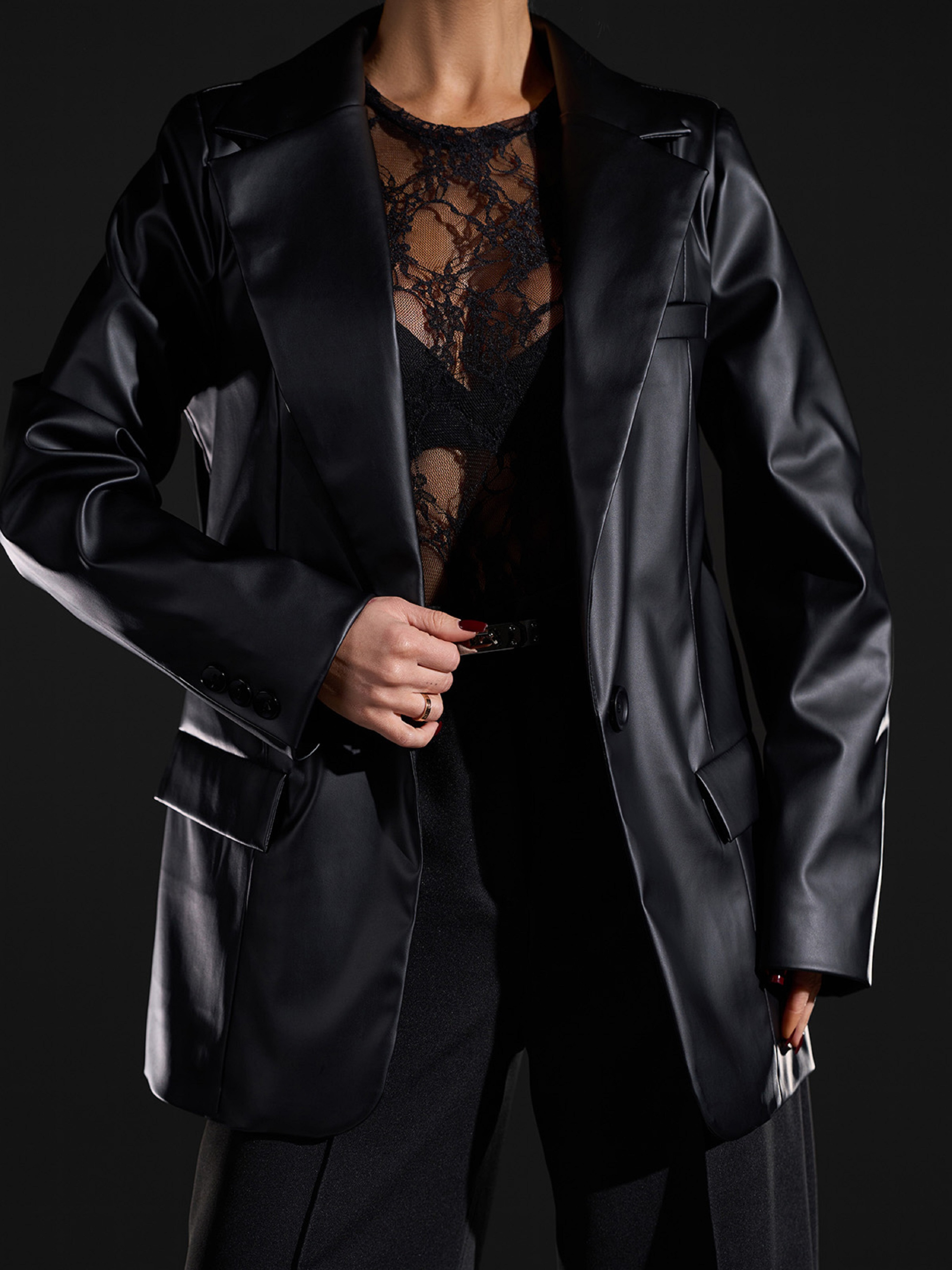 Черный пиджак, выполненный из эко-кожи с нижним подкладом и плечиками. Модель прямого кроя с воротником и застежкой-пуговицей. Изделие с длинными рукавами, карманами и декоративной листочкой. Полуобхват: Грудь: S (46), M (48), L (50), XL (52), XXL (54), 3XL (56), Длина изделия - 75, Рукав - 61, Ткань: Низкой эластичности.