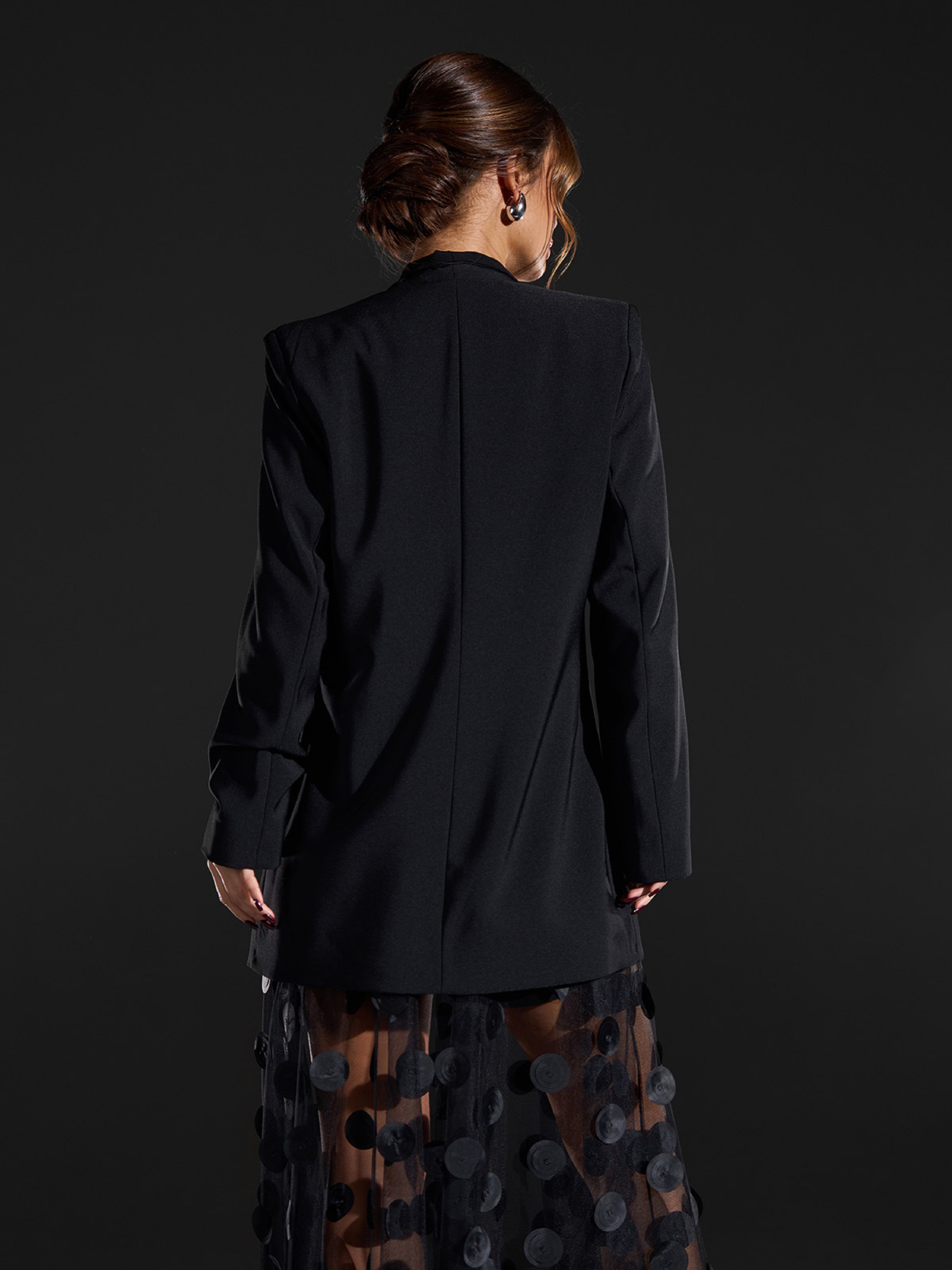 Черный жакет кроя на запах на пуговице, выполненный из костюмки с нижним подкладом и подплечниками. Изделие с воротником и декоративной листочкой на груди. Полуобхват: Грудь: S (48), M (50), L (52), XL (54), XXL (56), Длина изделия - 75, Рукав - 60, Ткань: Низкой эластичности.