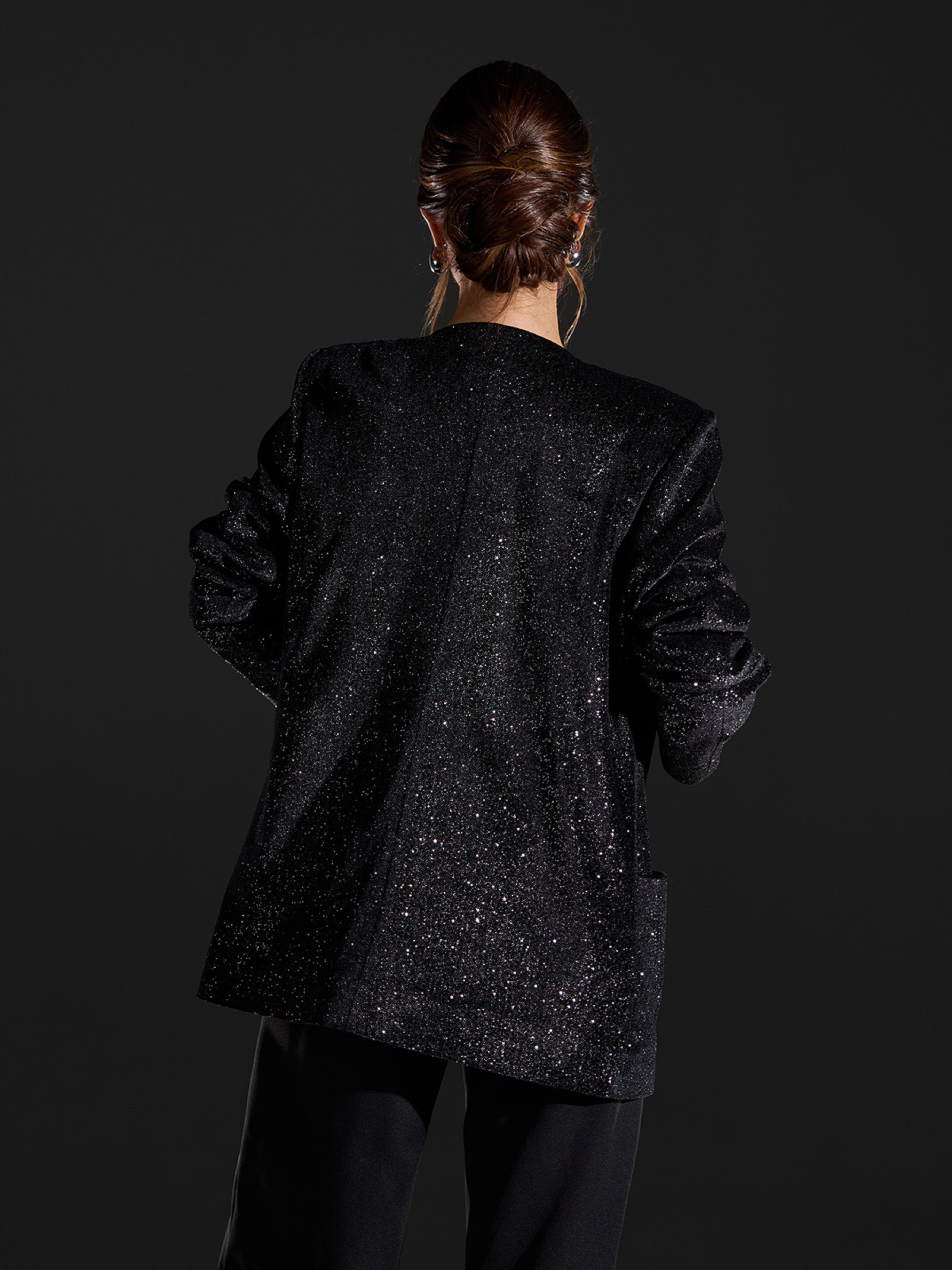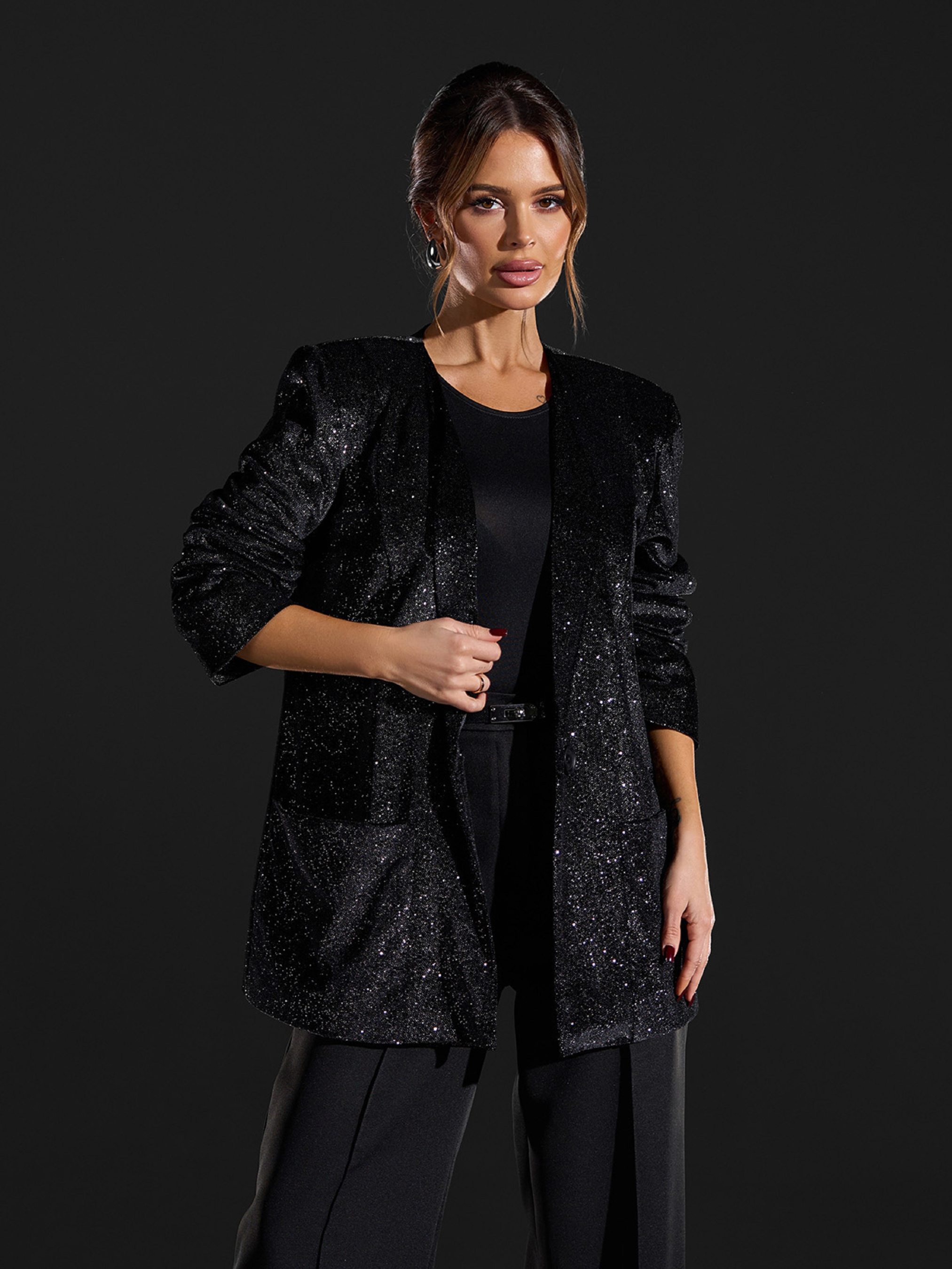 Нарядный пиджак в стиле диско из велюра с напылением. Пиджак удлиненного свободного кроя с длинными рукавами и карманами. Модель без воротника с нижним подкладом. Полуобхват: Грудь: S (50), M (52), L (54), XL (56), Длина изделия - 73, Рукав - 60, Ткань: Низкой эластичности.