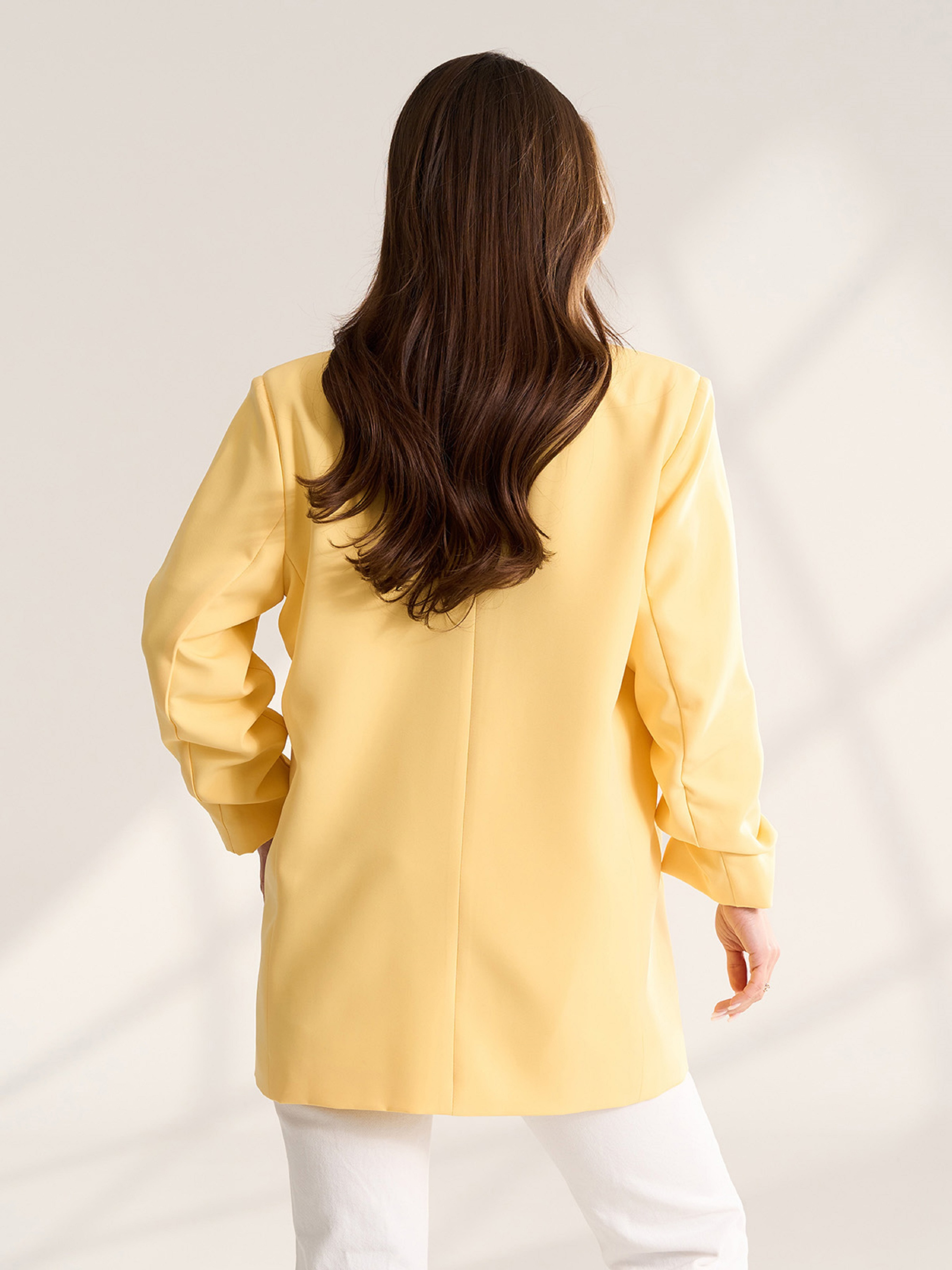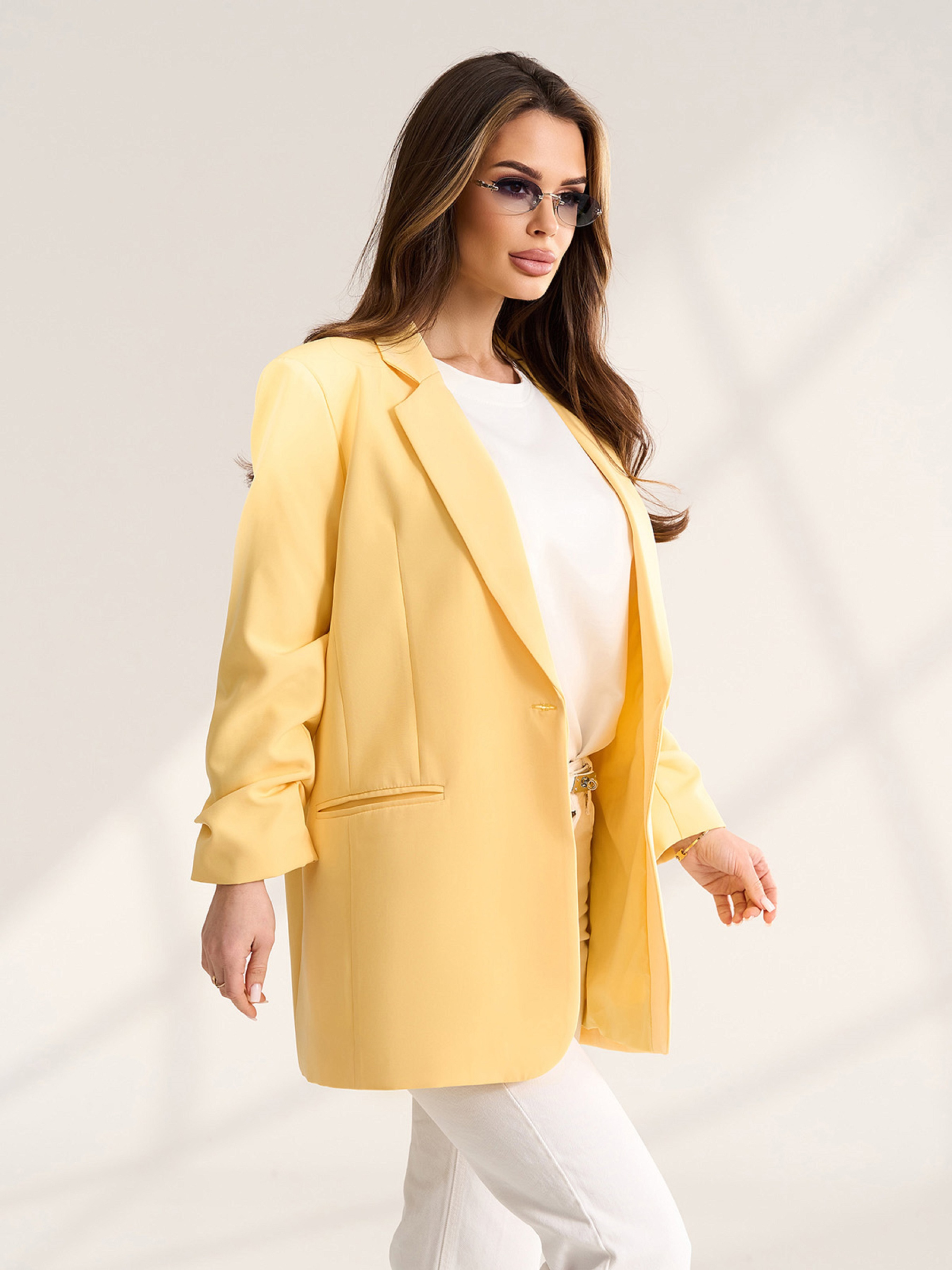 Весенний оверсайз жакет из желтой костюмной ткани с нижним подкладом. Жакет с английским воротником, присборенными рукавами 3/4 и карманами. Полуобхват: Грудь: S (52), M (54), L (56), XL (58), Длина изделия - 74, Рукав - 51, Ткань: Низкой эластичности.