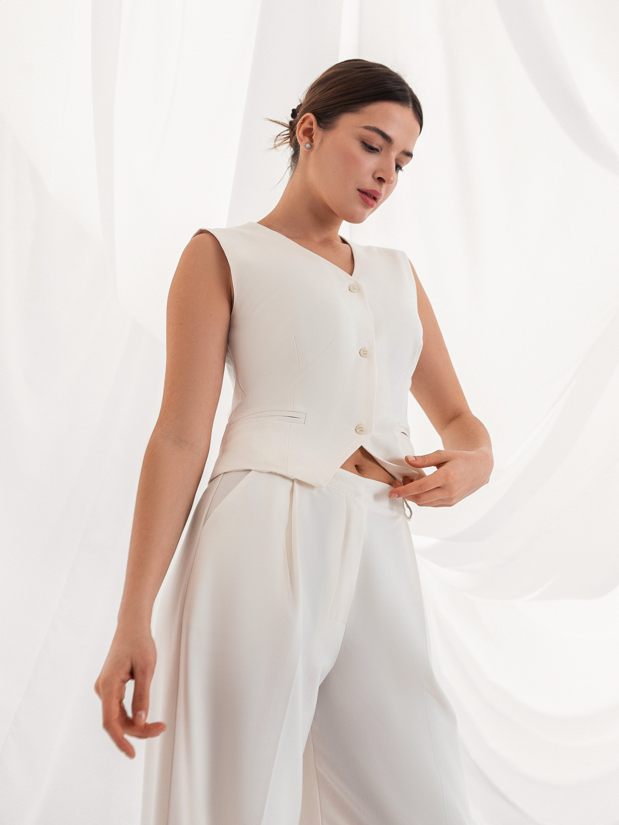 Укороченный жилет из костюмной ткани на подкладке. Функциональные карманы в рамку. Застежка на 3 пуговицы. Прекрасно комбинируется с любым низом - брюки, джинсы, юбки. XS :Длина по спине : 46 см; Полуобхват груди : 41 см; Плечи : 38 см; Полуобхват талии : 38 см. S :Длина по спине: 46 см; Полуобхват груди: 43 см; Плечи : 40 см; Полуобхват талии: 39 см. M :Длина по спине : 46 см; Полуобхват груди: 46 см; Плечи : 42 см; Полуобхват талии: 41 см. L :Длина по спине: 46 см; Полуобхват груди: 49 см; Плечи : 43 см; Полуобхват талии : 44 см. XL :Длина по спине : 47 см; Полуобхват груди: 50 см; Плечи : 44 см; Полуобхват талии: 45 см. XXL :Длина по спине : 47 см; Полуобхват груди: 52 см.; Плечи : 45 см; Полуобхват талии : 49 см