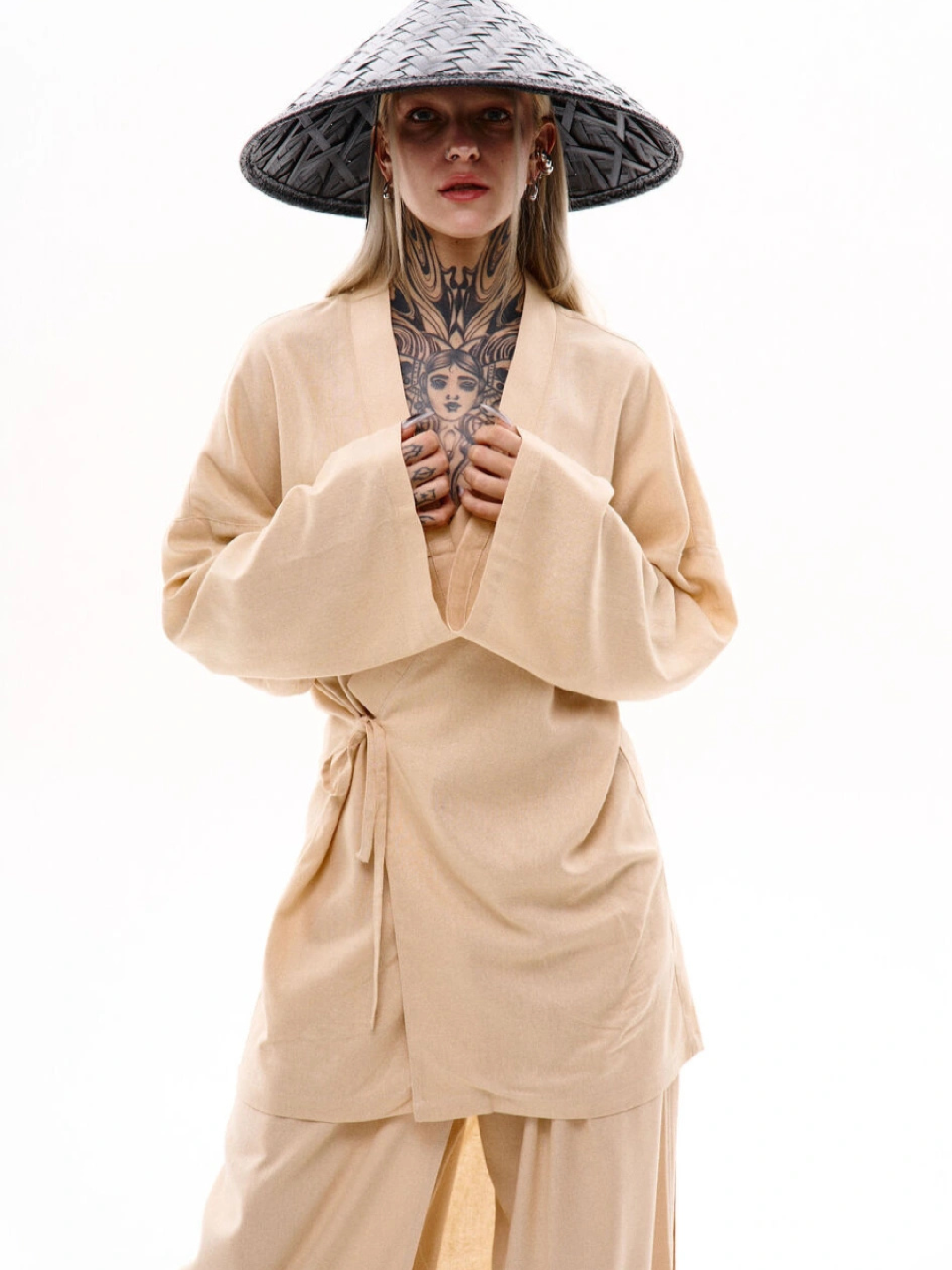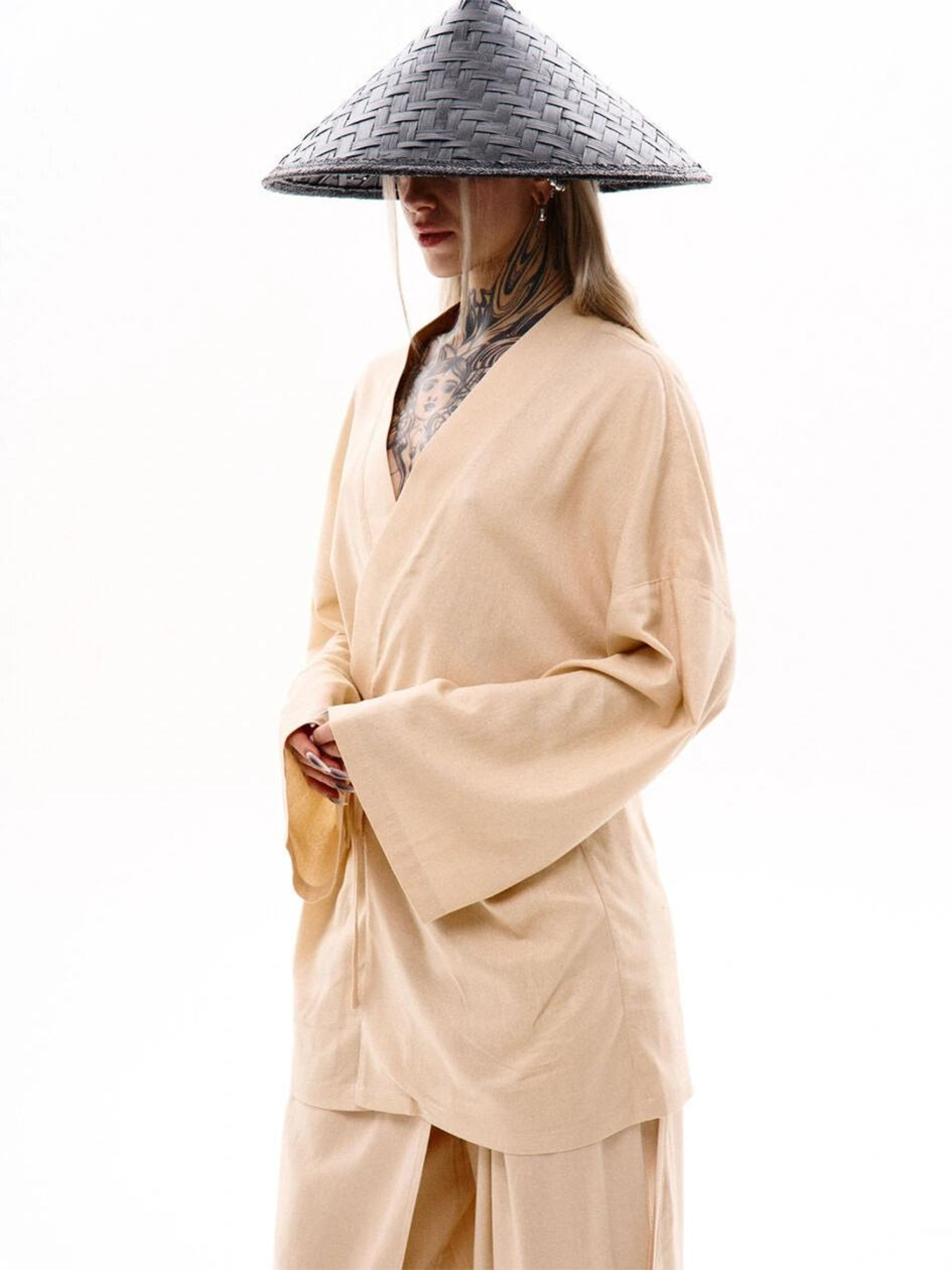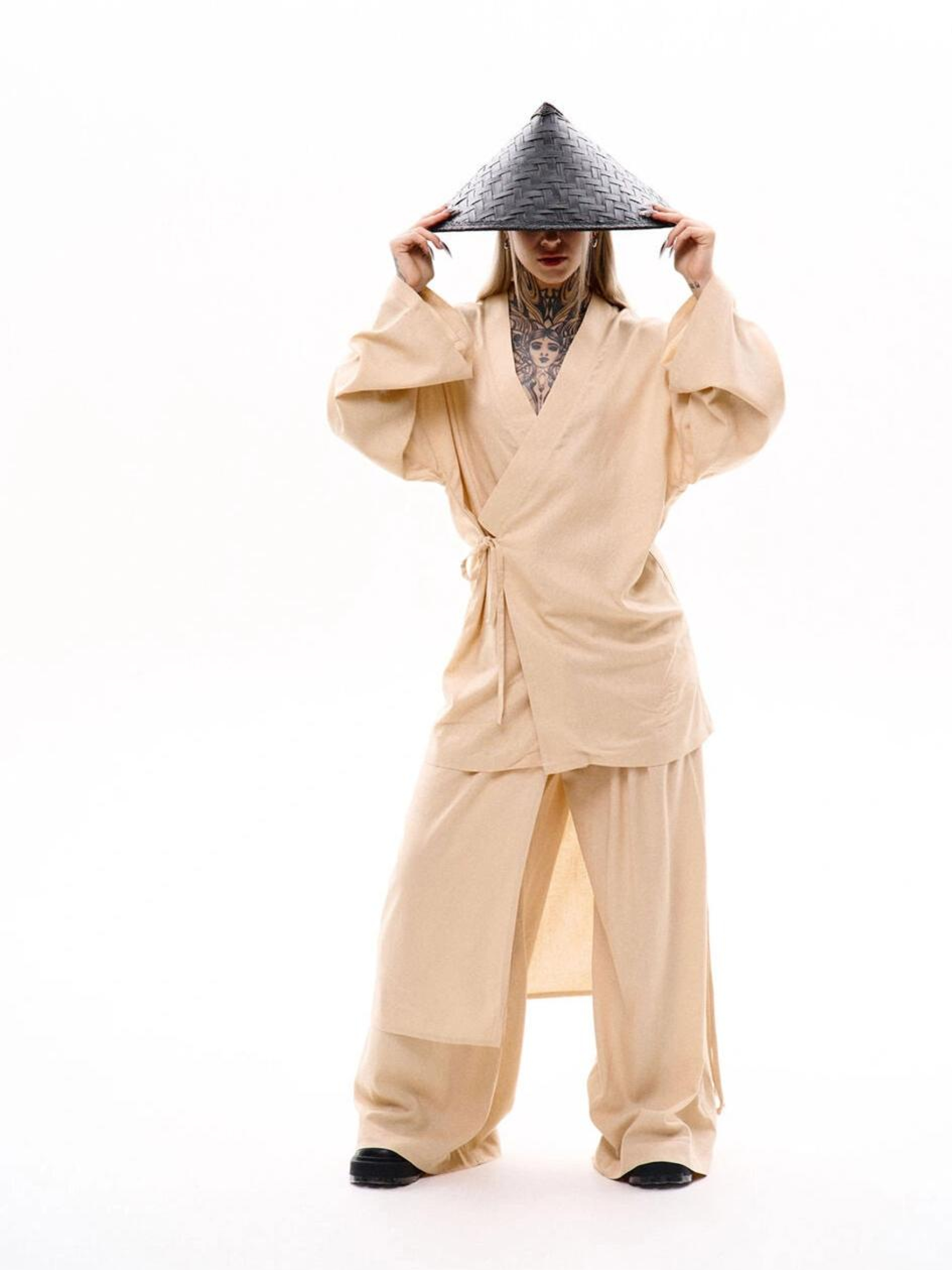 Состав ткани: 53% лен, 47% хлопок. Описание материалов и фурнитуры: Натуральный лен – дышащий материал с приятной фактурой и высокой износостойкостью. Дополнительные вставки из дублерина обеспечивают форму и устойчивость конструкции изделия. Ключевые особенности модели: Кимоно оверсайз кроя, выполненное из льна, завязывается с помощью льняных завязок и сделано на запах. На спине размещается вышивка в японском стиле. Имеет длинный широкий рукав. Идеально сочетается с брюками Кадзуки. Рекомендации по уходу: Машинная стирка при макс. 30 ºC Нельзя использовать щелочные средства / отбеливатель Глажка при макс. 110 ºC Не использовать сушилку