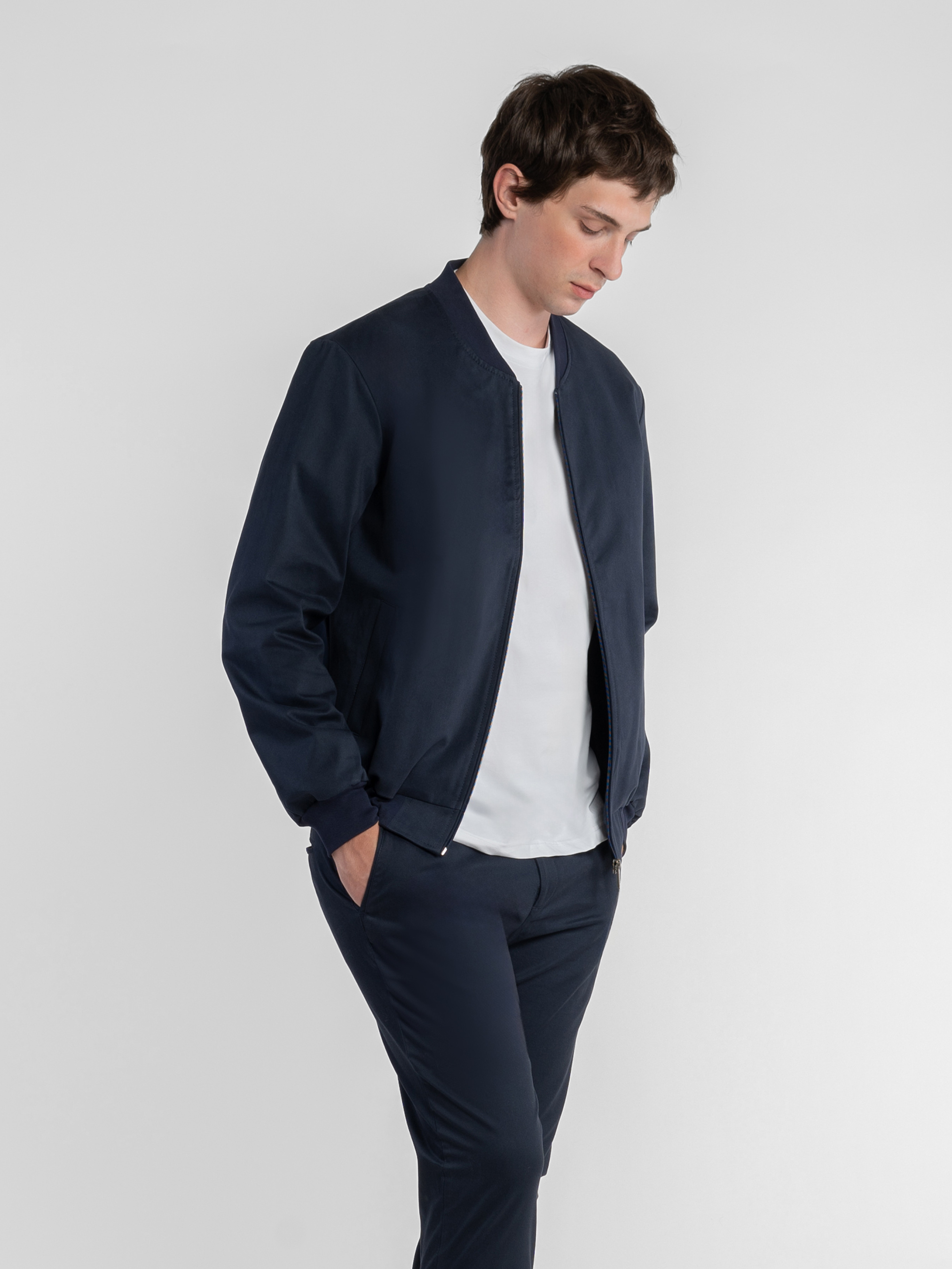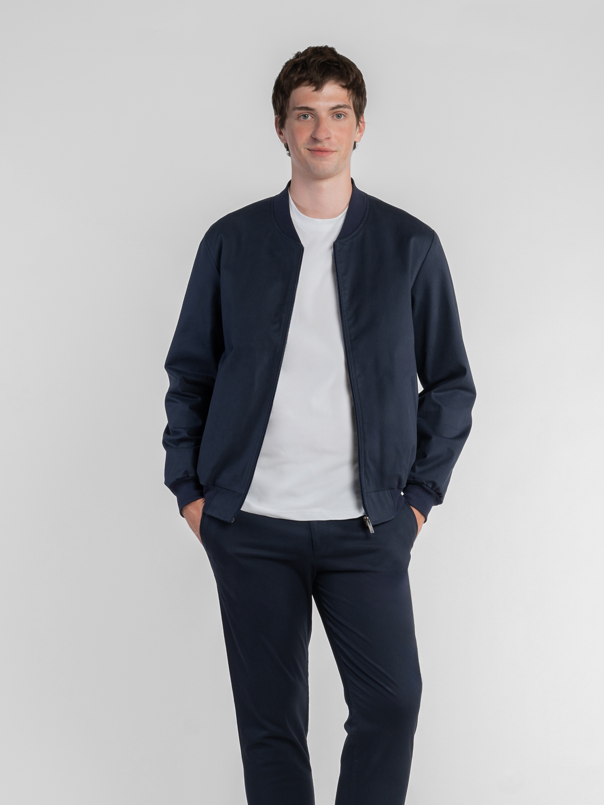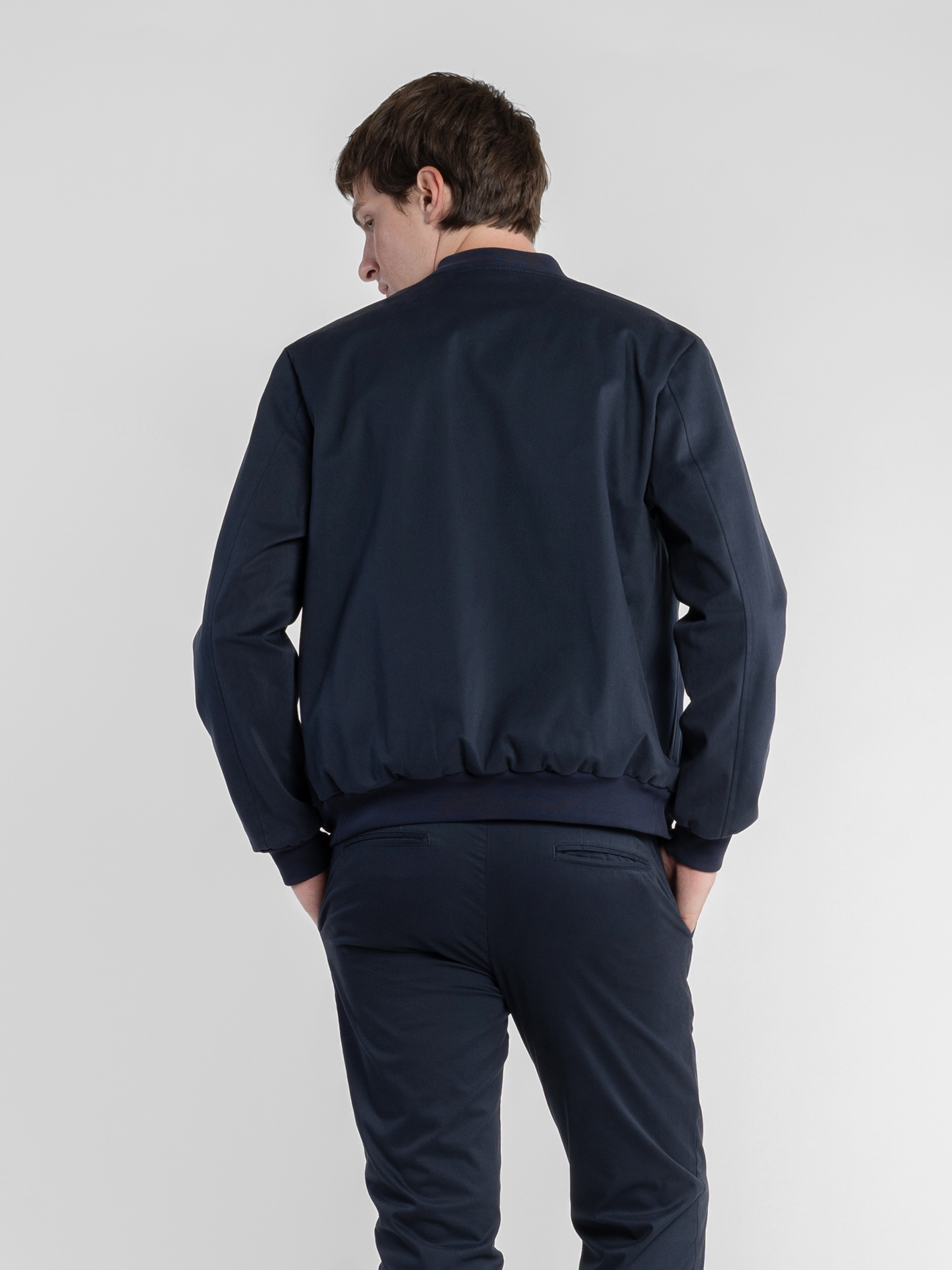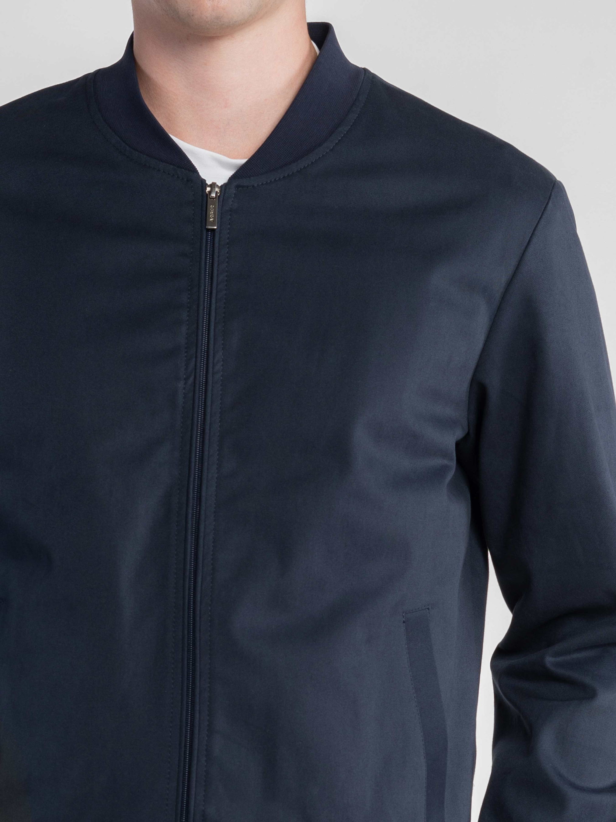 Мужской бомбер Arber темно-синего цвета создан из натурального хлопка с небольшим добавлением эластана для комфорта и свободы движений. Мягкая ткань с деликатным «эффектом замши» создает изысканную текстуру и приятные тактильные ощущения. Лаконичная застежка-молния, аккуратные прорезные карманы и эластичные детали на воротнике, манжетах и по низу формируют современный силуэт. Универсальный дизайн позволяет легко сочетать куртку с образами в стиле smart casual. Модель на фото в размере 48. Рост: 188 см. Параметры: 113/93/97