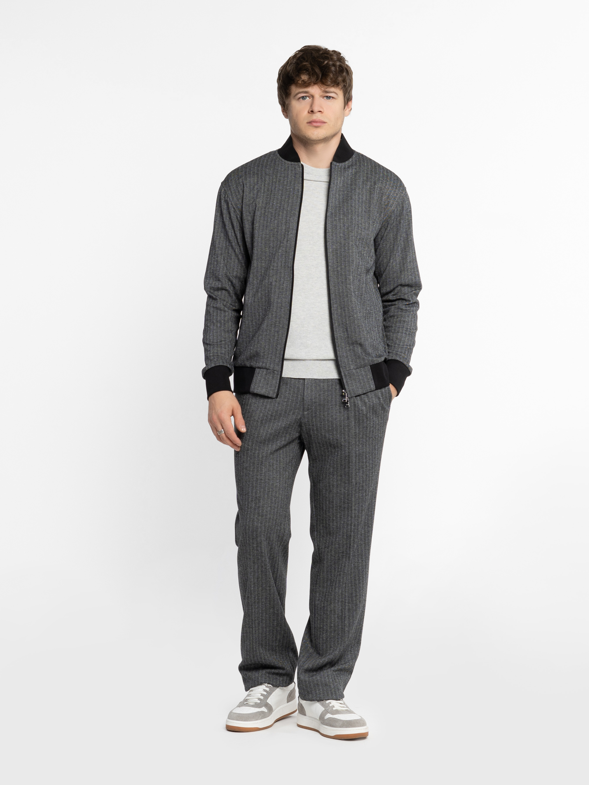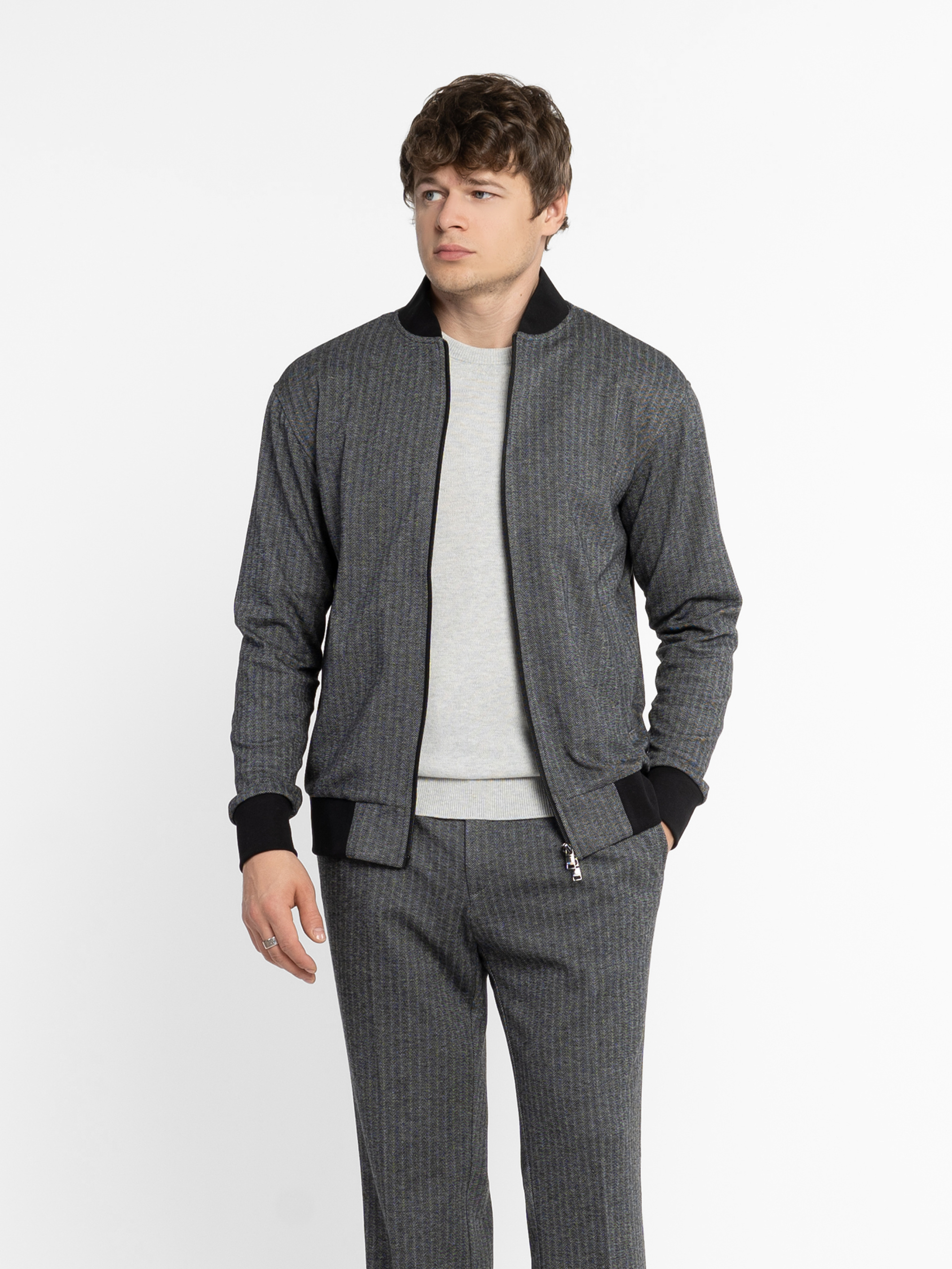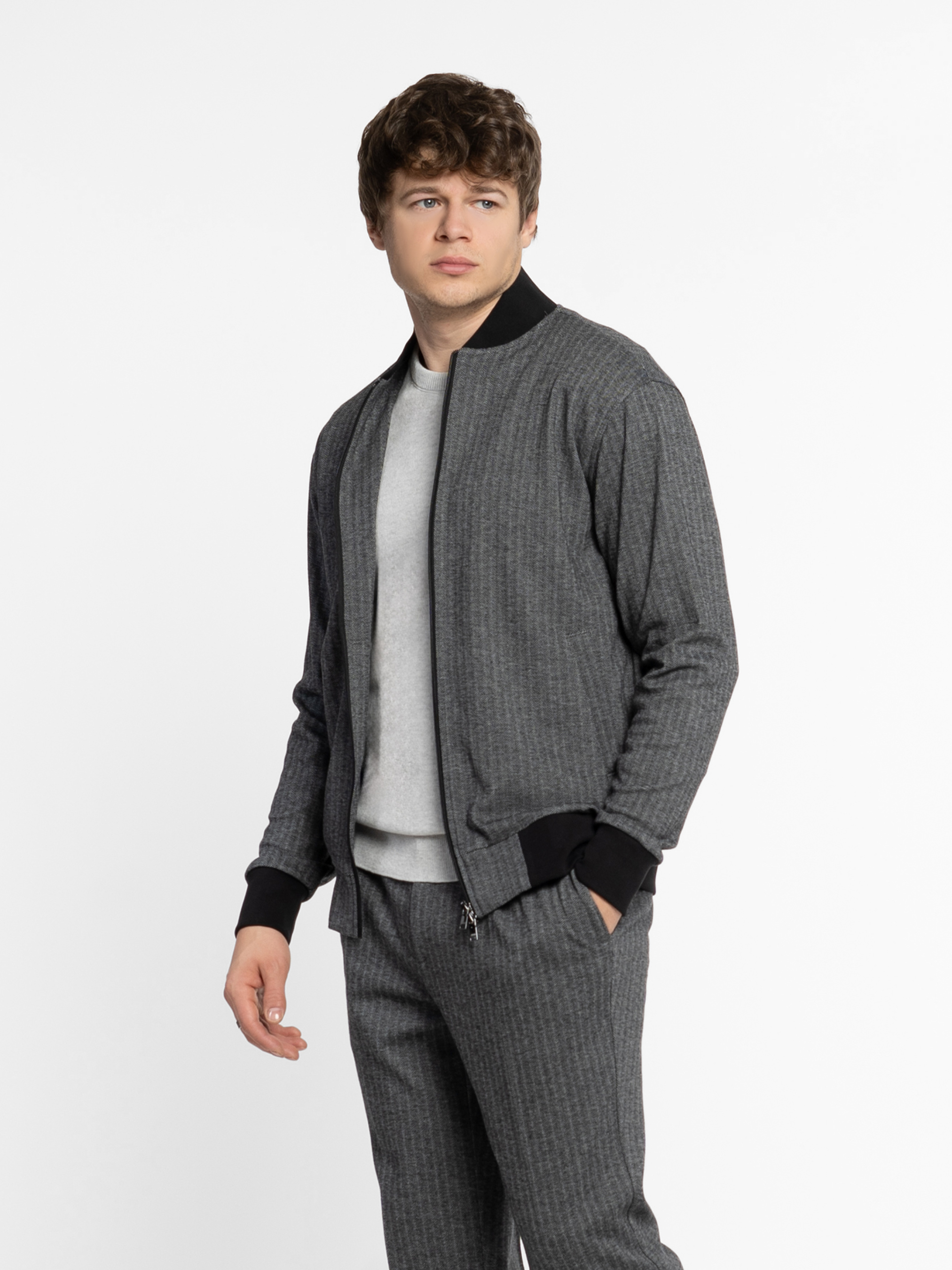 Мужской серый бомбер Arber из эластичного трикотажа на основе хлопка и вискозы. Мягкая, приятная на ощупь ткань дышит, не мнется, устойчива к загрязнениям и обеспечивает свободу движений. Застежка на молнию, два кармана и эластичные вставки на манжетах, воротнике и по низу добавляют комфорта и динамики образу. Идеально сочетается с брюками M01.04.12.531 из той же ткани для стильного комплекта. Модель на фото: размер 48, рост 180 см, параметры 103/85/97.