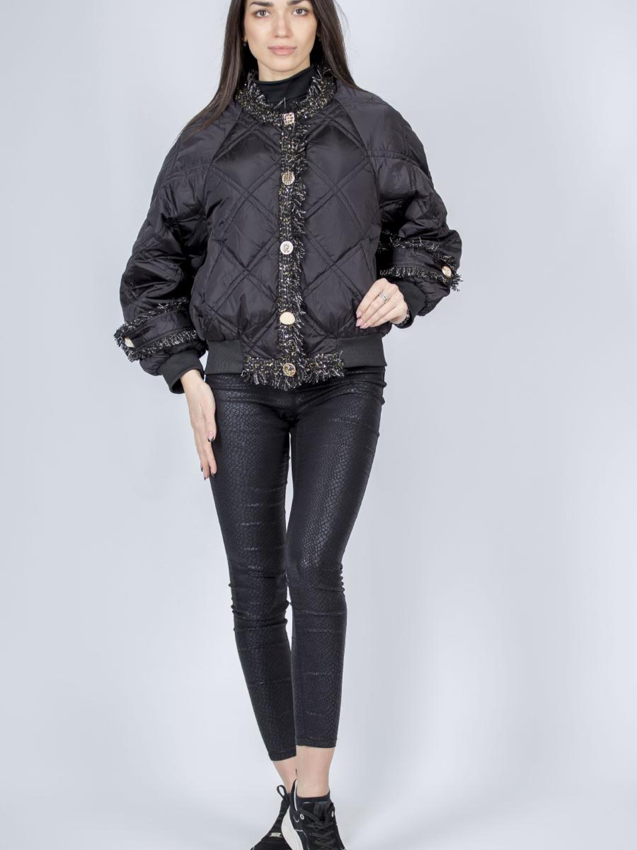 Представляем стильную женскую куртку для осенне-весеннего сезона, которая удачно сочетает элегантность и практичность. Эта куртка выполнена из однотонной ткани, что придает ей изысканный вид и делает ее идеальной для casual и нарядного стиля. Подкладка изготовлена из полиэстера, а синтепон в качестве утеплителя обеспечивает комфорт и сохранение тепла в прохладные дни. Втачные манжеты и длинные рукава делают эту модель универсальной, а круглый вырез воротника придает изяществу. Детали в виде нашивок, стеганного узора и хлястика придают особый шарм. Куртка застегивается на кнопки и оснащена удобными втачными карманами, придающими функциональность. Идеальный выбор для тех, кто ценит стиль и комфорт! Доступна в элегантном черном цвете.