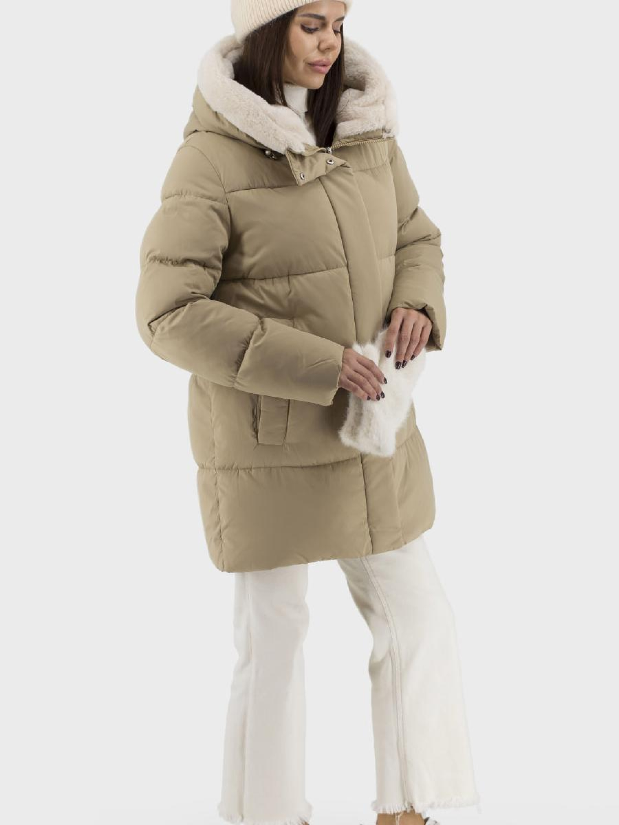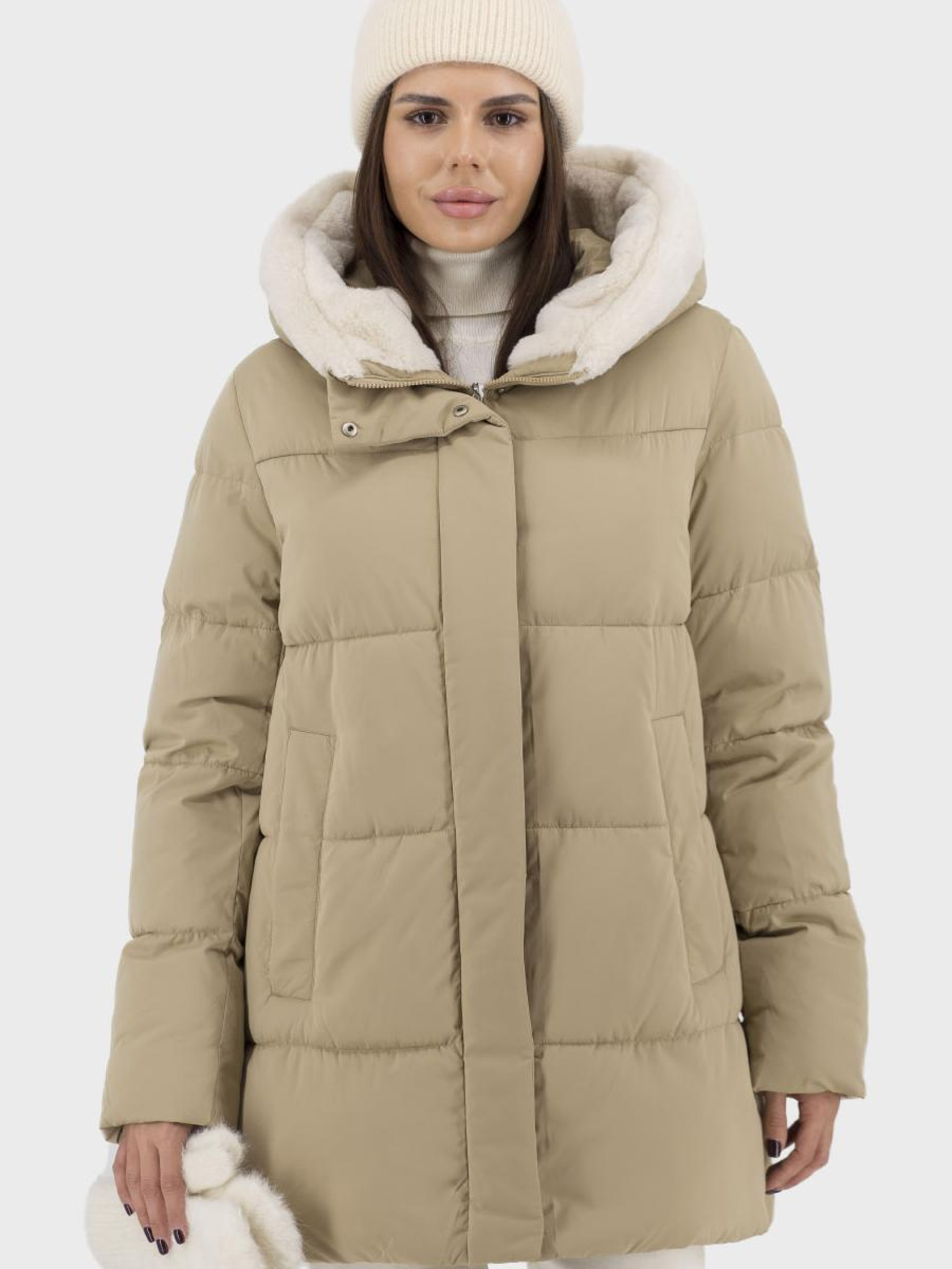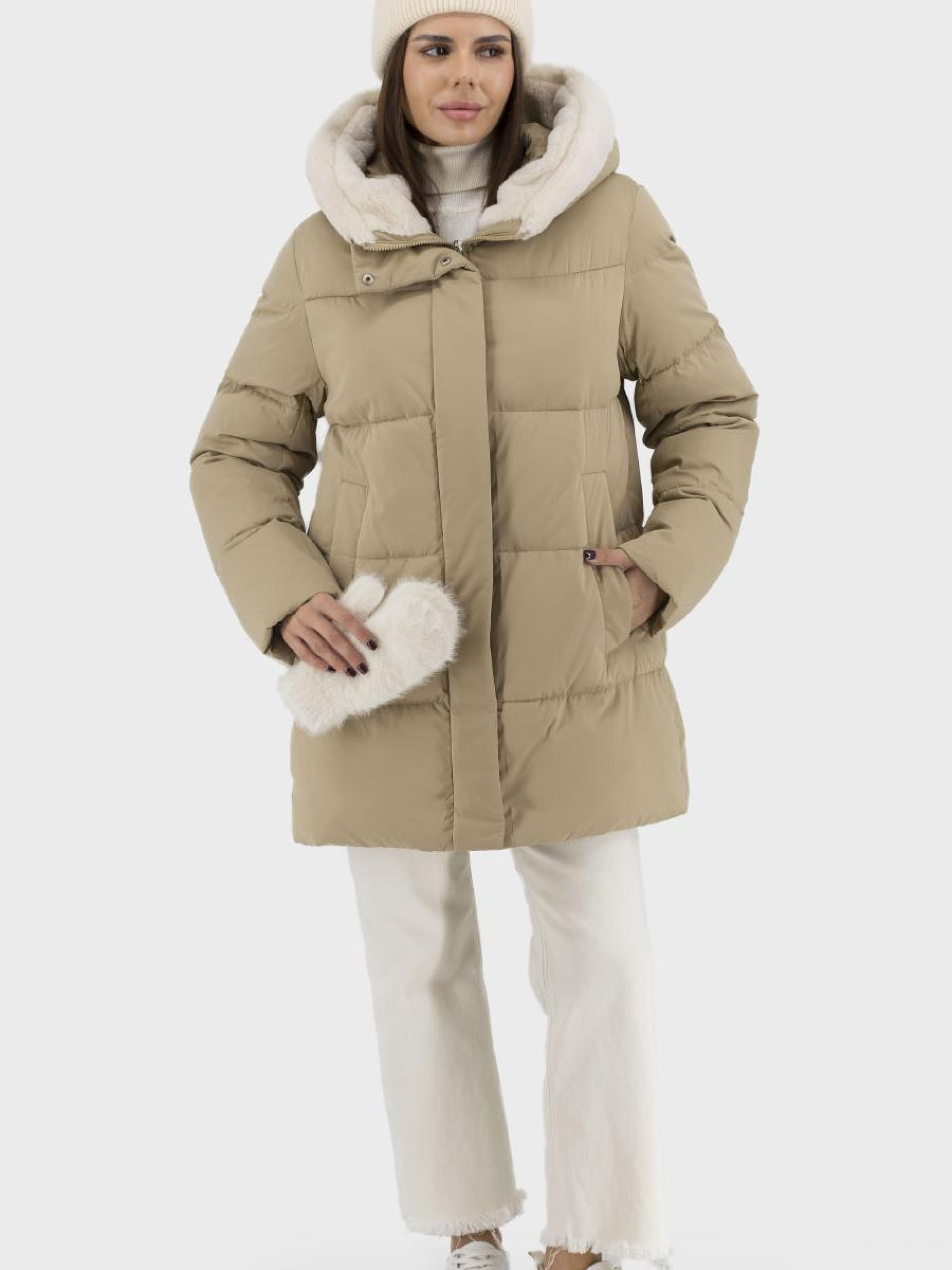 Роскошный женский пуховик для зимы, предназначенный для тех, кто ценит стиль и комфорт в каждой детали. Изготовленный из стильного двухцветного полиэстера с утеплителем из биопуха, этот пуховик обеспечивает отличную защиту от холода. Мягкий искусственный мех, украшающий капюшон, придает элегантность и теплоту. Прямой силуэт и длинные втачные рукава делают его идеальным для повседневного casual-стиля. Пуховик оснащен втачными карманами на добавляющих практичности кнопках, а также молнией и кнопками для надежного застегивания. Доступный в благородном бежевом цвете. Незаменимый выбор для женщин.