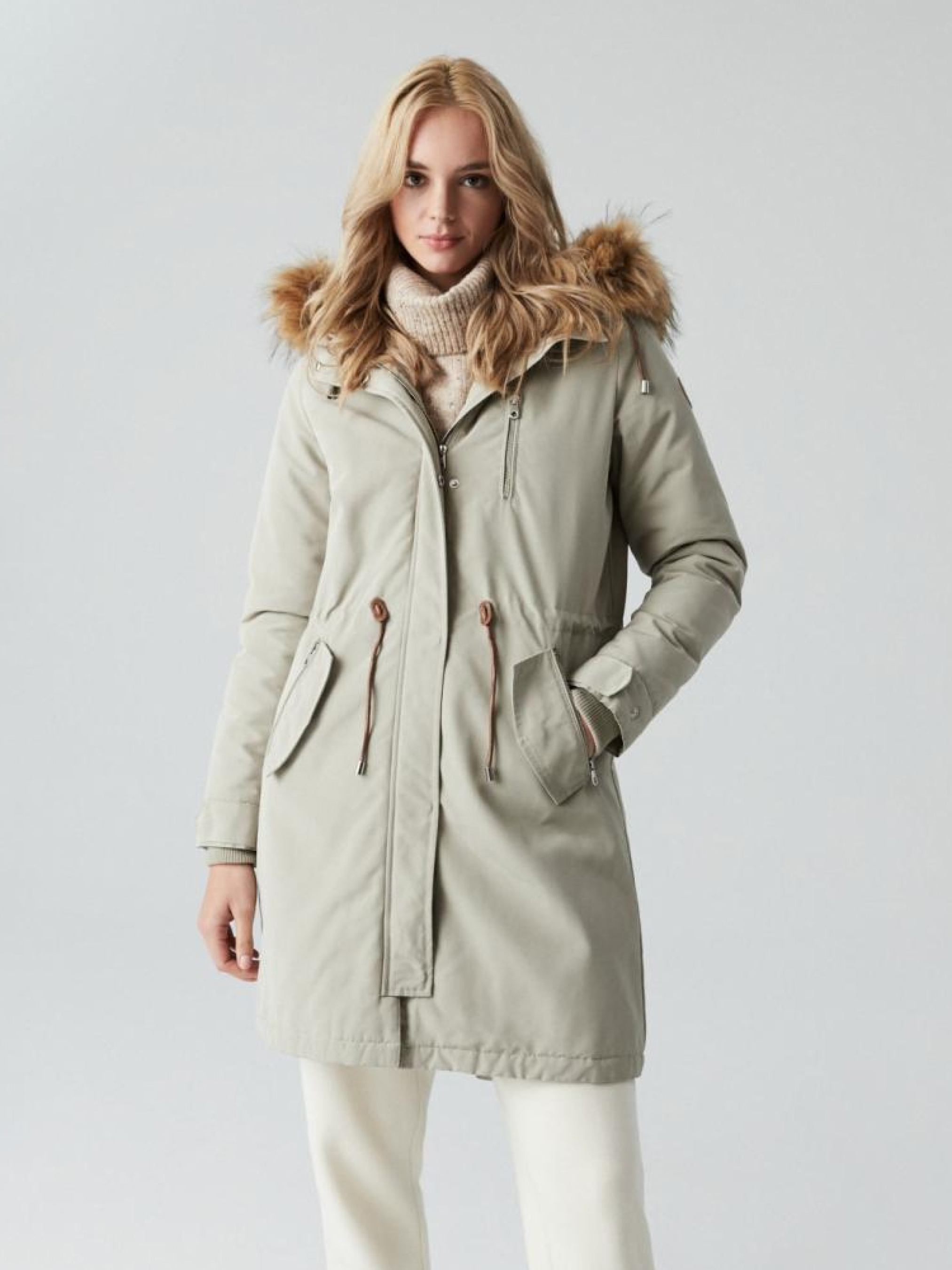 Классическая удлиненная парка слегка приталенного кроя, утепленная синтепоном. Капюшон со съемным эффектным синтетическим мехом защищает от дождя и ветра. Ширина куртки регулируется по талии и на манжетах. ОСНОВНЫЕ ХАРАКТЕРИСТИКИ: - эффектная наружная ткань со слегка блестящей поверхностью, - утепленная внутренняя часть со стеганной подкладкой, - универсальный крой, позволяющий создавать разные стили, - регулируемая талия, - встроенный капюшон со съемной отделкой из синтетического меха, - 2 боковых кармана с клапаном и застежка на молнию, - 1 вертикальный нагрудный карман, - металлическая двусторонняя застежка-молния с дополнительным верхним клапаном, - регулируемые манжеты, - декоративные элементы из кожзама: завязки, стопоры, нашивки и подборты вдоль молний, - обработанная подкладка. Сезон: осень/зима. Состав: 100% полиэстер. Уход: - стирка при максимум 30 °С - не отбеливать - не сушить в сушильной машине - не гладить - не химчистка Размер на модели – S Рост модели – 180 см